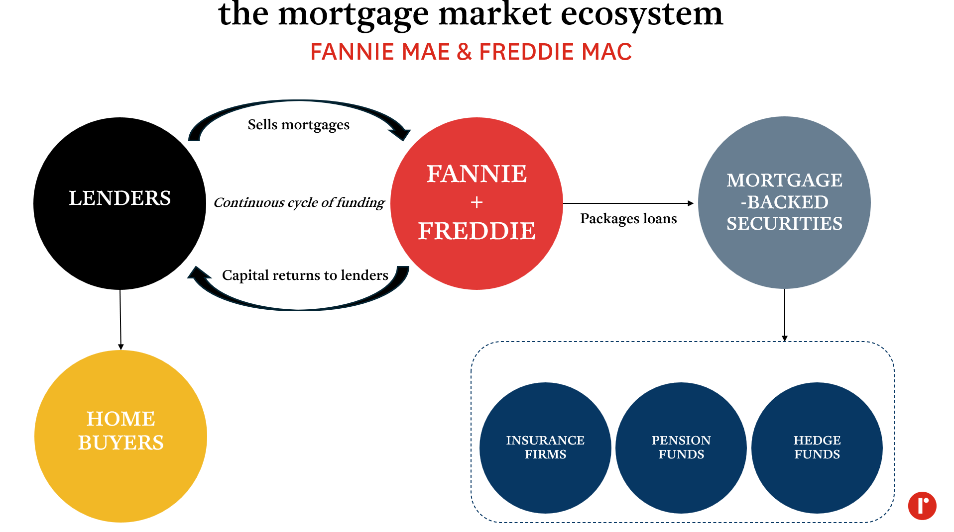 Equally important is their guarantee function. When packaging these mortgages into securities for investors, Fannie and Freddie guarantee the timely payment of principal and interest—even if homeowners default. This backing increases the appeal and demand of the securities by reducing risk for investors, which ultimately keeps mortgage rates lower than they otherwise would be.