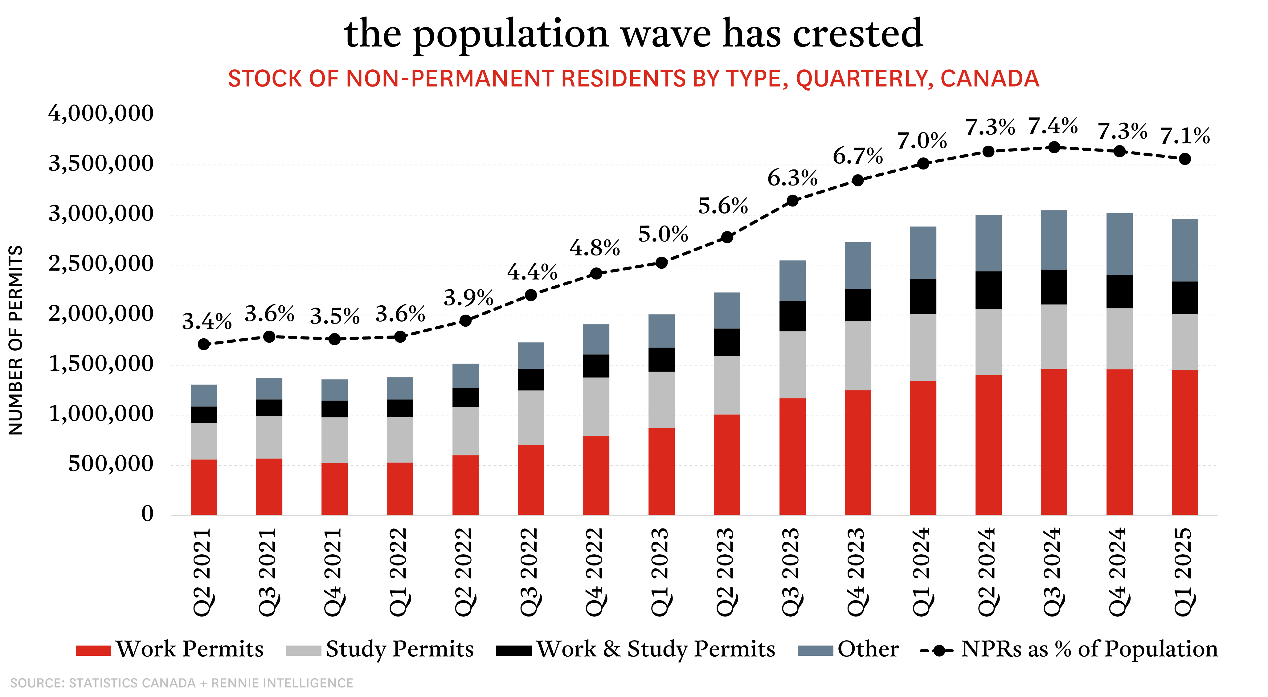 Driving this turnaround is the same group that drove population growth to record highs mere quarters ago: non-permanent residents, which includes foreign students, temporary foreign workers, and asylum seekers. Back in Q2 2021 there were 1.31 million non-permanent residents in Canada, equivalent 3.4% of the national population. By Q3 2024 those numbers had climbed to over 3 million and 7.4%. After a major shift in federal immigration policy last year, Canada saw a net outflow of 28,300 non-permanent residents in Q4 2024, followed by a larger 61,100 person net outflow in the first three months of this year. As a result, the stock of non-permanent residents fell to 2.96 million at the end of Q1 2025, equivalent to 7.1% of the national population.