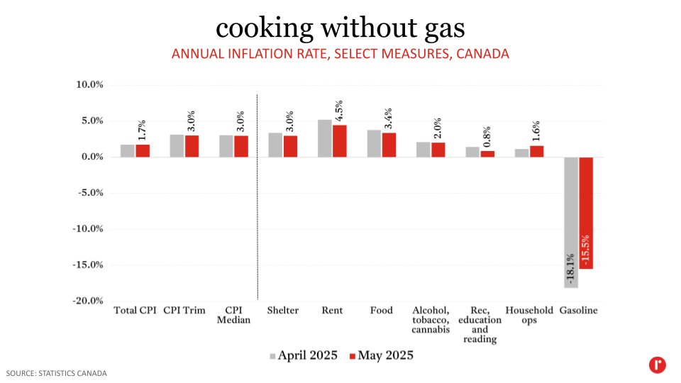 Today’s release of Consumer Price Index (CPI) data from Statistics Canada revealed no change in headline inflation in May versus April, at 1.7%. The removal of the consumer carbon tax in April has pulled the overall rate of inflation lower in each of the past two months—as it will until next April owing to the fact that inflation is calculated on a year-over-year basis. That said, the annual change in gasoline prices was smaller in May (-15.5%) than in April (-18.1%), and price growth slowed in other segments of the CPI.