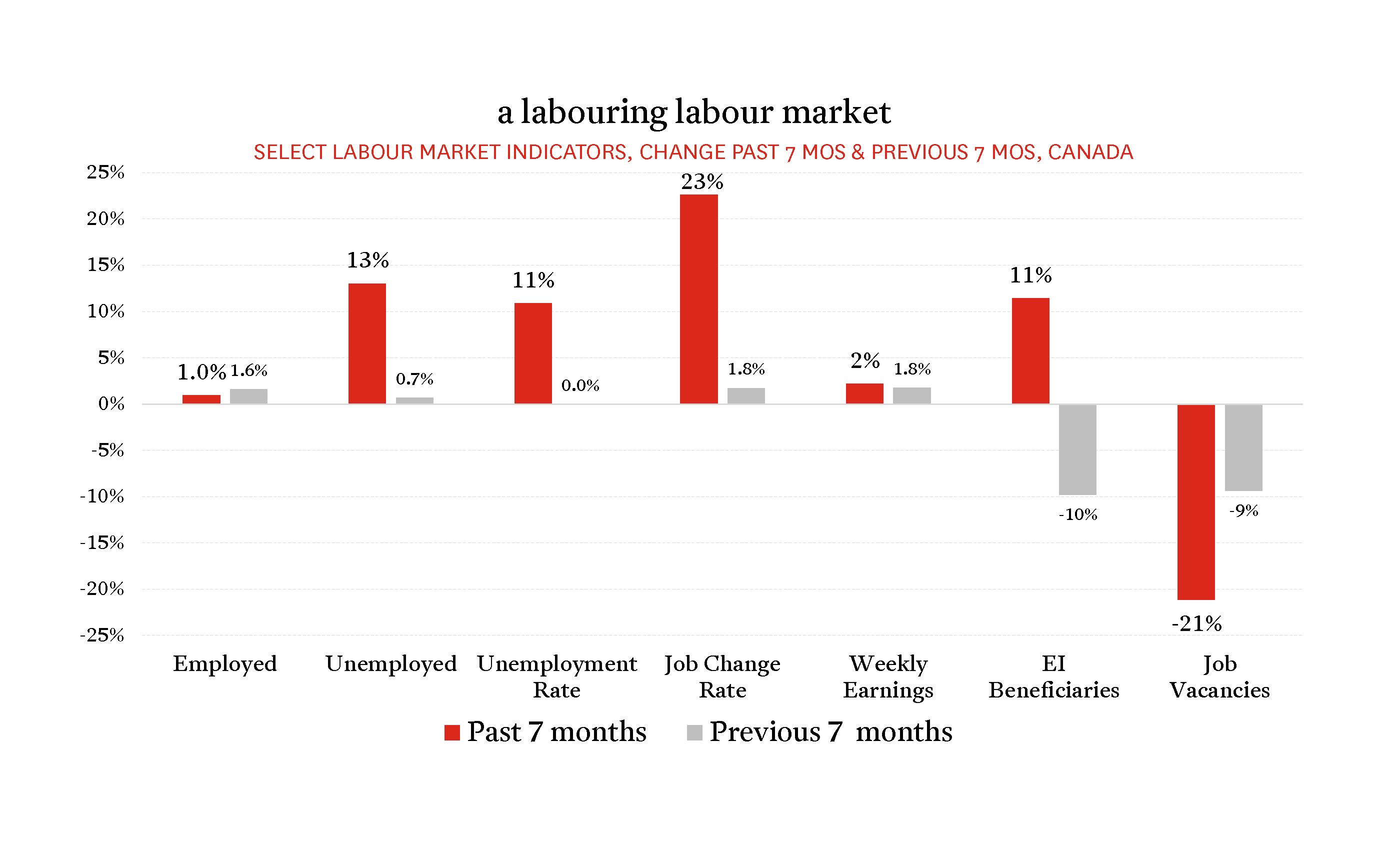 If we compare the last seven months with the seven-month span that preceded it we see a labour market responding as you’d expect to a high interest rate environment. Why seven months? That’s how much time has passed since June 2023, when the Bank of Canada temporarily resumed its rate-hiking after a multi-month hiatus.