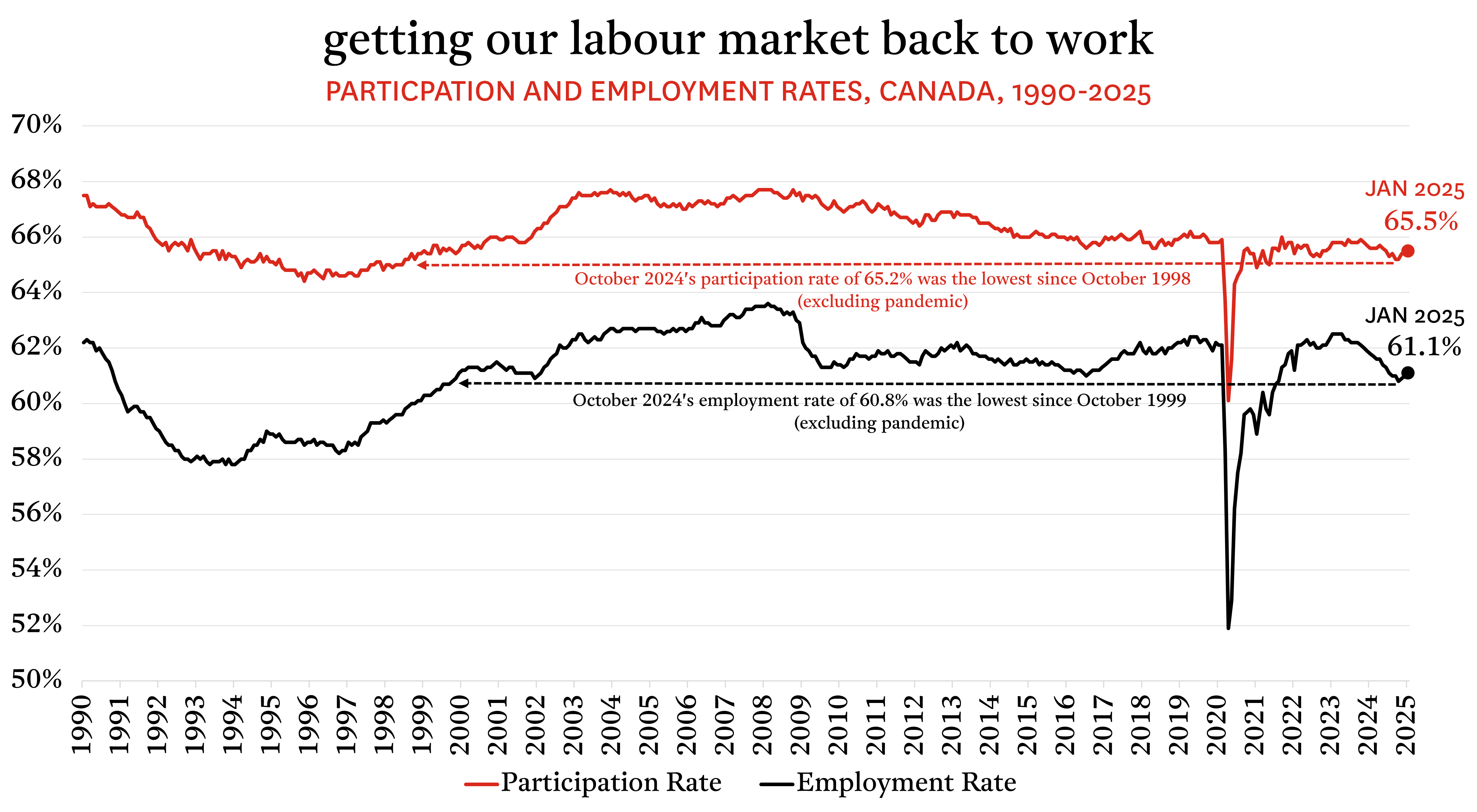 These developments are encouraging when considering the broader context of Canada’s labour market. As recent as October, both the employment and participation rates had fallen to their lowest levels in almost three decades (excluding pandemic-related distortions). This recent period of softness was largely a function of rapid growth in Canada’s working age population, driven by record international migration, and a rate of job growth that couldn’t keep up. Since mid-2022, Canada’s working age population has increased by about 2.6 million while the labour force has increased by 1.7 million and total employment by 1.2 million.