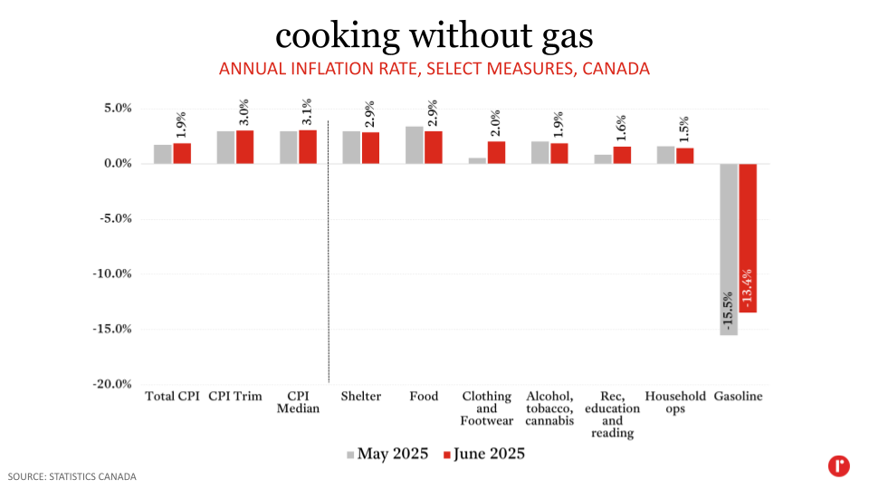 Shelter inflation slowed further in June, and fell to its lowest level in more than four years. Food, household operations, and alcoholic beverages, tobacco products and recreational cannabis categories likewise all saw their annual inflation rate decline in June. Notably, clothing and footwear, which relies heavily on international trade, saw its inflation rate increase last month, as did recreation, education, and reading, which includes some goods from the United States on which Canada has placed counter-tariffs (like sports equipment and audio visual equipment).
