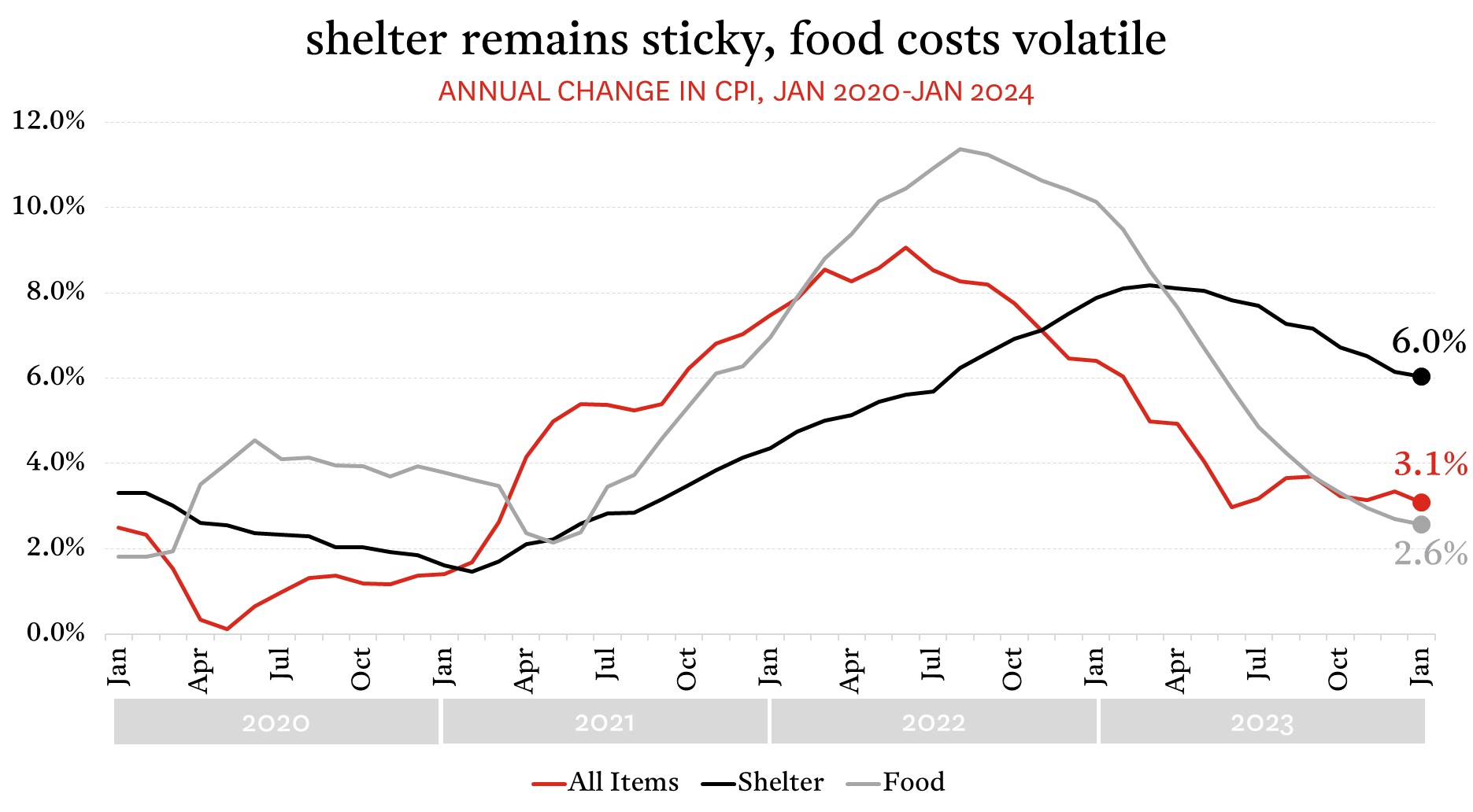 Rising more than expected in January, CPI increased 0.3% from December, pushing it 3.1% higher than this time last year. Shelter costs, which comprise approximately one-third of the CPI by weight, rose 0.6% compared to last month while food climbed 0.4%—both being largely responsible for the hotter-than-anticipated headline inflation readings. (Compared to last year, shelter and food costs were up 6.0% and 2.6% respectively.)