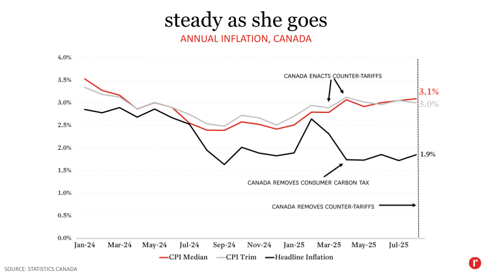 It appears that growth in core measures of inflation has moderated in recent months, as evidenced by the 6-month annualized calculations (2.8% for both CPI Trim & Median) and the 3-month annualized calculations (2.6% for CPI Median & 2.4% for CPI Trim). One contributor to rising prices in April was likely Canada’s implementation of counter-tariffs on the United States in March and April, which were otherwise masked by falling energy prices. Prices for some goods that were tariffed rose on a month-to-month basis in April, including household appliances (+1.2%), household tools (+0.7%), and audio equipment (+0.7%). Canada has since (as of September 1st) removed all counter-tariffs for CUSMA-compliant goods with the exception of steel, aluminum, and autos. To the extent that the counter-tariffs had put upward pressure on prices here in Canada, there is potential for price reductions in the next release of the CPI as counter-tariffs are lifted.