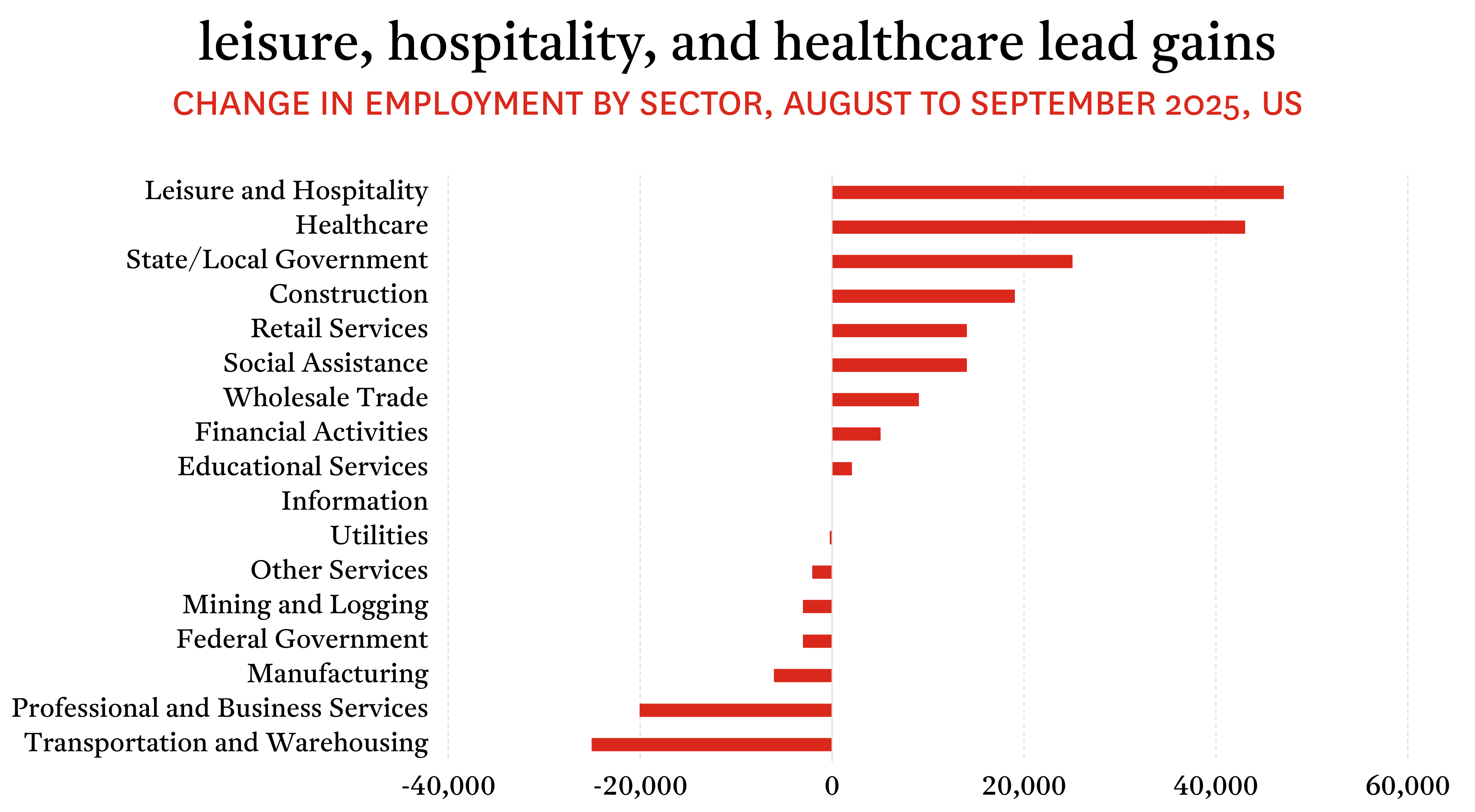 The strongest gains in hiring came from sectors that have already been steadily expanding in recent years. Leisure and hospitality led the increases, buoyed by affluent households that continue to spend robustly on premium experiences and travel. Healthcare followed closely, sustained by demographic demand as an aging American population increasingly uses medical services. Losses, meanwhile, were concentrated in manufacturing, transportation and warehousing, extending what has been a consistent soft spot in recent months.