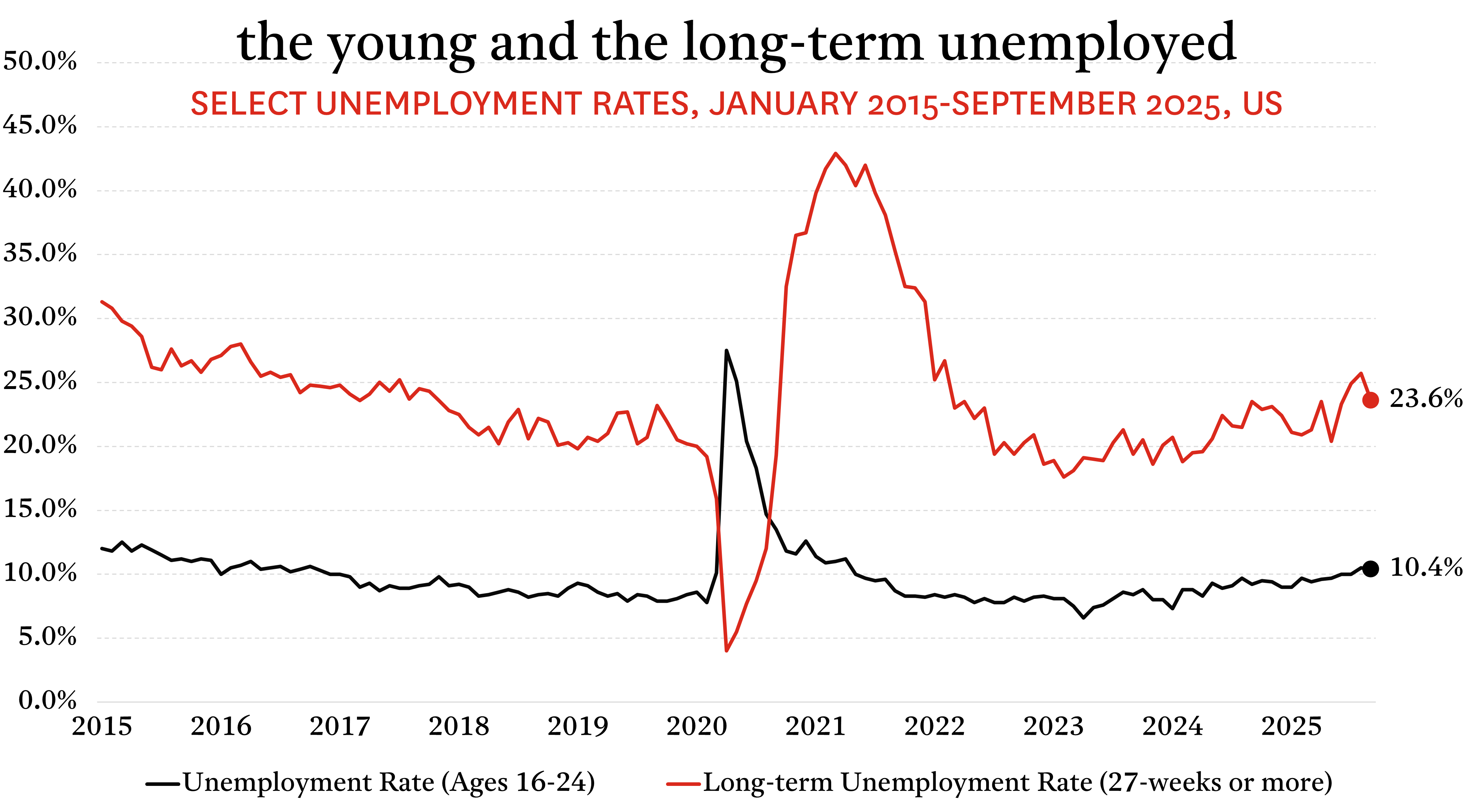 But strain is already apparent in various corners of the labor market. The share of long-term unemployed (those out of a job for longer than six months), while slightly lower than the 25.7% in August, remained historically elevated at 23.6%. Youth unemployment also eased modestly to 10.4% from 10.5% in August, but it is up sharply from 9.0% in January. Both of these metrics now sit at their highest levels since 2016, excluding the pandemic period. Together, they point to a labor market that is not yet shedding workers at scale through layoffs, but is struggling to absorb new or displaced workers.