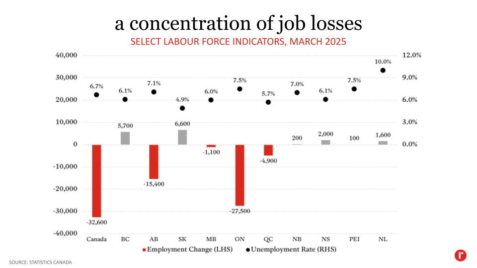 Canada shed almost 33,000 jobs in March, which was the single largest monthly decline in national employment since January 2022 (when public health measures related to a wave of COVID-19 caused a temporary spike in unemployment). This follows four months of relative labour market stability that had resulted in job gains and a falling unemployment rate. The national unemployment rate rose marginally last month, to 6.7%, from 6.6% in February.