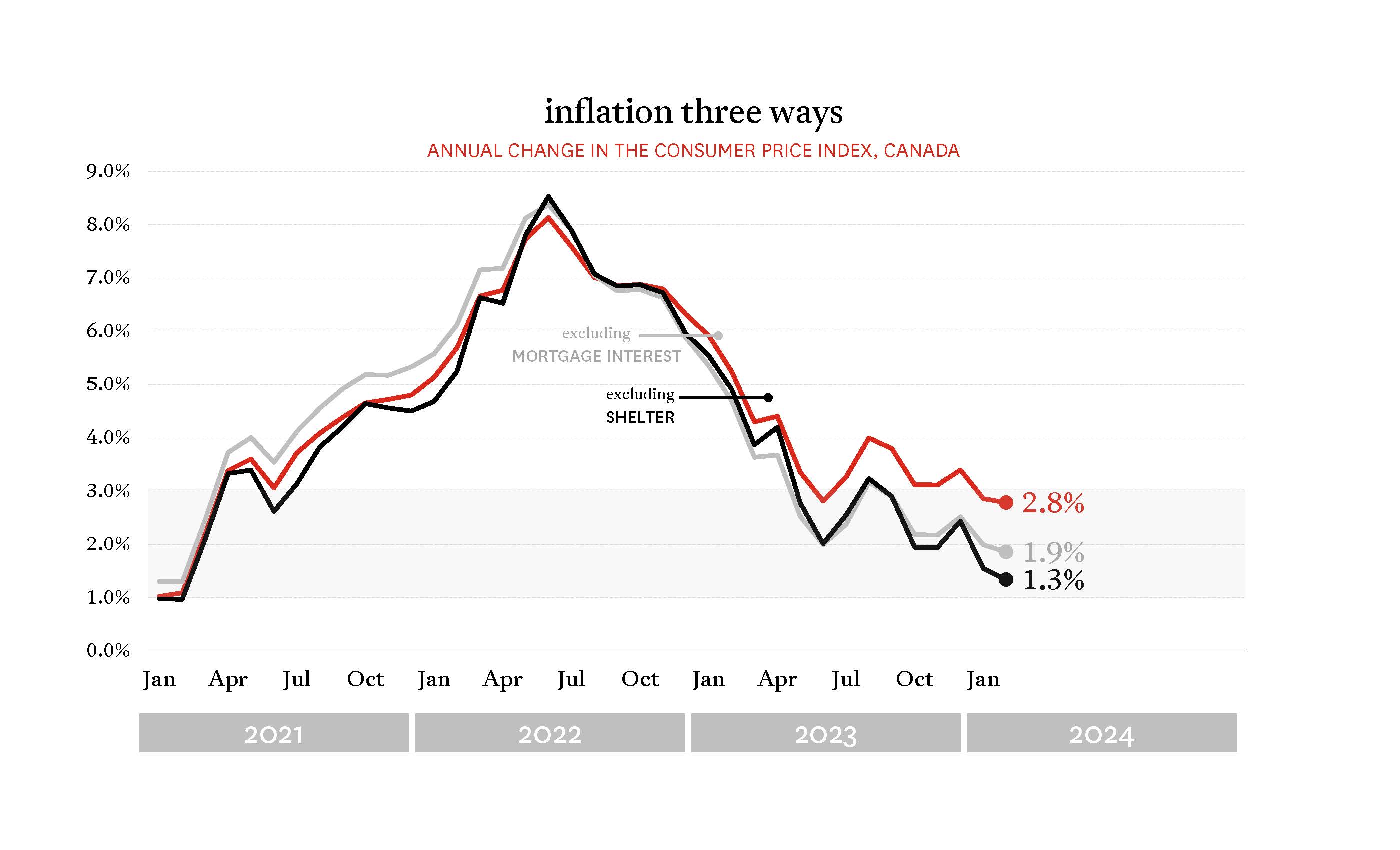 With another release of Consumer Price Index data from Statistics Canada bringing another decrease in inflation (to 2.8% in February), all eyes turn back to the Bank of Canada ahead of its next interest rate announcement. Not only has headline inflation been back inside the Bank’s target range of 1-3% for two consecutive months, but when you strip out the mortgage interest component of the CPI (which is running hot as a direct result of the Bank’s restrictive monetary policy) the rest of the CPI is actually below the 2% target.