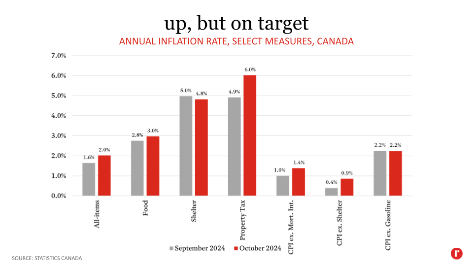 With today’s release of the latest Consumer Price Index (CPI) data from Statistics Canada, the overall rate of inflation saw a directional change, increasing from 1.6% in September to 2.0% in October, right on the Bank of Canada’s target. While this was the first month-to-month increase in the headline rate since May, the October CPI data show that inflation is under control and should pave the way for another interest rate cut from the Bank on December 11th.