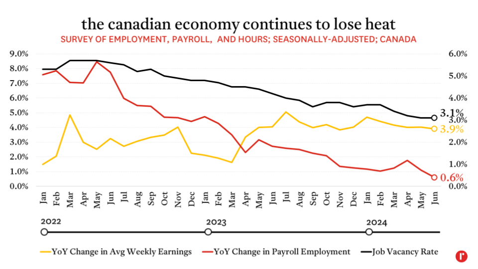 Wages continue to buck other labour market trends, with the year-over-year gain in average weekly earnings (for both salaried and hourly employees) rising at a 3.9% clip in June—50% faster than the average of the March 2017 to March 2020 period, but down from both 4.0% in May and its post-pandemic peak of 5.1% in July 2023. As inflation moderates (it currently sits at 2.5%), this is a good thing for workers, but also something for the central bank to keep its eye on as it adjusts monetary policy.