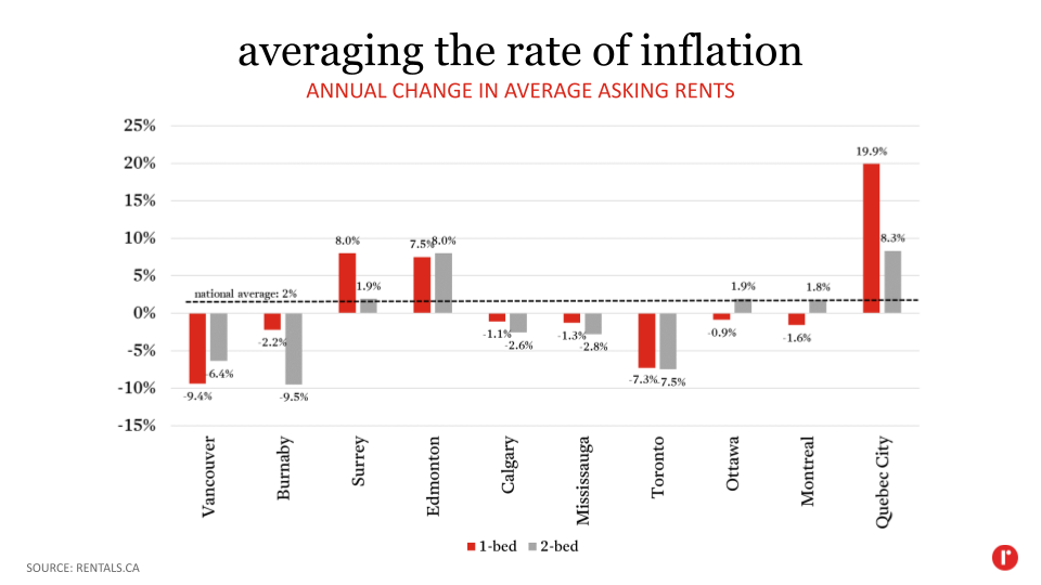With this in mind, we also looked at rentals.ca, the listings platform that regularly reports on rental rates in 35 Canadian municipalities across seven provinces. This data source, too, shows decreasing rental rates in Vancouver, Calgary, and Toronto, however, it also shows increasing rents in other cities including Edmonton and Quebec City. Crucially, the average year-over-year change in rents, per the rental.ca platform, is just 2% for both 1-bed and 2-bed homes, a far cry from the 9% increase in the CPI.