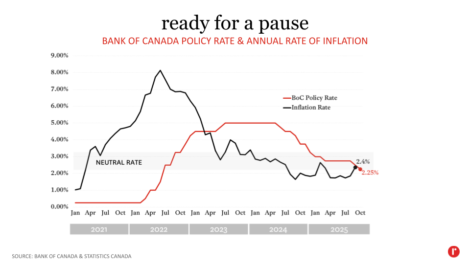 The Bank also signalled that this is likely the end of the current interest rate-cutting cycle. In its release, the Bank noted that “if inflation and economic activity evolve broadly in line with the October projection, Governing Council sees the current policy rate at about the right level to keep inflation close to 2% while helping the economy through this period of structural adjustment.”