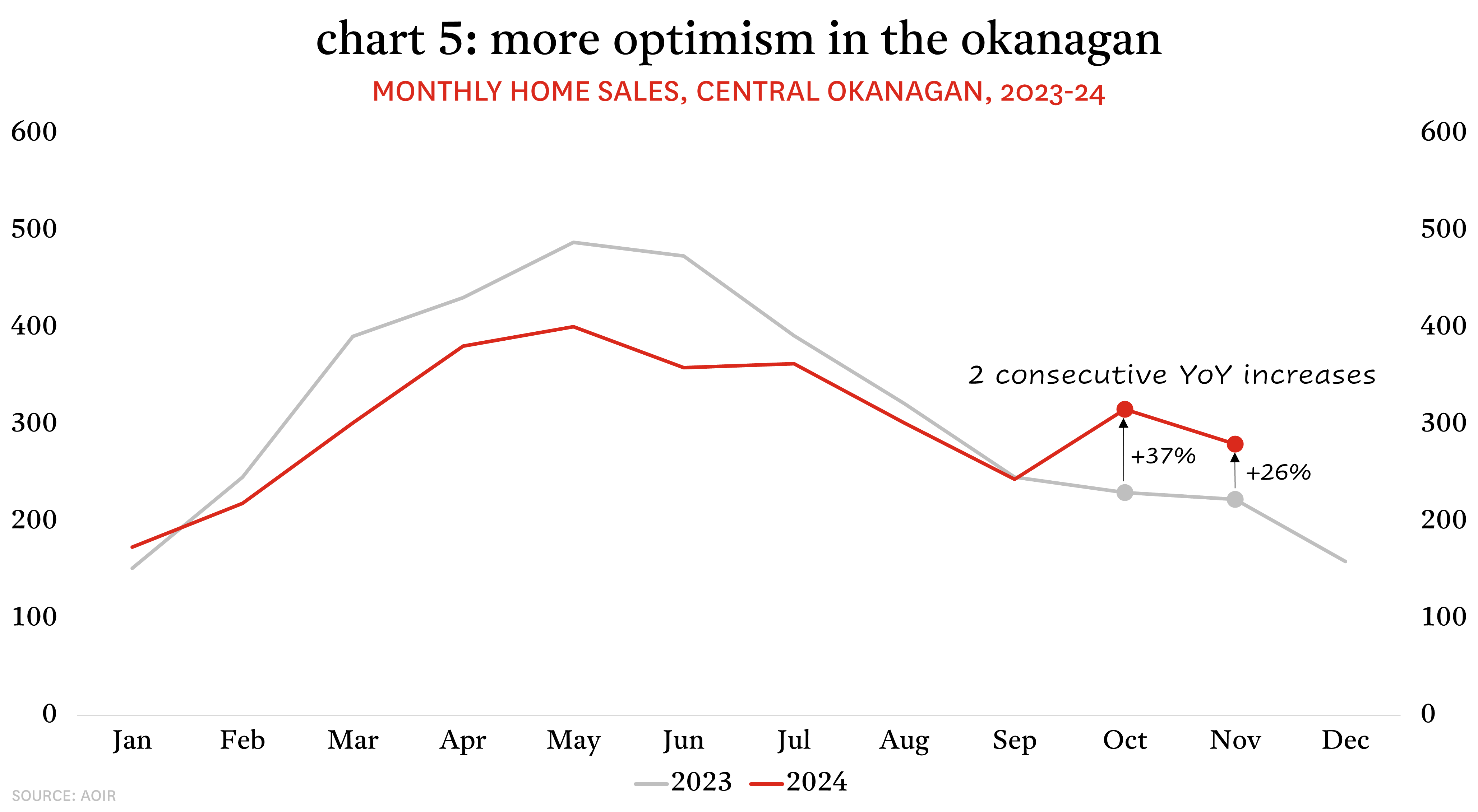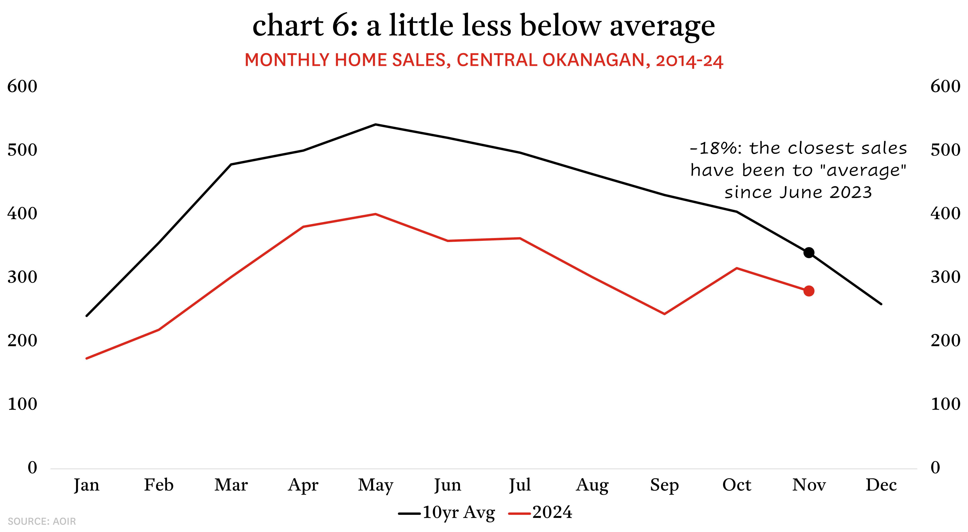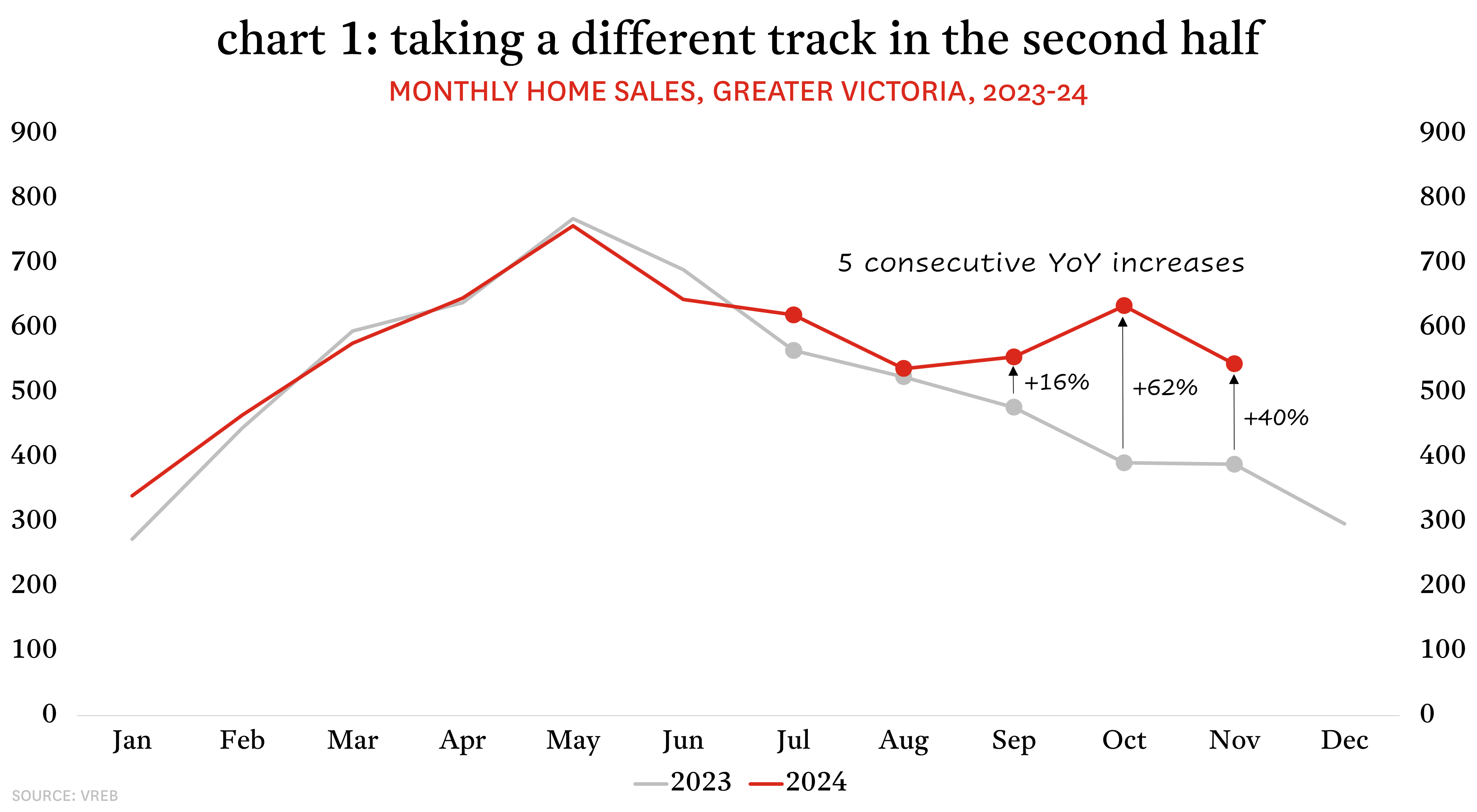 Nowhere has this effect been more apparent than in Victoria. Monthly sales through the first half of 2024 had largely moved in parallel with suppressed levels in 2023, but in the second half they have taken a decisively different track. As of the end of November, Victoria has seen five consecutive months of year-over-year sales increases, with the spread between this year and last year becoming more pronounced in the Fall. In October, sales saw their largest September-to-October increase in more than two decades and, as a result, were up 62% relative to October 2023. That momentum was carried into November with sales up 40% from the previous November.