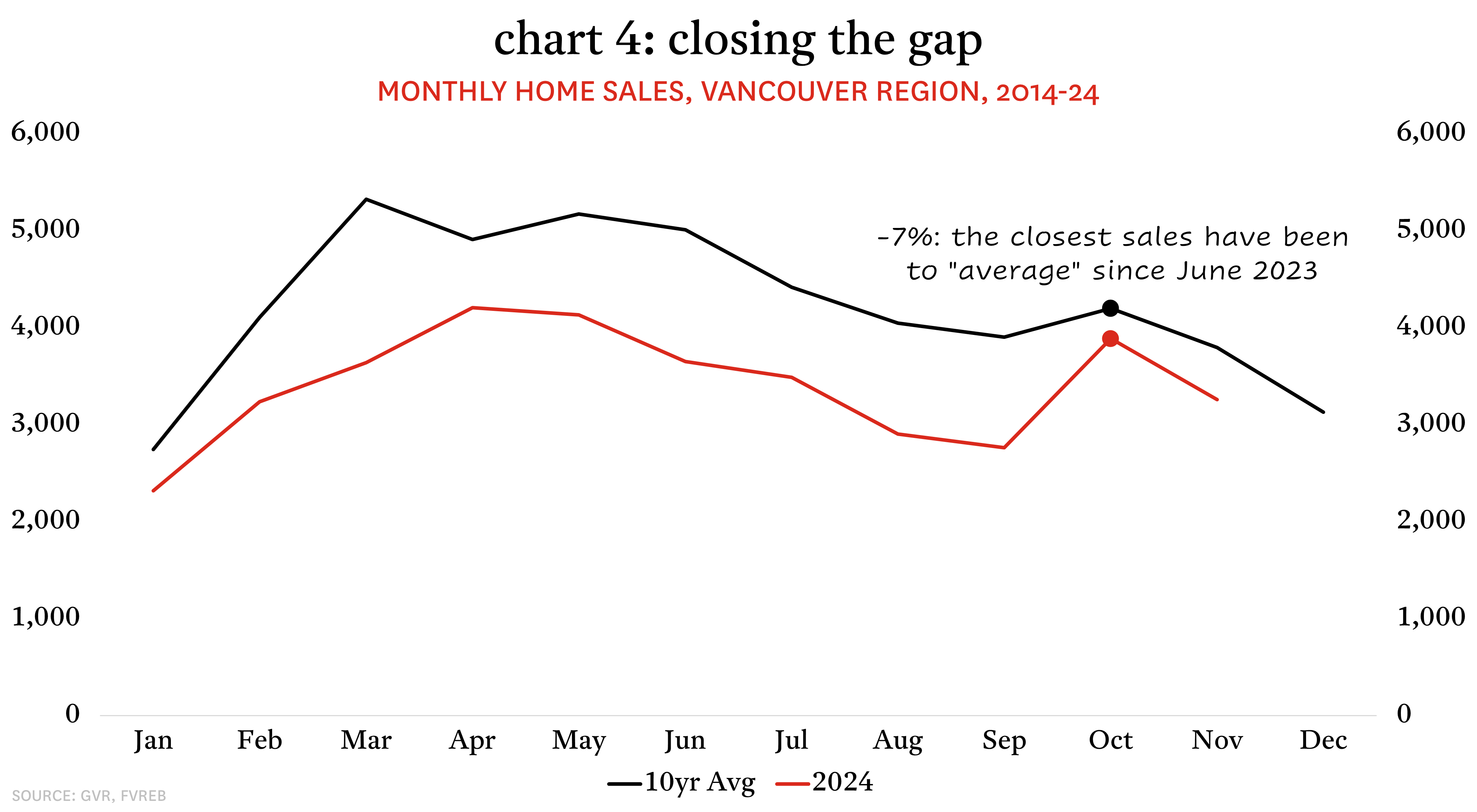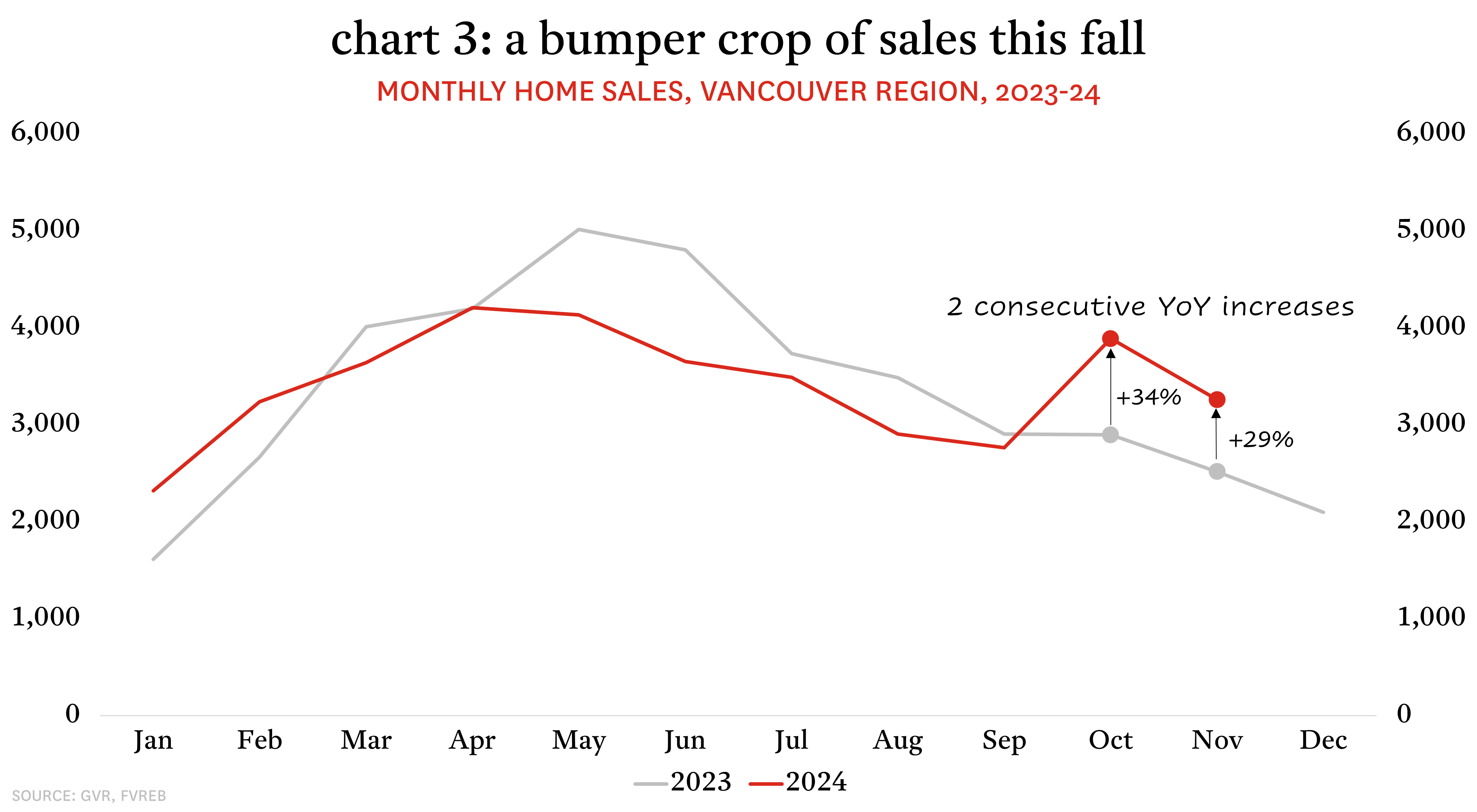 Sales in Vancouver have also taken a different trajectory this Fall, though the recovery has not been as prolonged as in Victoria. The shift began in earnest in October with sales spiking 41% month-over-month, which was more than five times greater than the typical 8% September-to-October increase. Like Victoria, this was also the largest September-to-October increase in more than two decades and translated into sales that were 34% higher than October 2023. The trend carried into November with sales up 29% relative to the previous November, the second consecutive year-over-year increase.