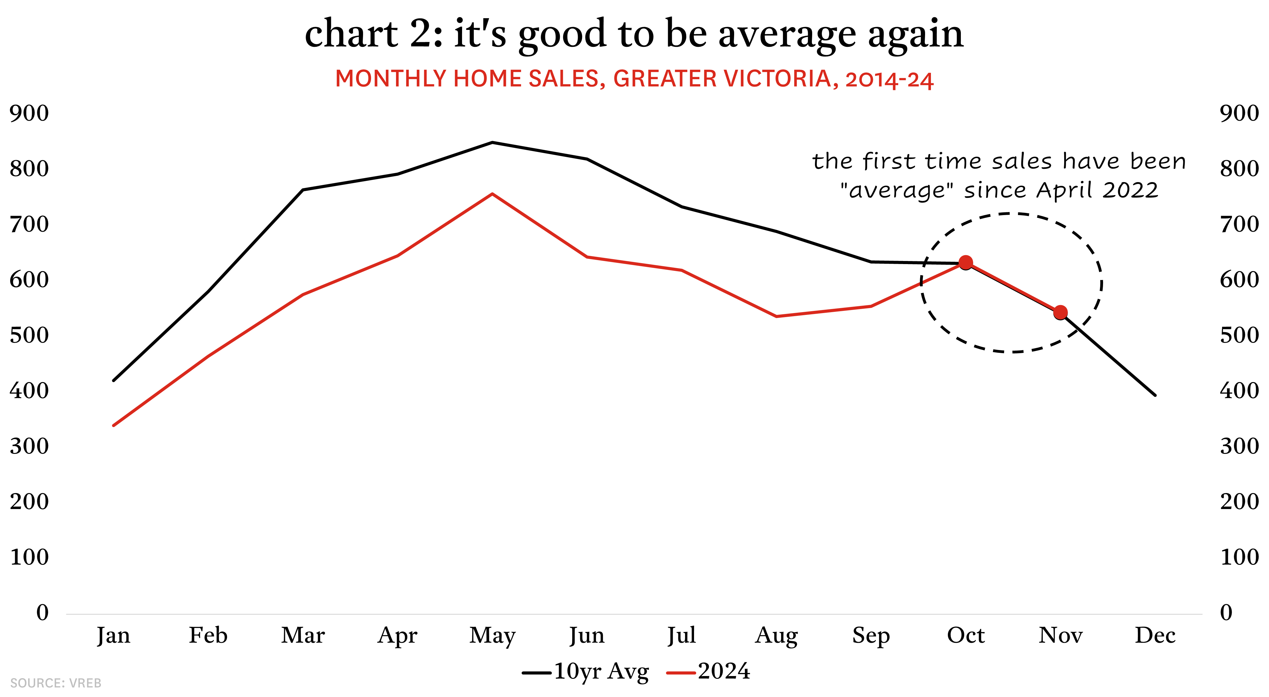 The cumulative impact of this has been sales that resemble more typical seasonal levels. In October, sales were at or above their prior 10-year monthly average for the first time since April 2022 (that’s 30 months). That trend carried into November, with sales at their long-run average level for the second consecutive month. Though sales activity remains well-below average on a per-capita adjusted basis (the population of Greater Victoria has grown some 20% over the past decade), getting back to average on an absolute basis is a sign that the market is on the road to recovery. The region is on pace to see total annual sales increase by roughly 10% year-over-year in 2024.