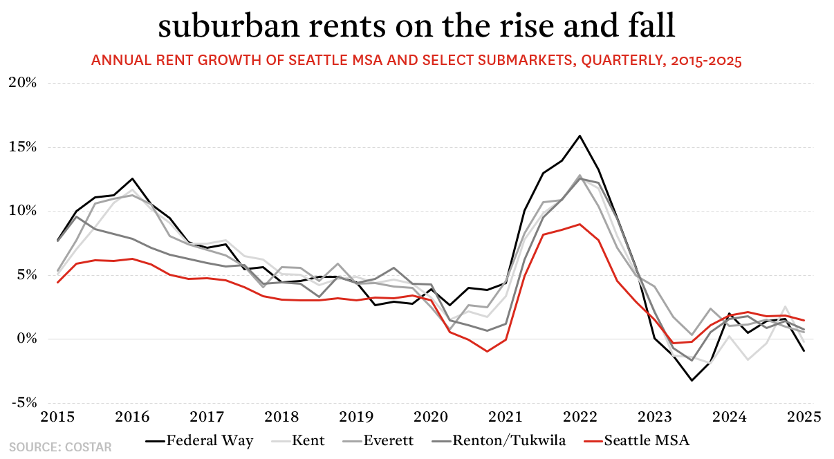 A major reason for this slowdown is that the rental “discount” that once supported these markets has narrowed considerably. In 2015, someone looking for a home to rent in Federal Way would have encountered asking rents roughly a third below the regional average. By the beginning of 2025, that difference had shrunk to just 14%. In some cases, such as in Renton/Tukwila, there is now no meaningful difference in asking rents relative to the metro average.