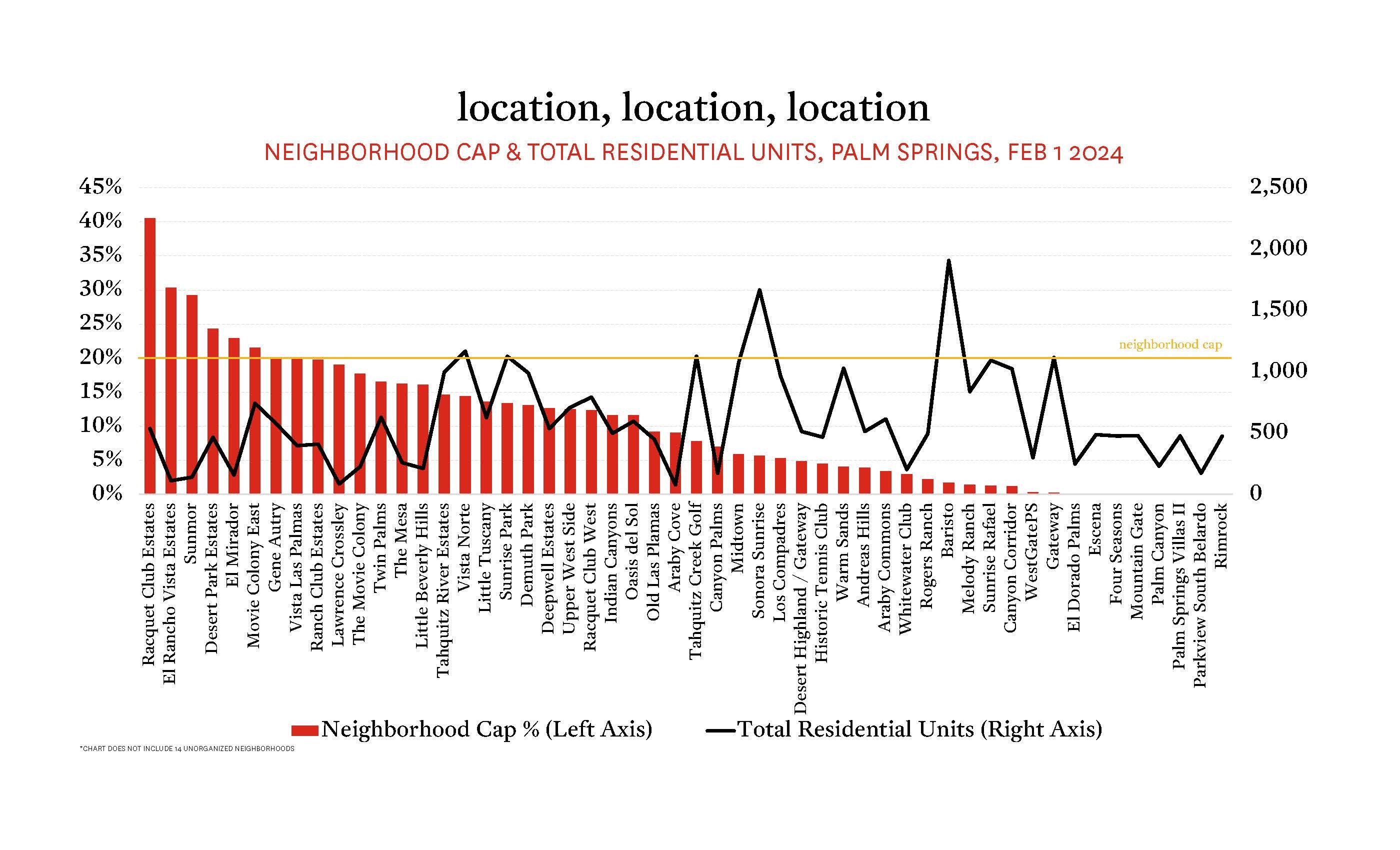 Perhaps most importantly, Ordinance 2075 introduced an Organized Neighborhood Cap (ONC) that only allows up to 20% of residential units in a given neighborhood to be awarded a Vacation Rental Certificate (VRC). This is notable given that some areas of the city have a high proportion of properties that are used for short-term rentals, such as Racquet Club Estates (currently at 41%) or El Rancho Vistas Estates (30%). If you find yourself in one of these areas that has reached or exceeded the cap, applications for VRCs are no longer accepted until the proportion falls below that 20% threshold. With this said, the ONC does not affect VRCs that have already been issued by the City of Palm Springs prior to its adoption by city council. Indeed, the City of Palm Springs clearly states that once a property is sold, the new owner will need to re-apply for a VRC (i.e. the existing VRC is null once a property is sold).