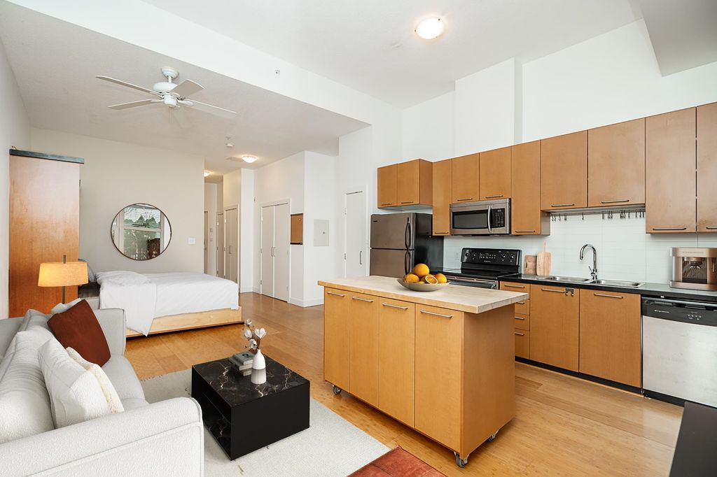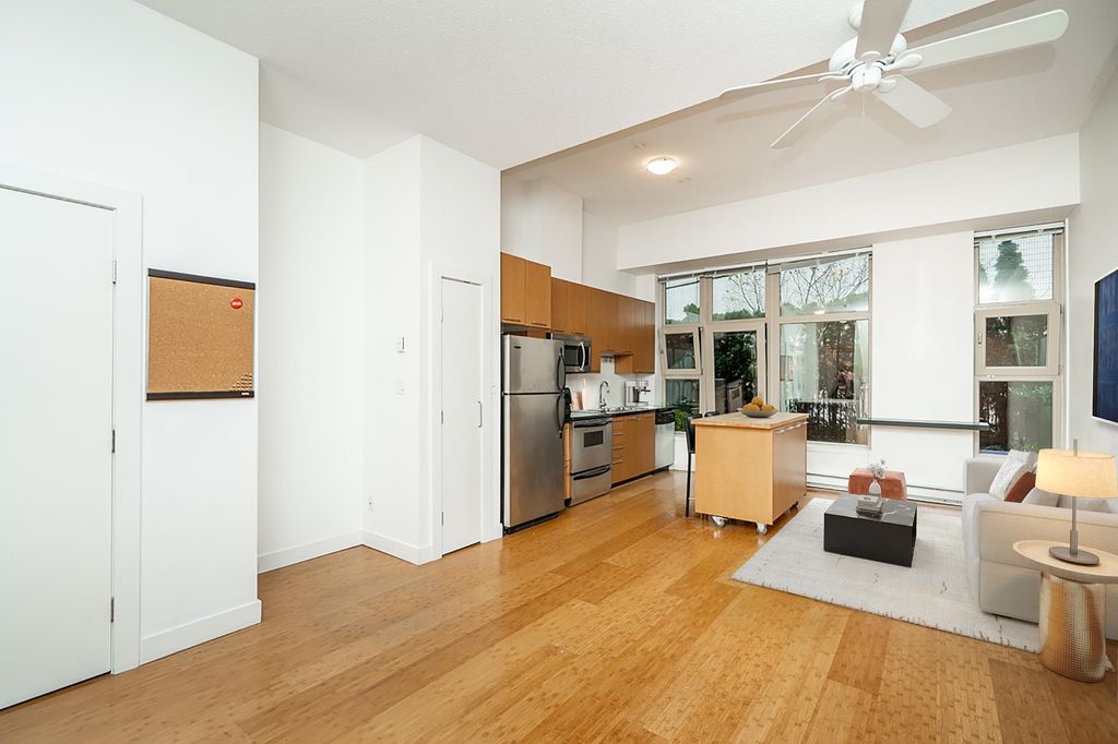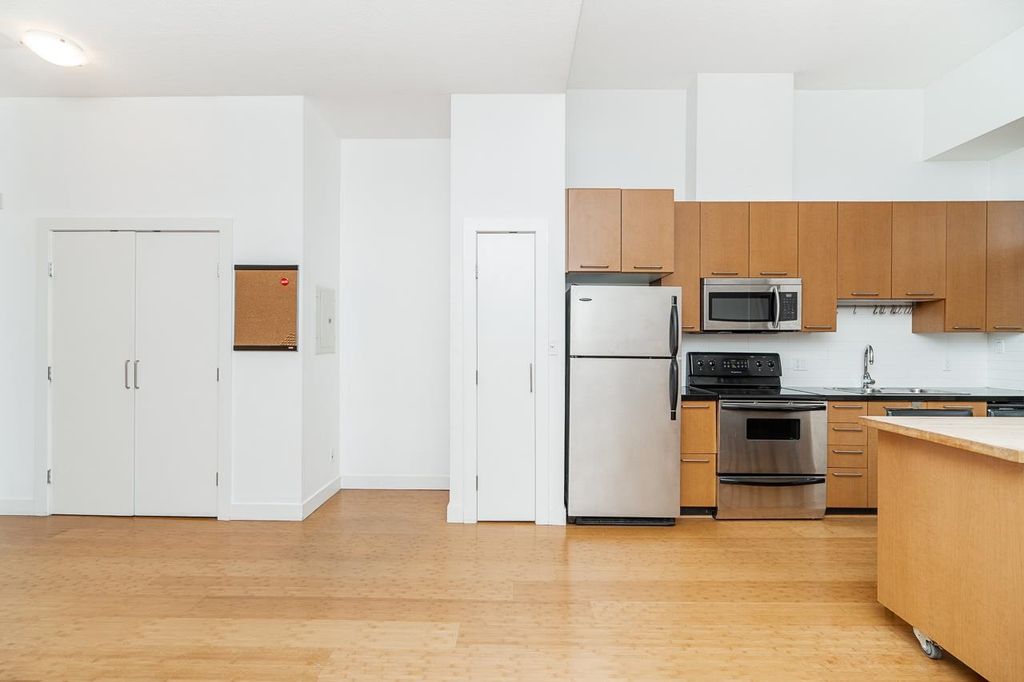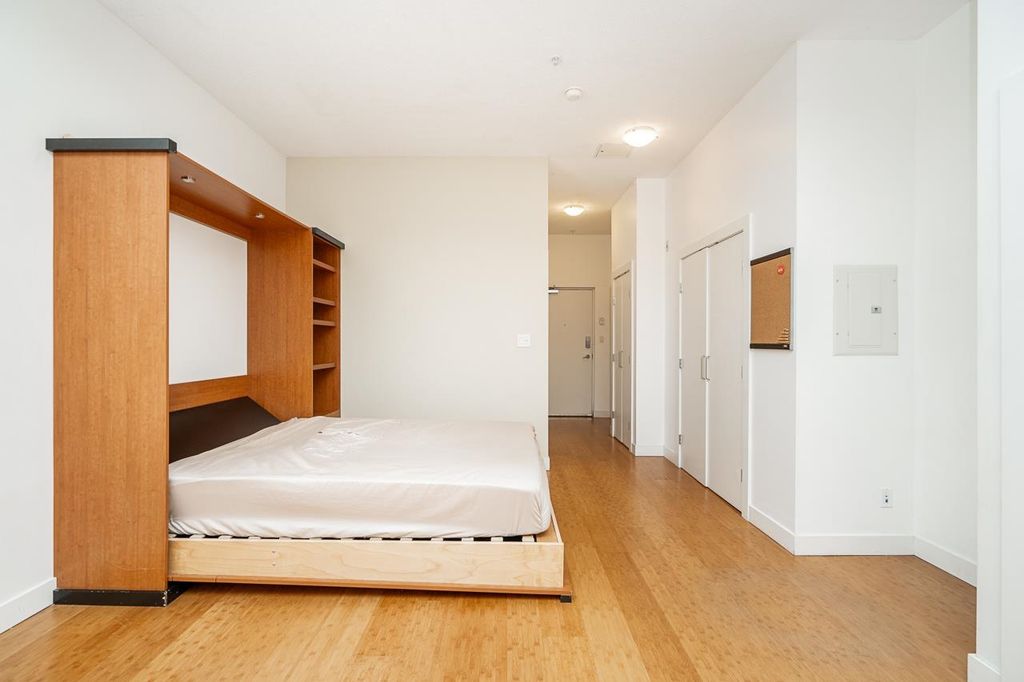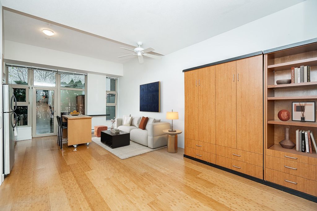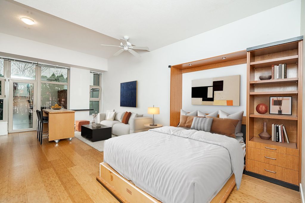 With 11' high ceilings & a large private patio, this studio plus den residence offers 567 sq.ft. of interior living area w/ an airy & space-maximizing layout. With bamboo floors throughout & floor to ceiling windows that welcome in natural light. Kitchen w/ S/S appliances, granite countertops, & a versatile moveable island w/ plenty of extra cabinet space. The built-in Murphy bed can be conveniently tucked away when not in use. Includes ample in-suite storage, in-suite laundry, secure underground parking, & bike storage. The rooftop terrace offers spectacular mountain views. Located in the heart of the thriving Mount Pleasant neighbourhood, this property is close to excellent shops, services, amenities, & rapid transit.