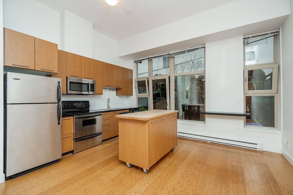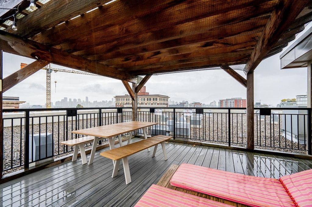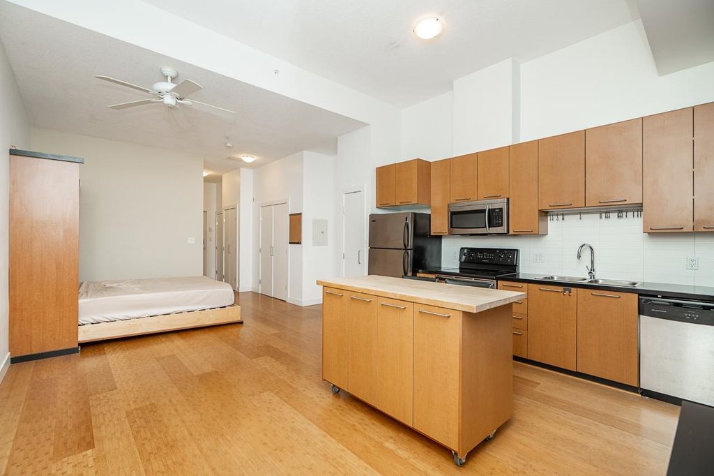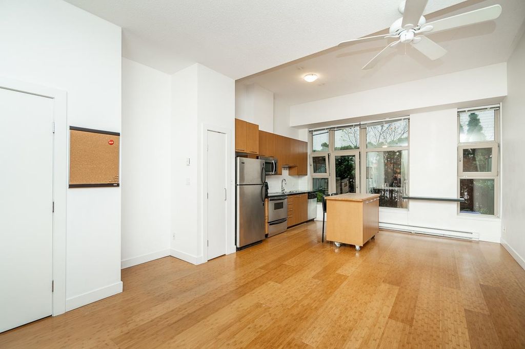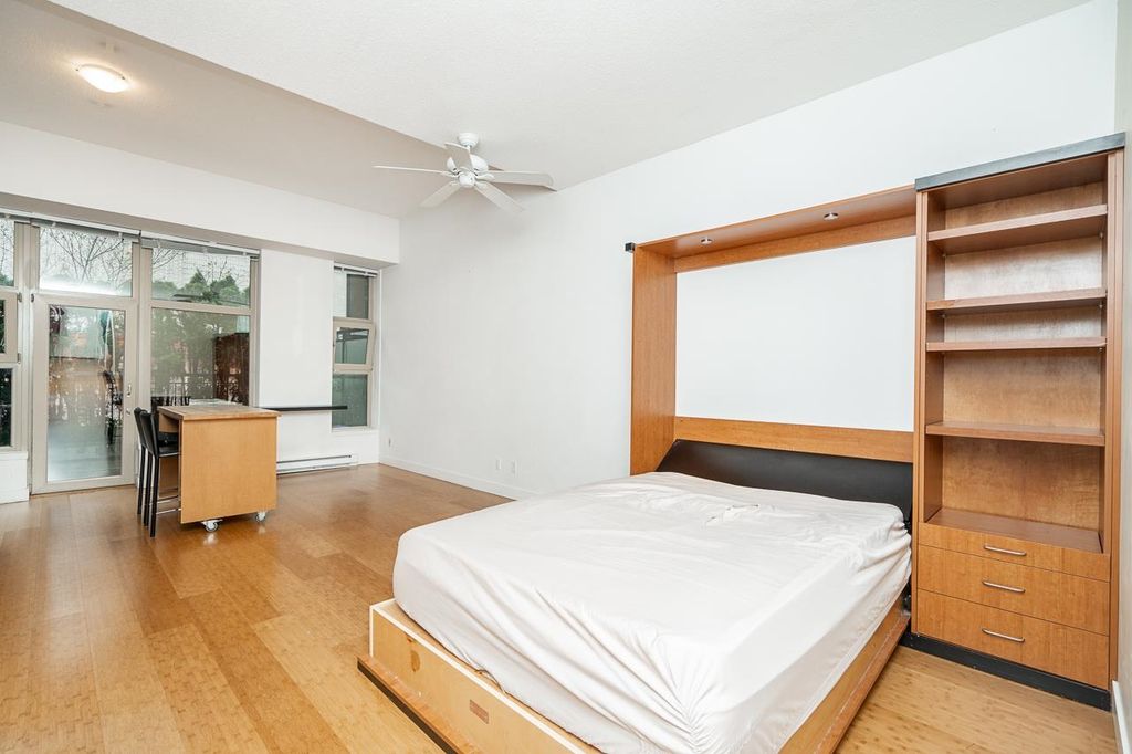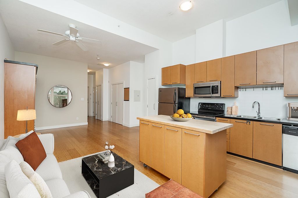 With 11' high ceilings & a large private patio, this studio plus den residence offers 567 sq.ft. of interior living area w/ an airy & space-maximizing layout. With bamboo floors throughout & floor to ceiling windows that welcome in natural light. Kitchen w/ S/S appliances, granite countertops, & a versatile moveable island w/ plenty of extra cabinet space. The built-in Murphy bed can be conveniently tucked away when not in use. Includes ample in-suite storage, in-suite laundry, secure underground parking, & bike storage. The rooftop terrace offers spectacular mountain views. Located in the heart of the thriving Mount Pleasant neighbourhood, this property is close to excellent shops, services, amenities, & rapid transit.