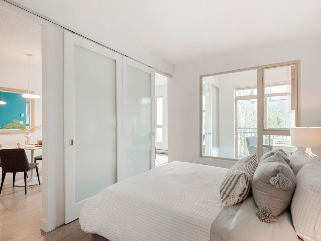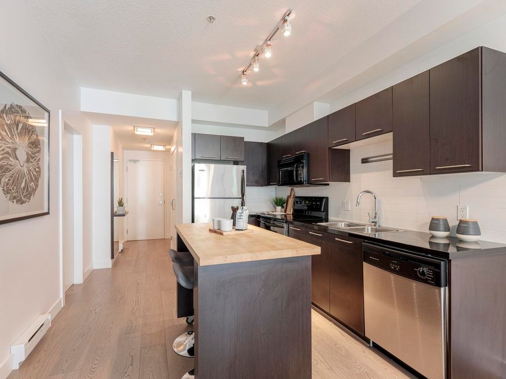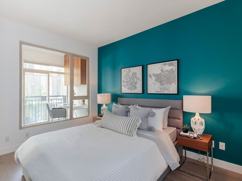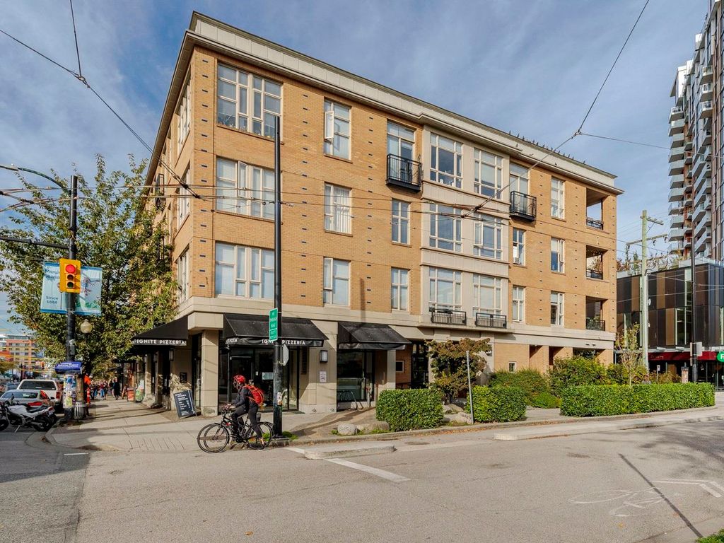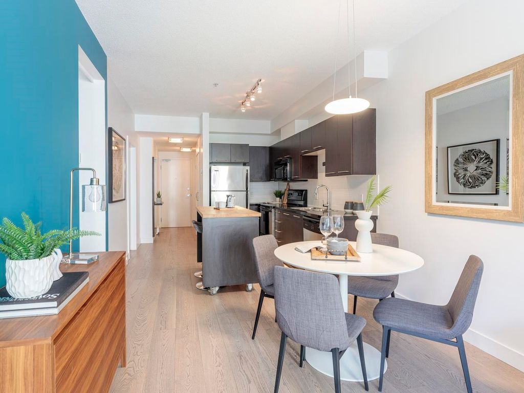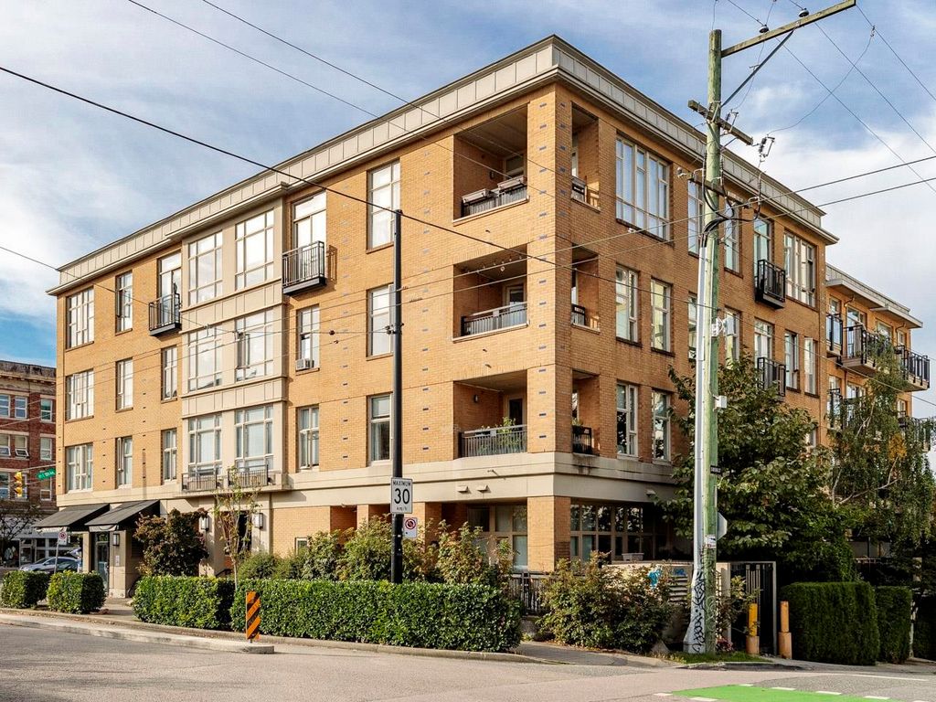 Welcome to the Hub, a beautiful boutique building located in one of the best neighbourhoods in Vancouver. This impressive home features beautiful white oak floors, 9’ft ceilings, floor to ceiling windows & an open plan. The gourmet kitchen boasts rich, dark cabinetry, granite counters, stainless steel appliances and a mobile island with butcher block top. The spacious bedroom is outfitted with Arbutus Closets & the den gets plenty of natural light which is a perfect place to set up a home office. Complete with in-suite storage, a Juliet balcony, designer lighting, blackout blinds, laundry + parking. Rated with a 96 walk-score, you have top-notch coffee shops, breweries and restaurants at your doorstep and just minutes to the sea wall, Olympic Village and the new Broadway Line Skytrain.
