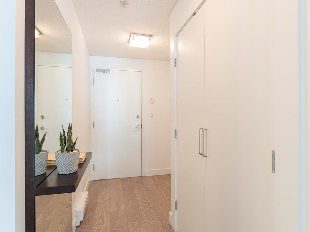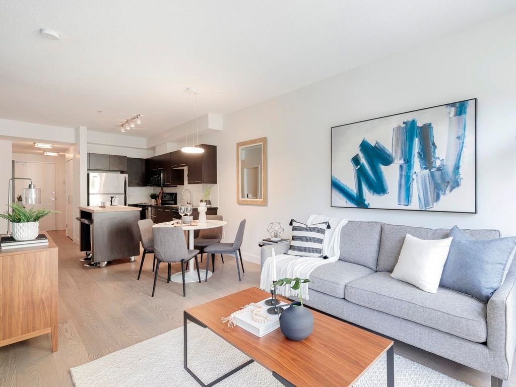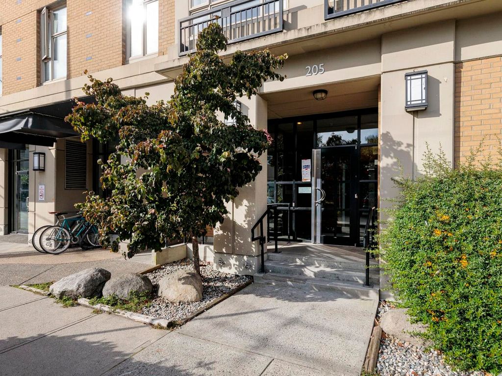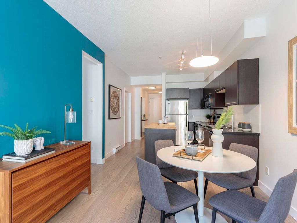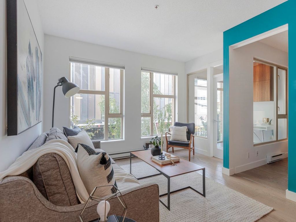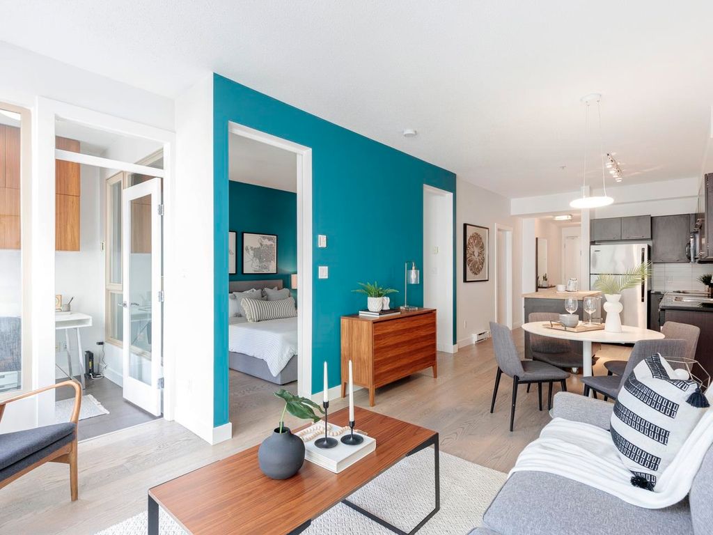 Welcome to the Hub, a beautiful boutique building located in one of the best neighbourhoods in Vancouver. This impressive home features beautiful white oak floors, 9’ft ceilings, floor to ceiling windows & an open plan. The gourmet kitchen boasts rich, dark cabinetry, granite counters, stainless steel appliances and a mobile island with butcher block top. The spacious bedroom is outfitted with Arbutus Closets & the den gets plenty of natural light which is a perfect place to set up a home office. Complete with in-suite storage, a Juliet balcony, designer lighting, blackout blinds, laundry + parking. Rated with a 96 walk-score, you have top-notch coffee shops, breweries and restaurants at your doorstep and just minutes to the sea wall, Olympic Village and the new Broadway Line Skytrain.