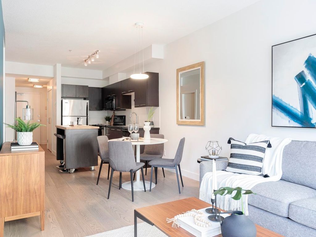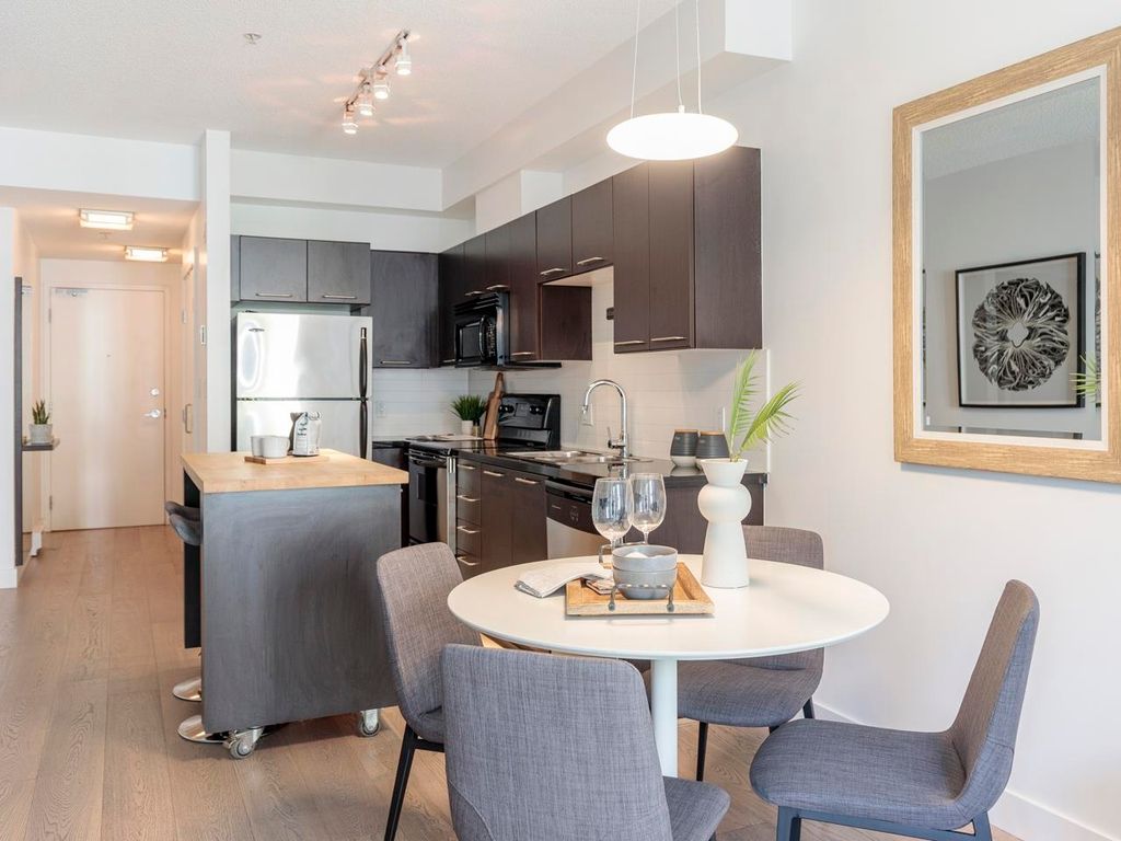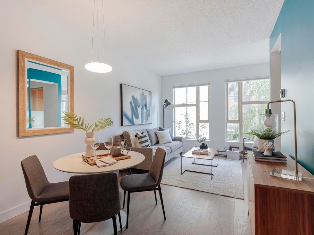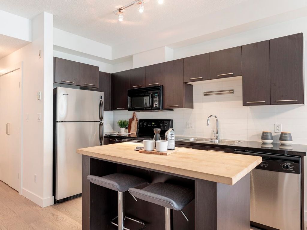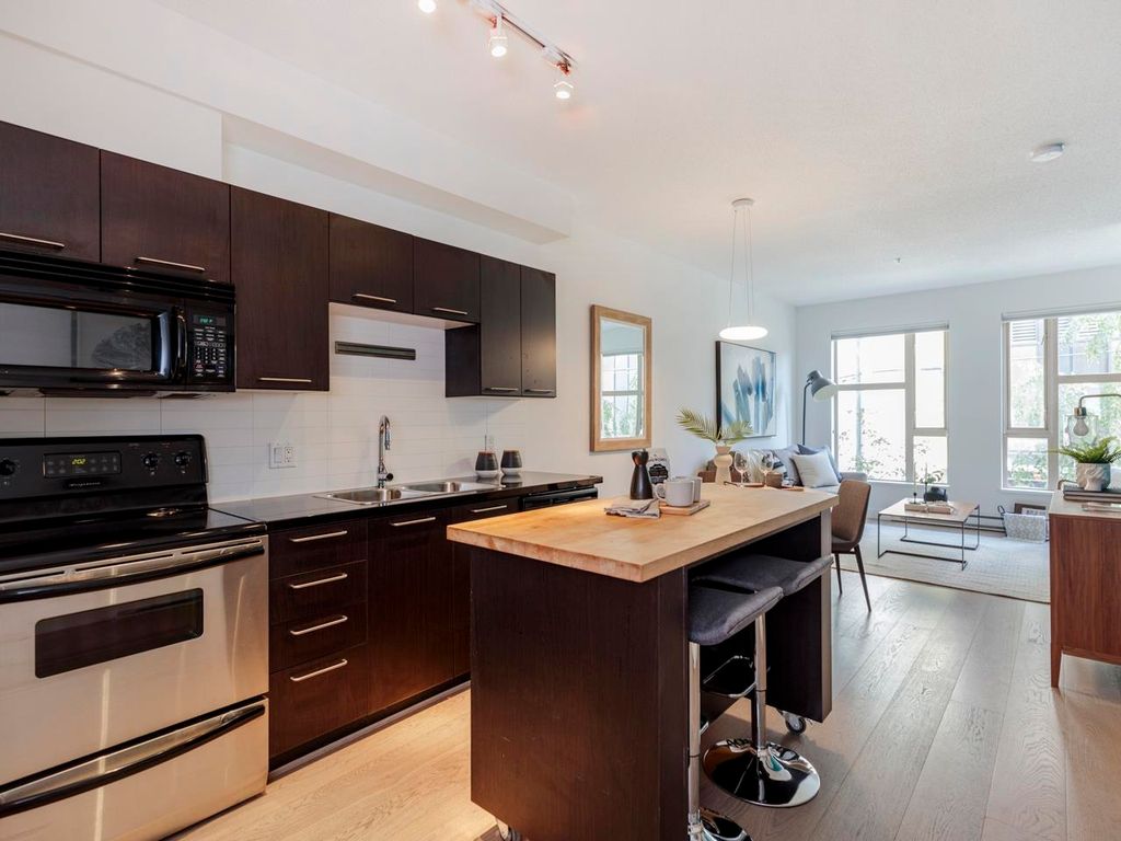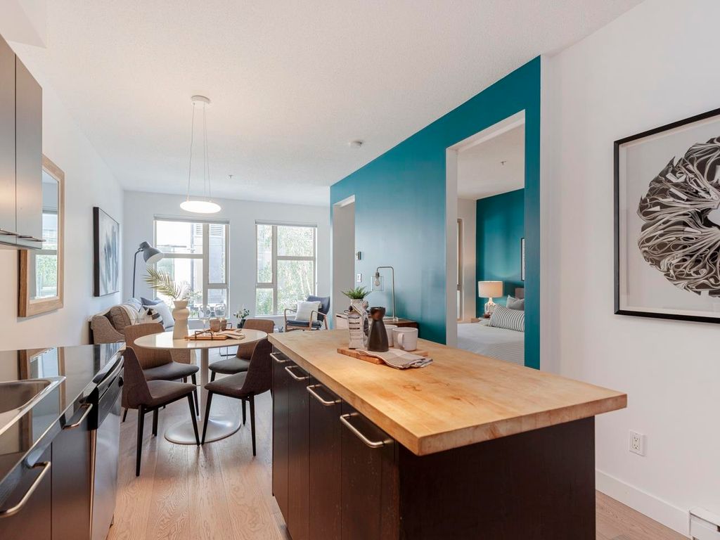 Welcome to the Hub, a beautiful boutique building located in one of the best neighbourhoods in Vancouver. This impressive home features beautiful white oak floors, 9’ft ceilings, floor to ceiling windows & an open plan. The gourmet kitchen boasts rich, dark cabinetry, granite counters, stainless steel appliances and a mobile island with butcher block top. The spacious bedroom is outfitted with Arbutus Closets & the den gets plenty of natural light which is a perfect place to set up a home office. Complete with in-suite storage, a Juliet balcony, designer lighting, blackout blinds, laundry + parking. Rated with a 96 walk-score, you have top-notch coffee shops, breweries and restaurants at your doorstep and just minutes to the sea wall, Olympic Village and the new Broadway Line Skytrain.