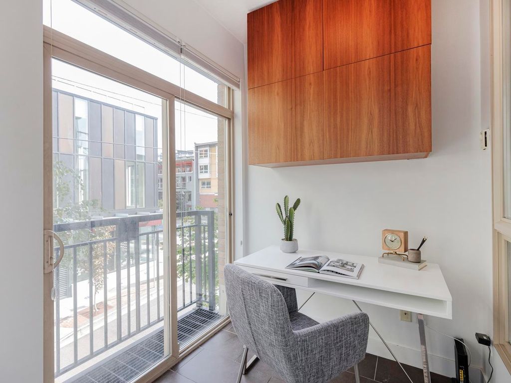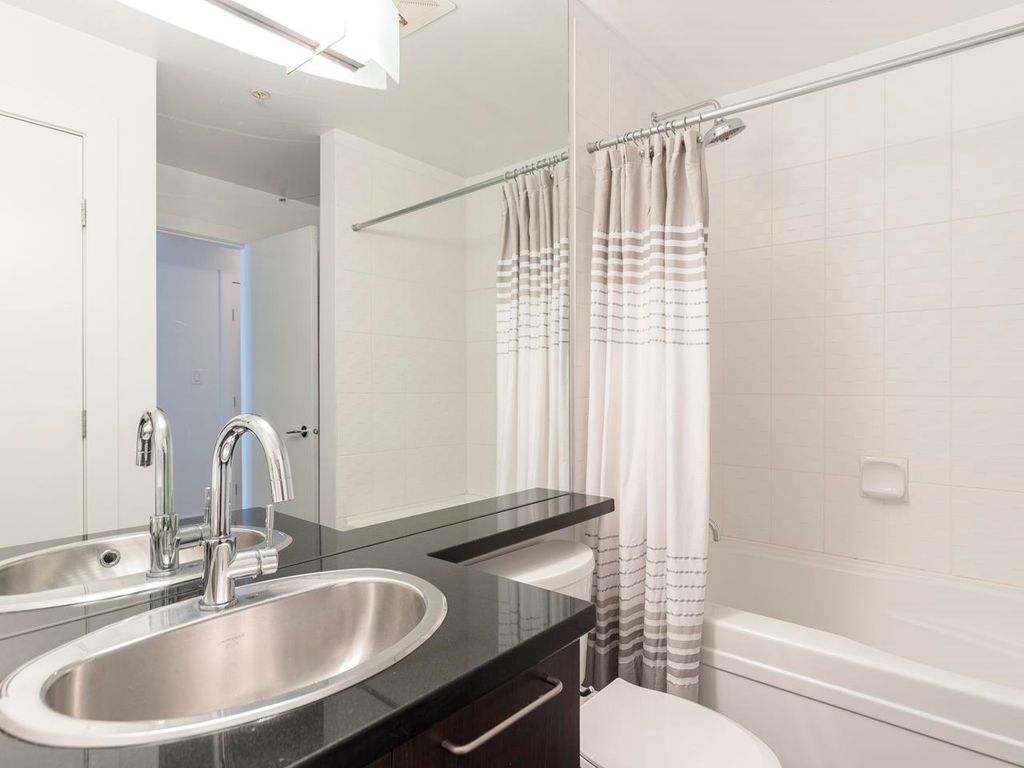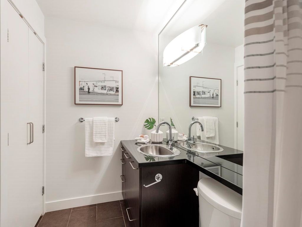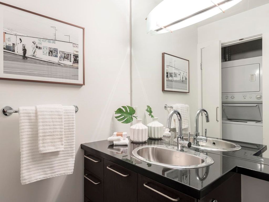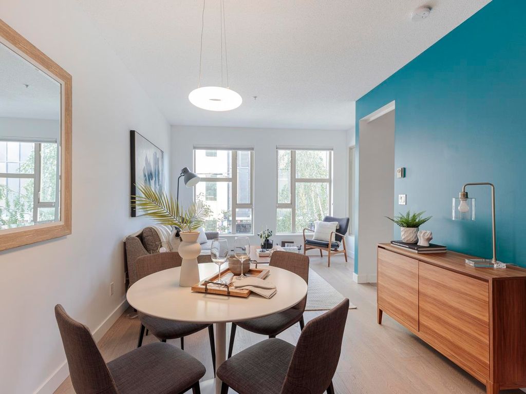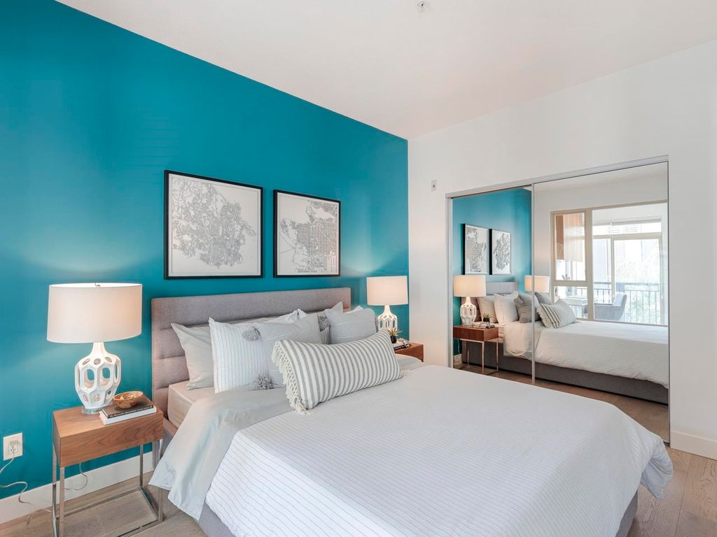 Welcome to the Hub, a beautiful boutique building located in one of the best neighbourhoods in Vancouver. This impressive home features beautiful white oak floors, 9’ft ceilings, floor to ceiling windows & an open plan. The gourmet kitchen boasts rich, dark cabinetry, granite counters, stainless steel appliances and a mobile island with butcher block top. The spacious bedroom is outfitted with Arbutus Closets & the den gets plenty of natural light which is a perfect place to set up a home office. Complete with in-suite storage, a Juliet balcony, designer lighting, blackout blinds, laundry + parking. Rated with a 96 walk-score, you have top-notch coffee shops, breweries and restaurants at your doorstep and just minutes to the sea wall, Olympic Village and the new Broadway Line Skytrain.