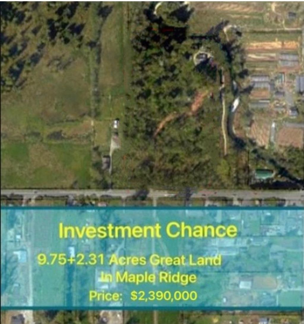 Investor alert, Great 9.75+2.31 Acres Land in North Maple Ridge. Nature environment with trees and rivers around. Property has lots potentials. A four bedrooms house with big above loft on the property. Sitting back in the building, you can enjoy the view of mountains and river, watching snow on the mountain and salmon fish running in the river. Property has two partial, additional 2.31 Acres on the north Alouette River. Build your dream house in this area with both city facilities and beautiful nature environment. Close to city center, and famous Meadow Ridge private school.