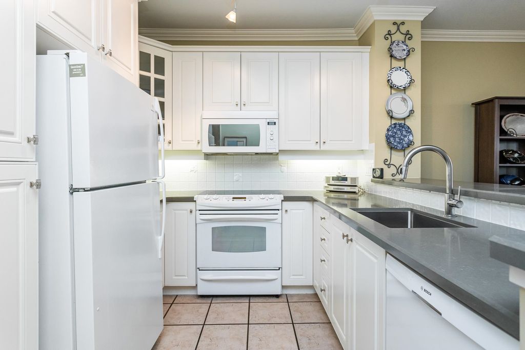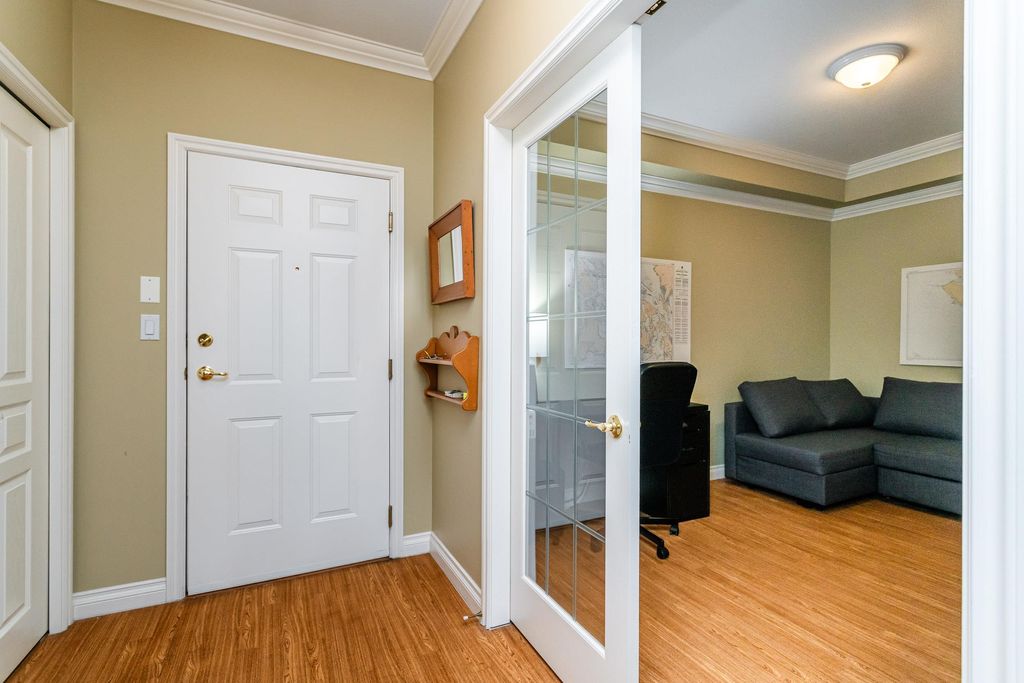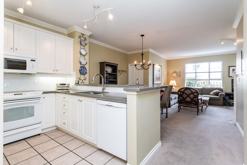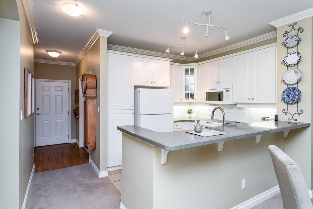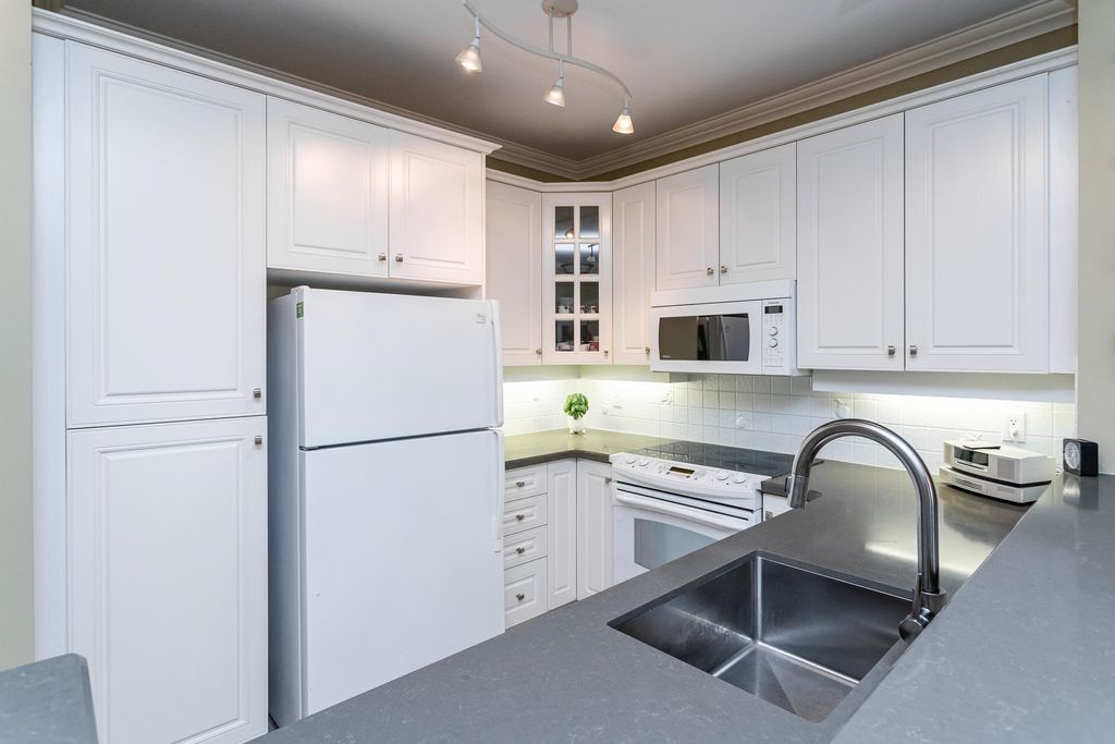 Rarely available unit in Highgrove Manor! This warm & lovely 1-bed & den (or 2-bed), 1000+ sq ft, GROUND floor condo is located inside the Manor building & within the peaceful, safe & beautifully-landscaped townhome complex. The unit features a spacious covered patio w/private west-facing garden area that comes alive in Spring! The white kitchen has updated stone counters, an undermount sink & new faucet. Oversized primary bedroom w/big windows. Spacious den - easily 2nd bedroom with double glass french doors. Live confidently - Highgrove II is a 55+ complex where neighbours go for leisurely walks & keep a helpful eye out for their neighbours. TWO side by side parking stalls underground, & an oversized storage locker.