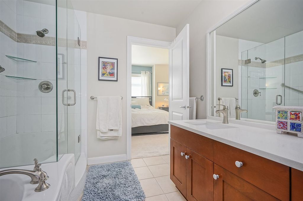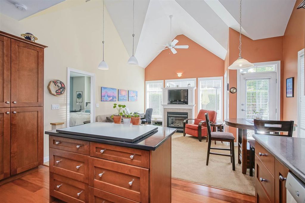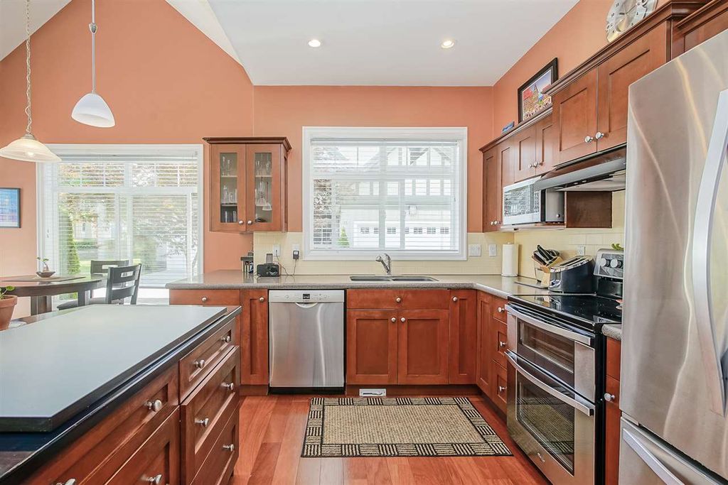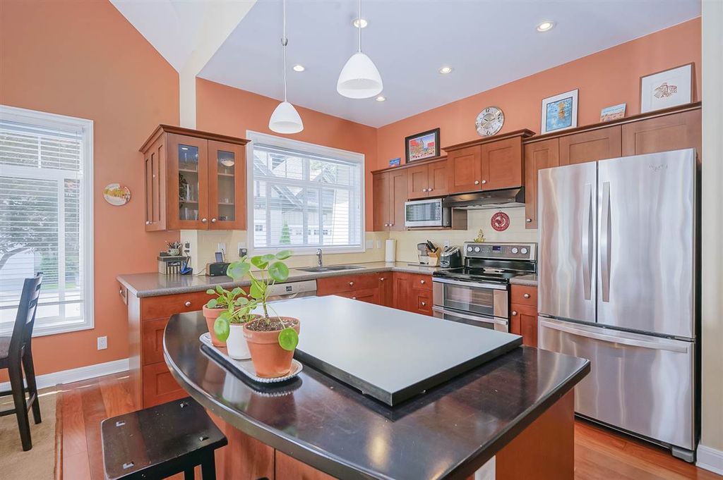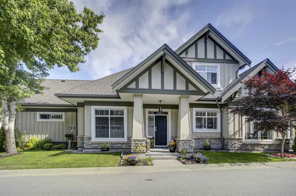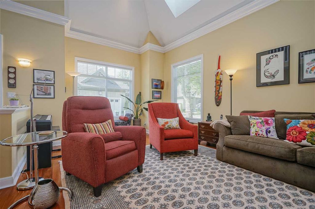 Welcome to MERIDIAN POINTE, one of the most sought-after gated communities in South Surrey! This 1,962 sq. ft. craftsman style executive townhome is a spacious, bright, quiet, CORNER END UNIT far away from 24th! Master on main with ensuite, heated tiles & walk-in closet. Second bedroom with 4 piece ensuite and loft area upstairs that can be used as a den or office. Includes vaulted ceilings, skylights, crown moldings, and 2 gas fireplaces. NEW hardwood floors, countertops, stainless steel appliances. 2 car garage, lots of storage space, and a private patio. NEW roof, furnace and hot water tank in 2018. Walking distance to Urban Acre Forest, South Surrey Rec Centre, Softball City, shopping, and restaurants. 5 min. drive to the beach and easy access to Hwy 99. Semiahmoo school catchment.