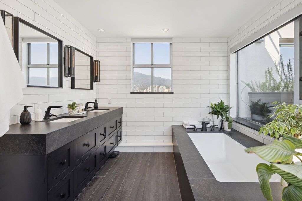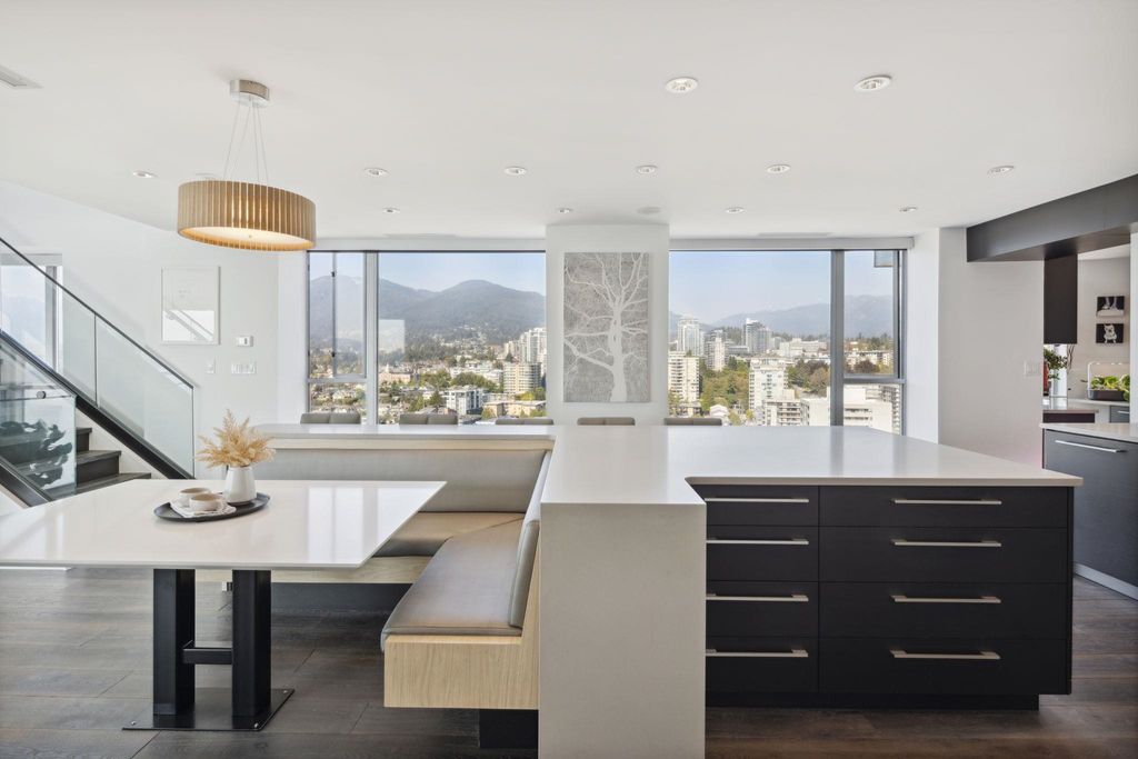 Indulge in unparalleled luxury with this penthouse at the Observatory. Floor-to-ceiling windows offer sweeping city and harbour views. This extensively renovated 2328 SF home spans four levels and features over 1500 SF of outdoor terraces. Highlights include a gourmet kitchen with a butler’s pantry, 12-foot ceilings, custom built-ins throughout, and four private outdoor spaces. The layout has two bedrooms on lower level and a top-floor master suite with a walk-in closet and spa-like en-suite. Enjoy vibrant Lower Lonsdale living with shops, restaurants, and entertainment at your doorstep. Includes 3 parking spots, ample storage, plus stunning gardens, a fitness centre, and a pool—it’s like living in a resort!