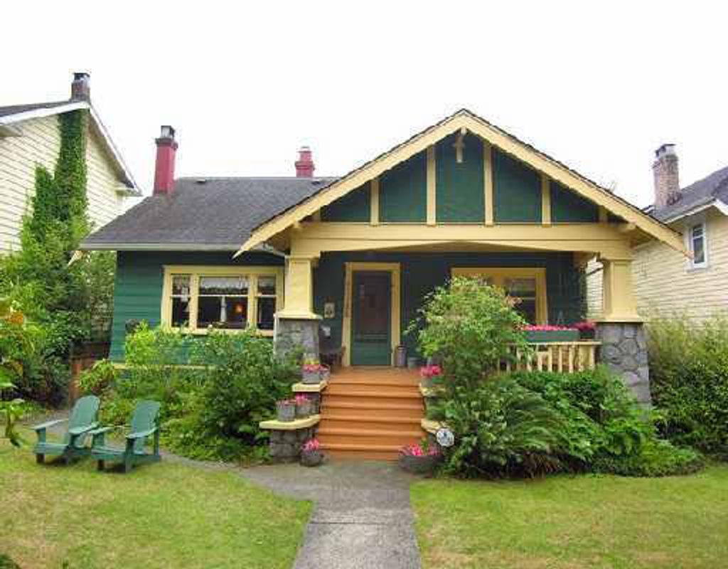 Wonderful circa 1922 Craftsman with large front porch. 3 bdrms plus large walk-in closet or nursery up. Master ensuite with jetted tub and separate shower plus 3 pce main bath up. Fabulous living and formal dining, featuring wainscotting, r efinished oak & fir floors, coffered ceilings, plate rail, crown mouldings, wood fireplace, and built-ins. Full bath, one bdrm plus den or office, large kitchen with breakfast nook and french doors to sunny deck. Lower level ideal for 1 bdrm suite has kitchen and 3 pce bath. Kitchen updated in 2004. Baths update in 1996. Wiring and plumbing upgraded, furnace in 1998. Roof updated 1996. Mostly double glazed windows.