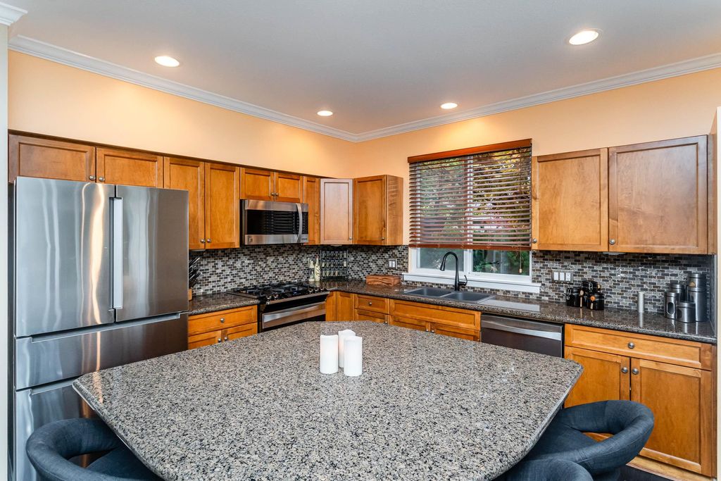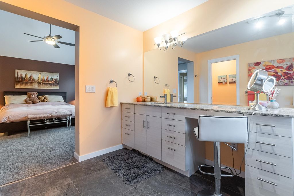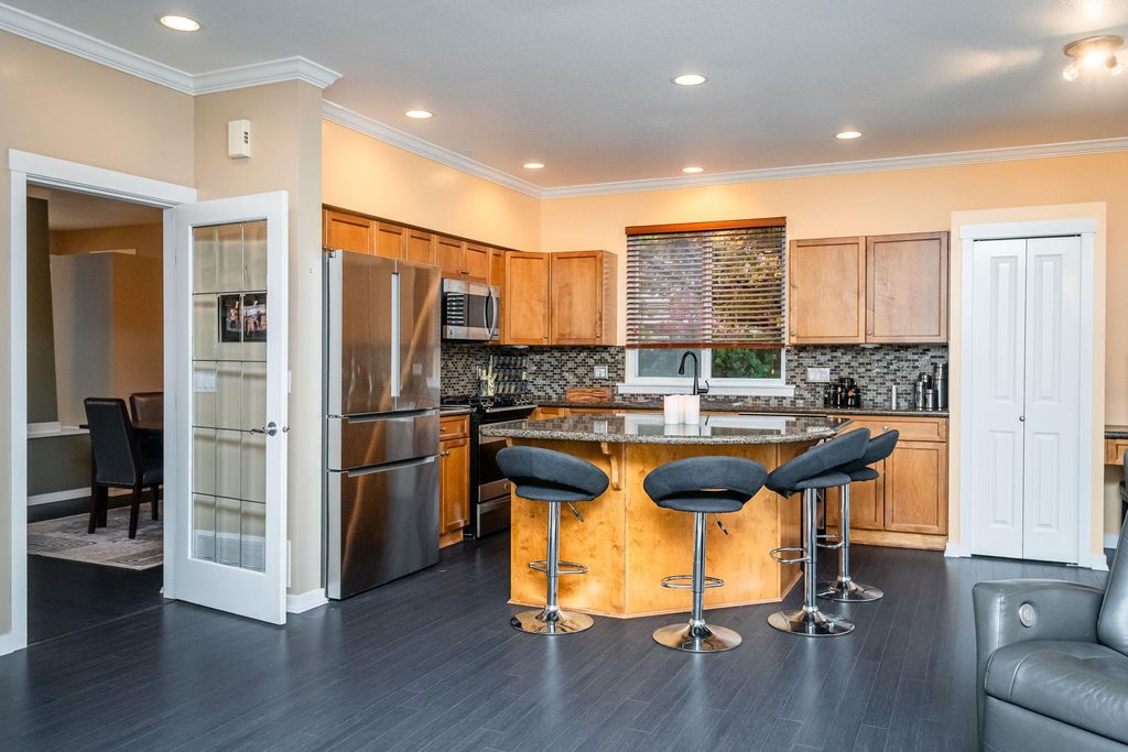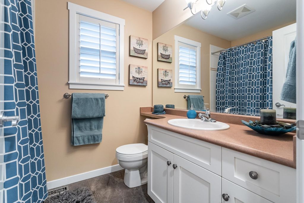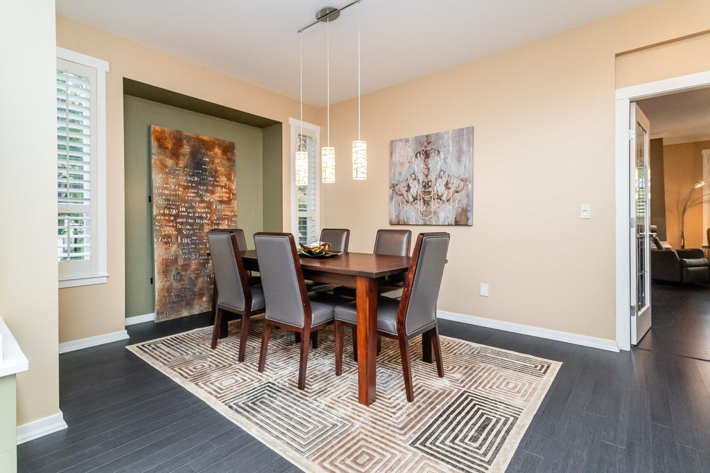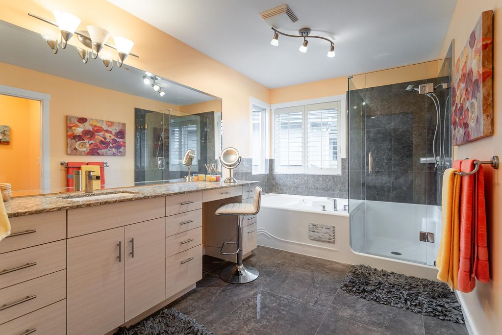 Beautifully updated 5-bed, 4-bath 3078 sqft detached house in this amazing strata community. Welcome to Cambria! This home has the biggest & best patio/yard you'll find in Rosemary Heights! This Monterey floorplan features a gourmet kitchen, family room & vaulted ceilings in living room. Updated hardwood floors, new tile floors & new carpets too! Upstairs has three large bedrooms - huge primary bedroom w/W/I closet & reno'd ensuite bathroom! A comfortable basement - games area, rec room, two addl bedrooms & another beautifully reno'd full bathroom too! Kitchen has gas stove newer appliances, granite counters & walk out HUGE patio. Laundry room w/upper & lower cabinets, utility sink & stacking F/L washer/dryer on the top floor. Other features include security system, B/I vacuum & much more!