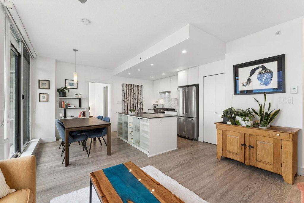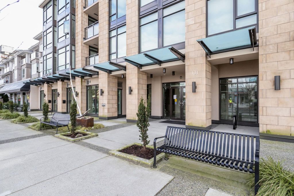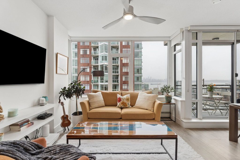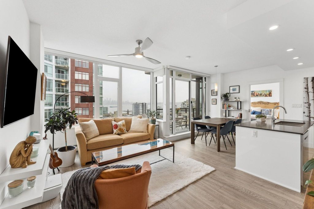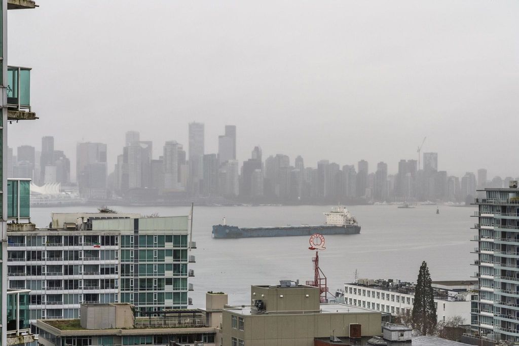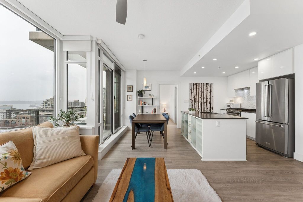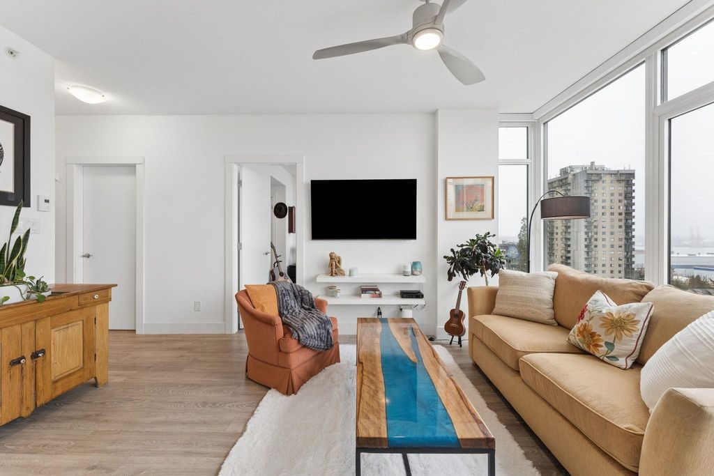 Welcome to this outstanding sub-penthouse featuring expansive ocean, bridge and city views from the walls of windows in every room. This open concept design comfortably accommodates house-sized furnishings and features high ceilings throughout, a functional island, quartz countertops, Kitchen-Aid gas range and a striking herringbone backsplash tile. Entertain w/ ease or enjoy peaceful sunsets on the covered balcony. The bedrooms are separate, each with its own spa-like bathroom; one w/ a jetted tub. Spectacular common rooftop patio w/ 360 views plus BBQ. Secure parking, locker, bike room, gym, and lounge are all yours at The Anchor, a boutique concrete low-rise in vibrant 'LoLo'. Leave the car; stroll to the Quay, bike the Spirit Trail or Seabus downtown in 15 minutes.