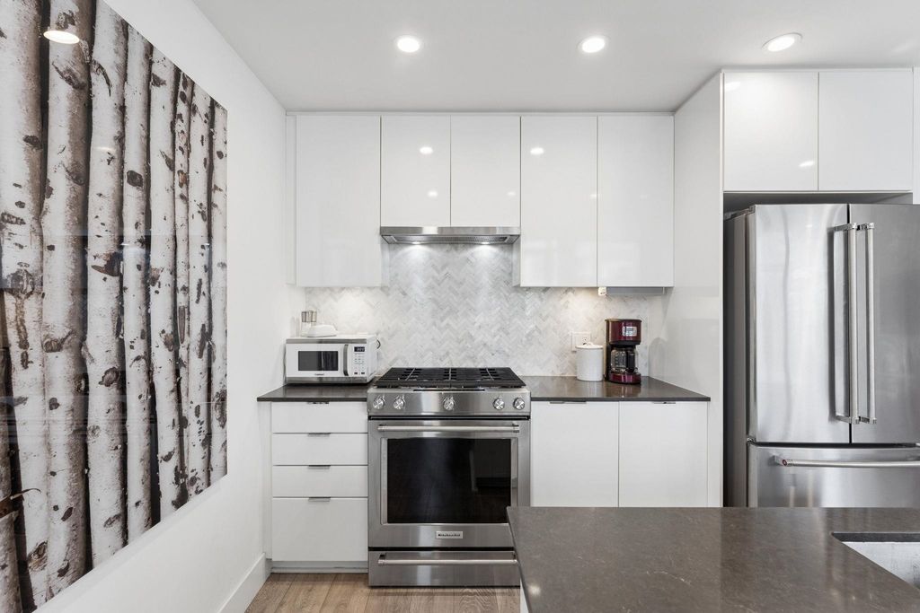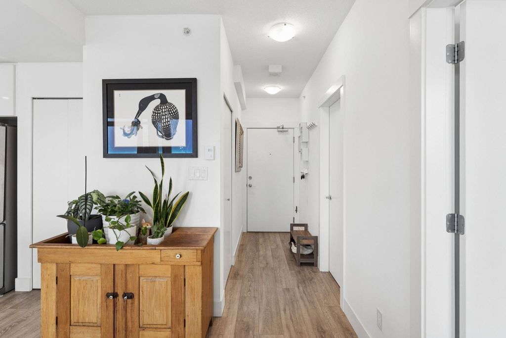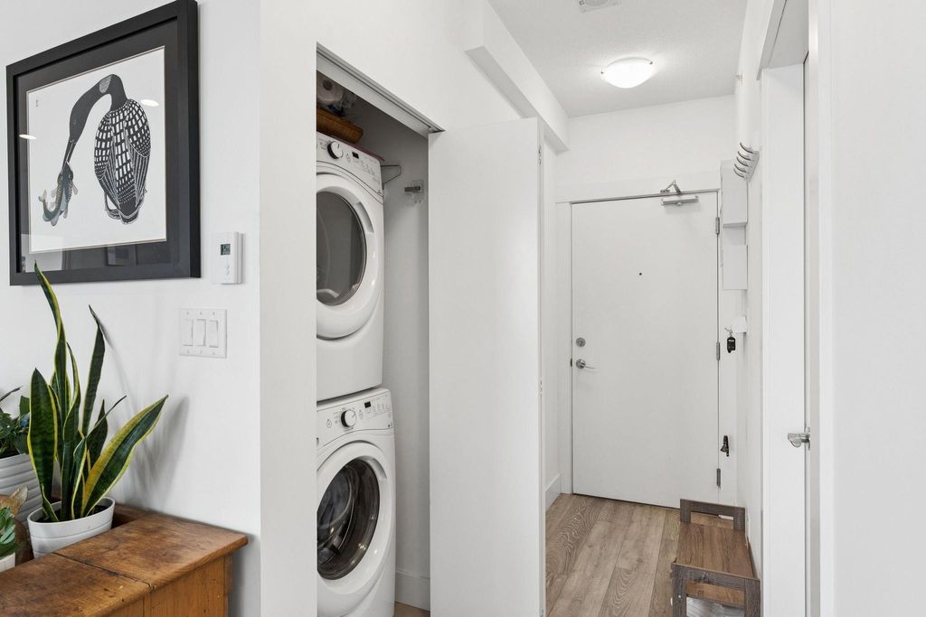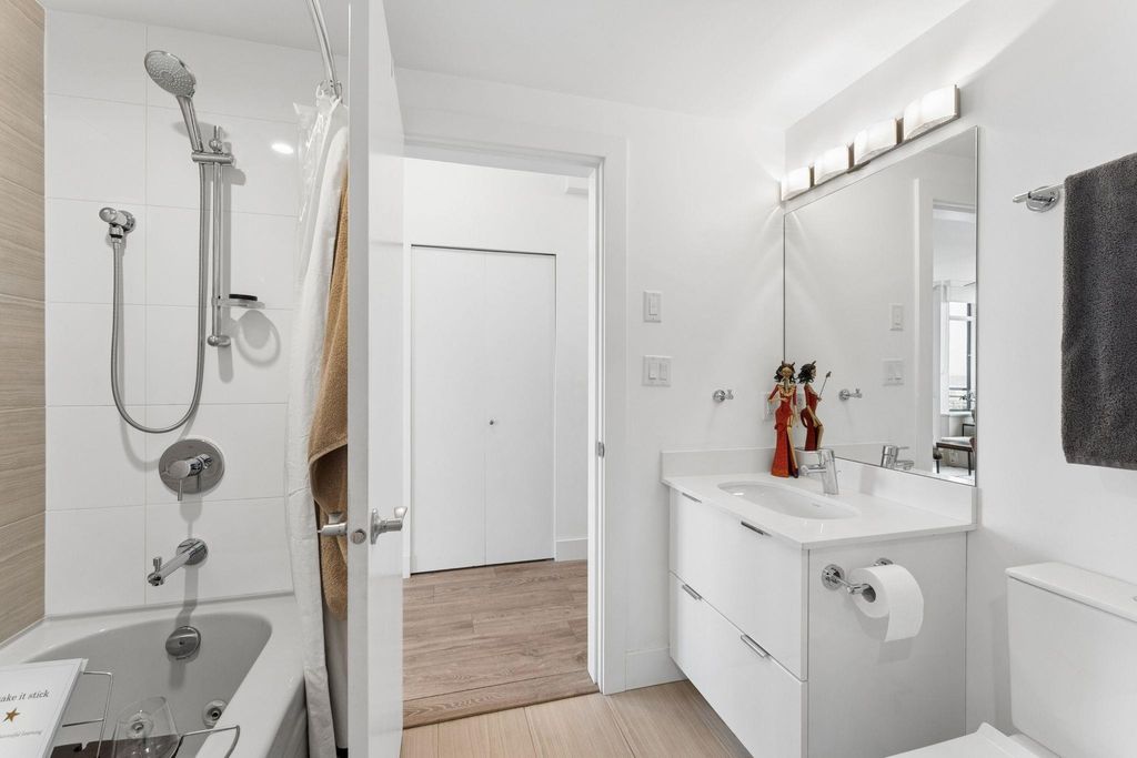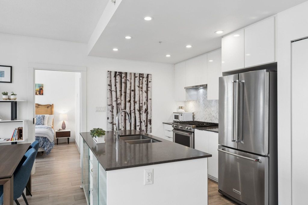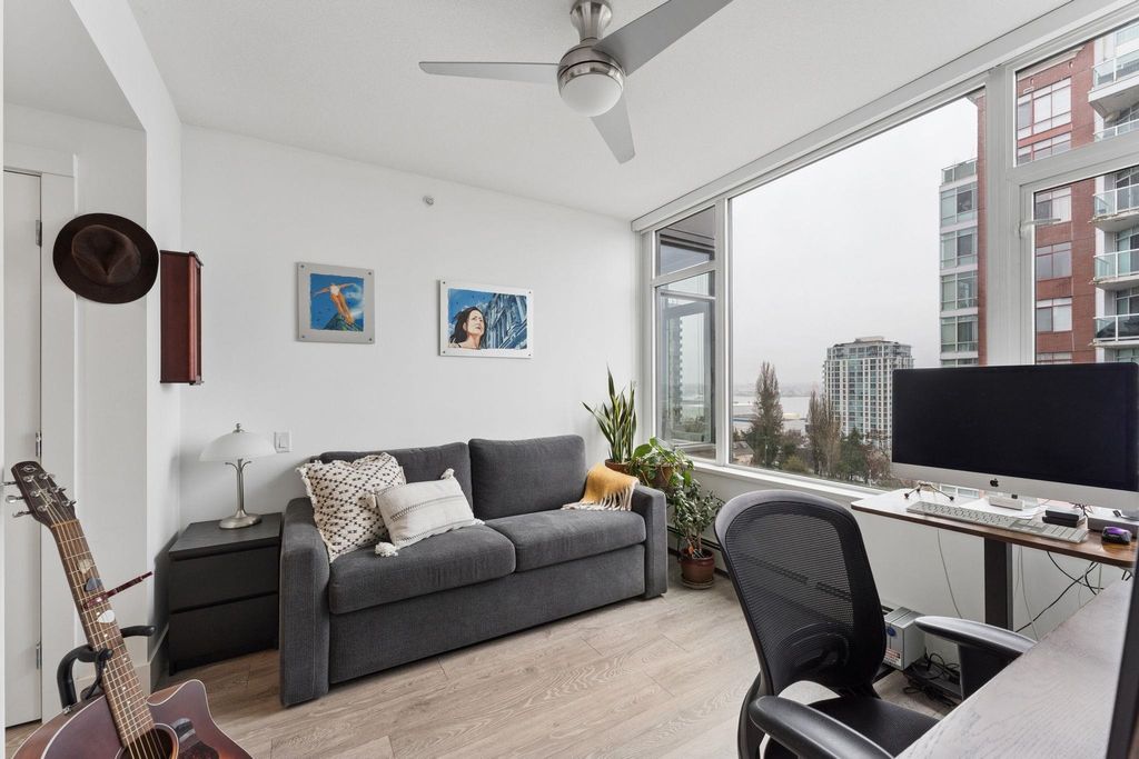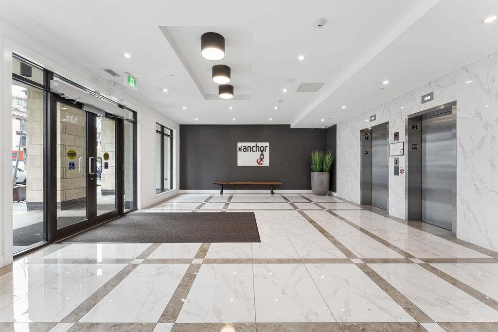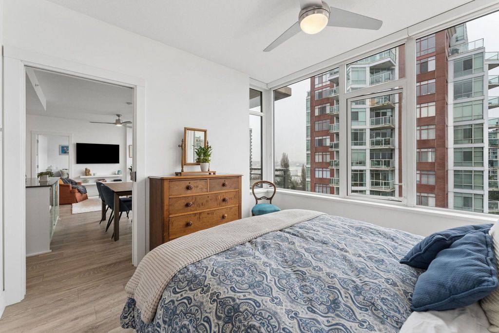 Welcome to this outstanding sub-penthouse featuring expansive ocean, bridge and city views from the walls of windows in every room. This open concept design comfortably accommodates house-sized furnishings and features high ceilings throughout, a functional island, quartz countertops, Kitchen-Aid gas range and a striking herringbone backsplash tile. Entertain w/ ease or enjoy peaceful sunsets on the covered balcony. The bedrooms are separate, each with its own spa-like bathroom; one w/ a jetted tub. Spectacular common rooftop patio w/ 360 views plus BBQ. Secure parking, locker, bike room, gym, and lounge are all yours at The Anchor, a boutique concrete low-rise in vibrant 'LoLo'. Leave the car; stroll to the Quay, bike the Spirit Trail or Seabus downtown in 15 minutes.