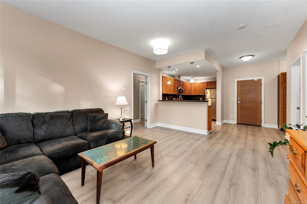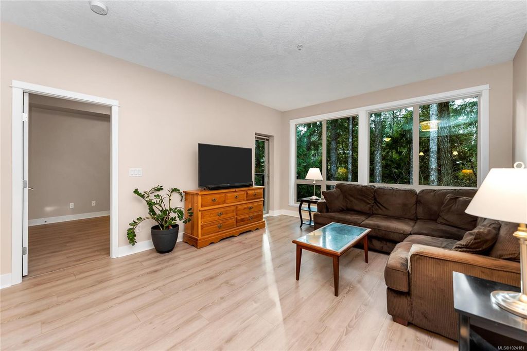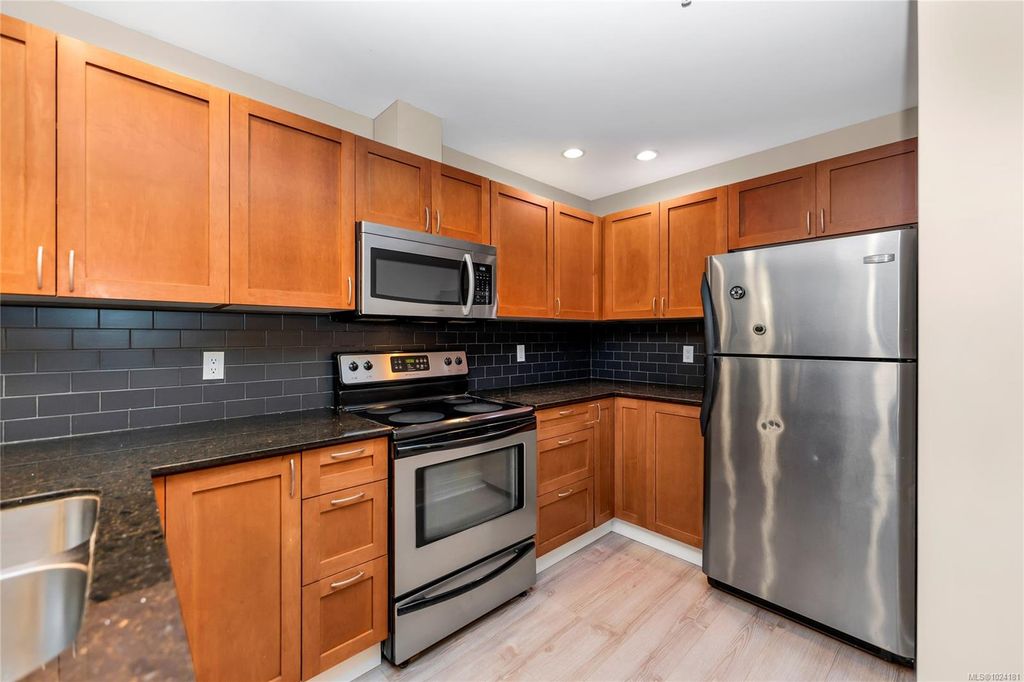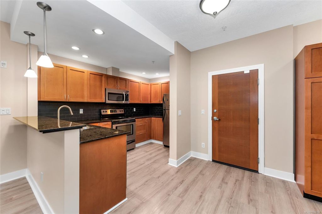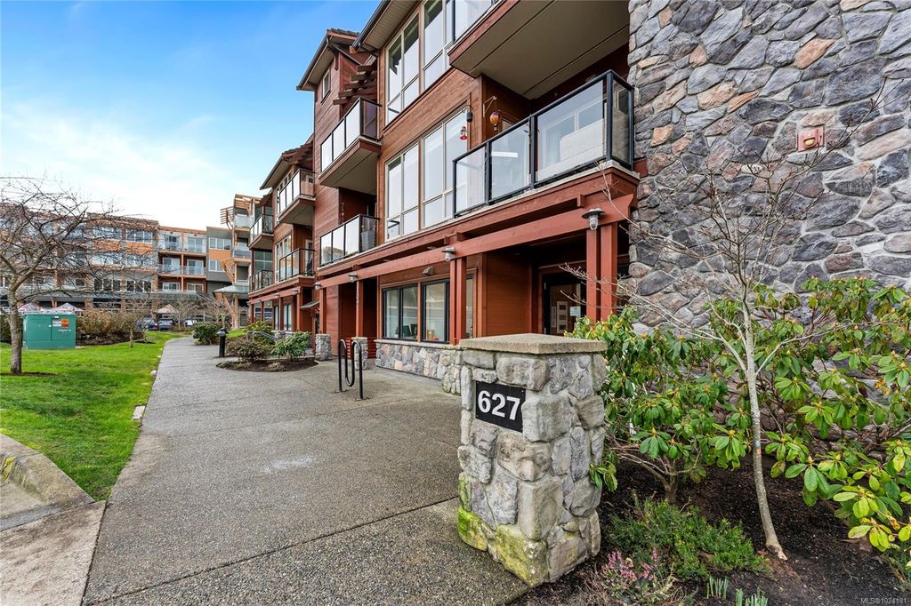 This 2 bedroom 2 bathroom home offers over 850 sq ft. Spacious Kitchen with maple shaker cabinets, stone counters with tile backsplash, stainless appliances, and breakfast bar. Good sized living room with access to the covered deck. Generous master bedroom with walk in closet and full ensuite. Second bedroom and bathroom, insuite laundry room, Fresh paint and flooring. Cozy SOUTH facing corner suite overlooking the bucolic pedestrian wildlife corridor. Steps to the Red Barn Market, Pharmacy, and Olympic View Golf Course. Short stroll to the vibrant Beach Lands Waterfront. Your Realtor can access more information and assist you on your private showing. Please have them call.