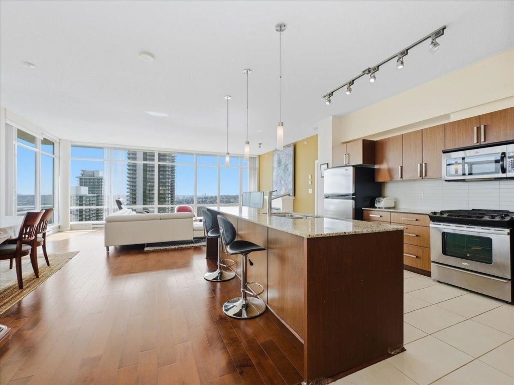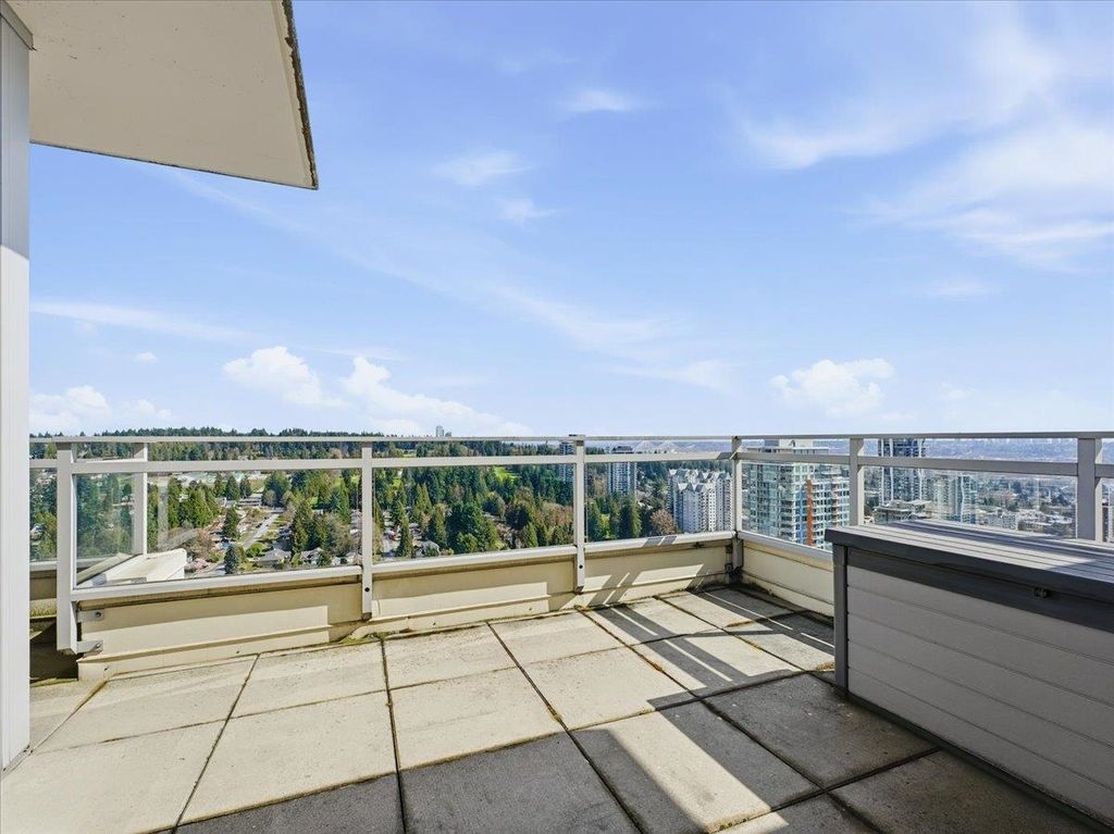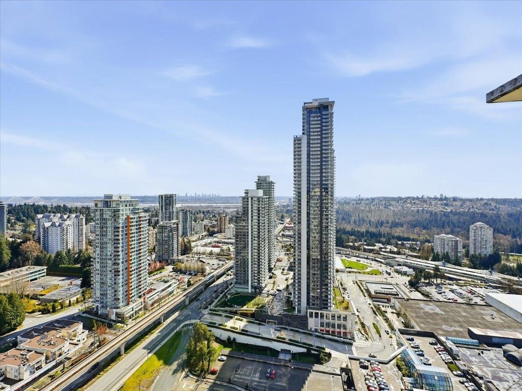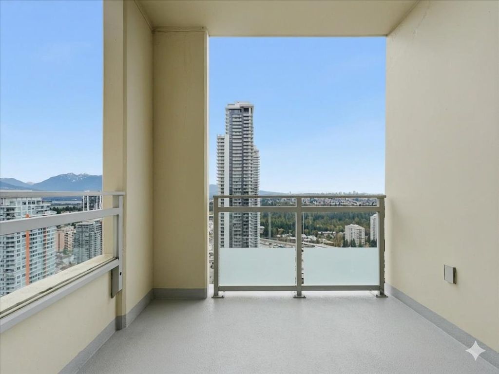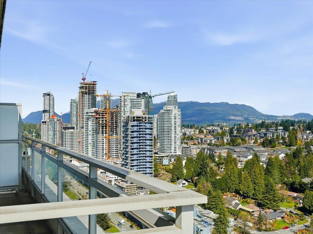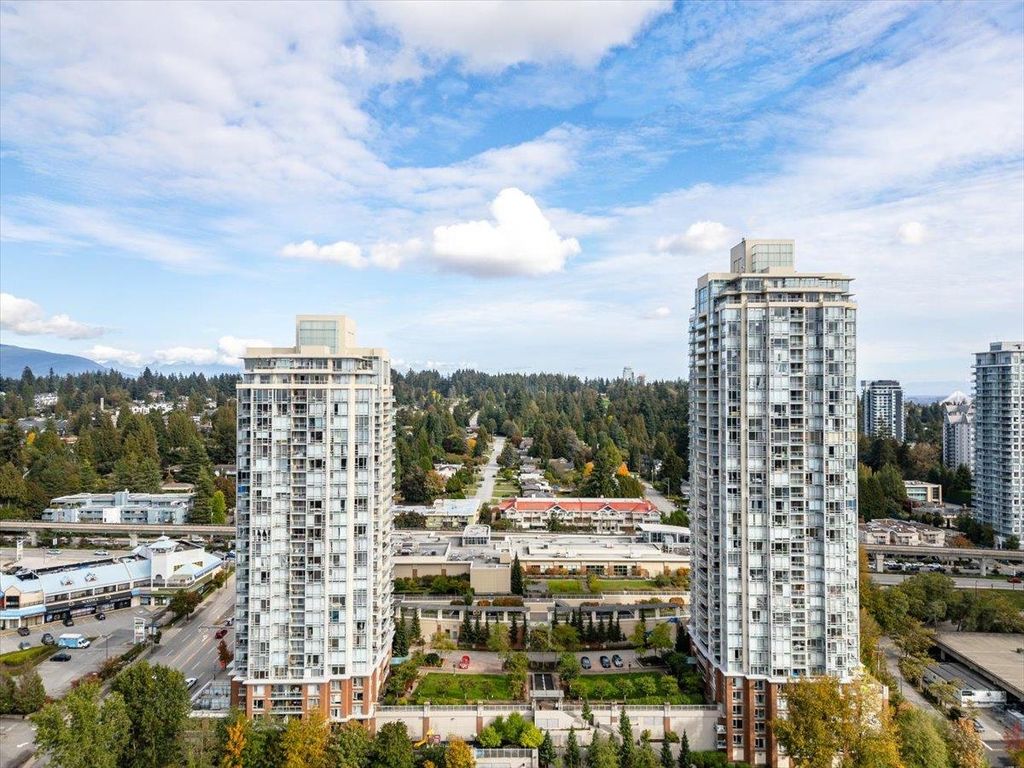 An exceptional 1,544 sqft open-concept penthouse that defines elevated living. Designed with remarkable scale and presence, this residence showcases a seamless, expansive layout enhanced by soaring ceilings and abundant natural light. Commanding breathtaking, unobstructed southeast panoramic views of Mount Baker and the river, it delivers a truly iconic outlook from every angle. Elegant hardwood flooring runs throughout, complemented by a refined gourmet kitchen with stainless steel appliances and granite countertops. A generous garden-style balcony extends the living space, while each bedroom features its own private balcony access. Includes two side-by-side parking stalls and a storage lockers. Steps to SkyTrain, Lougheed Mall, and every amenities.