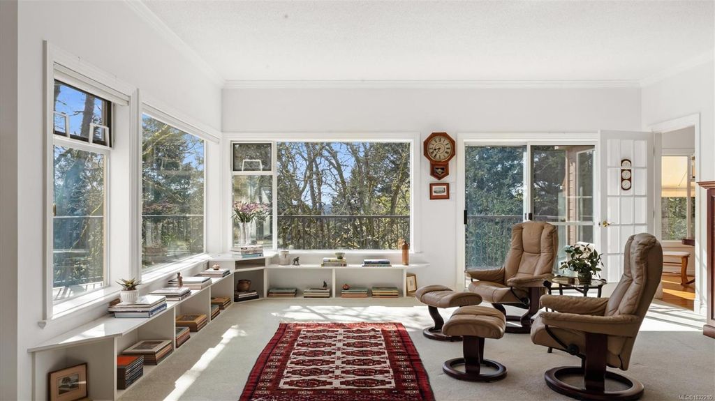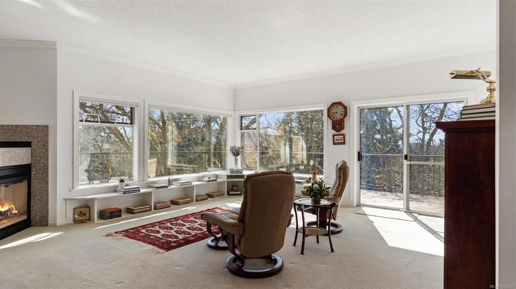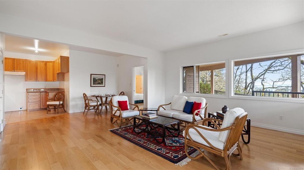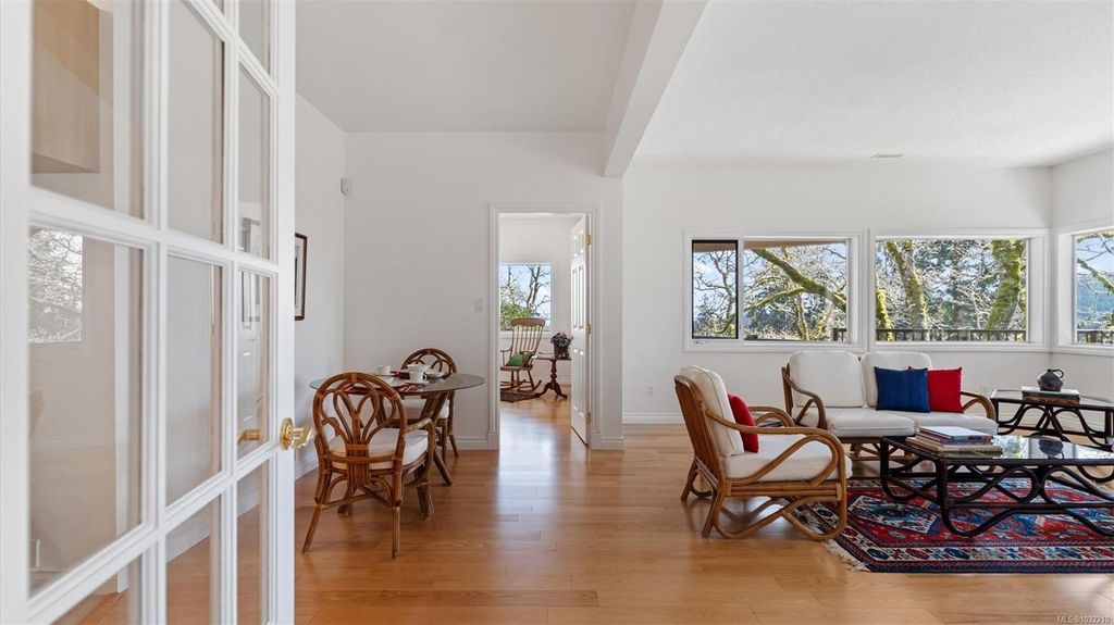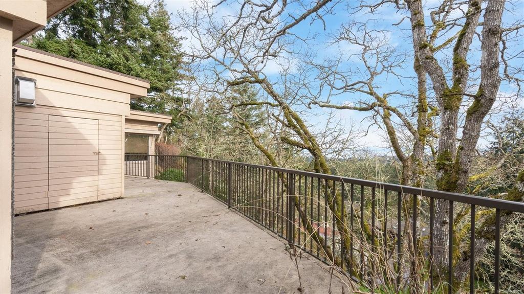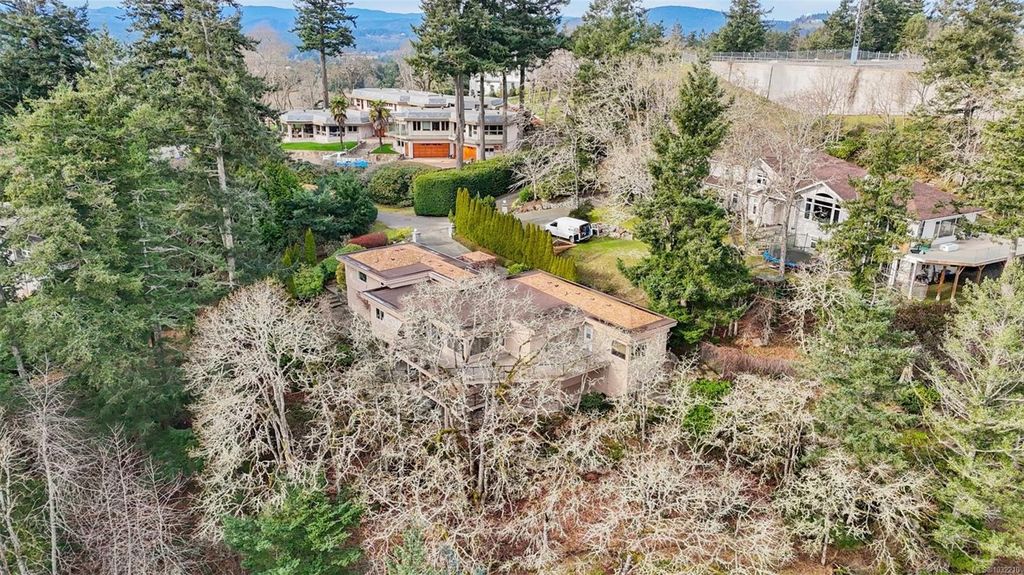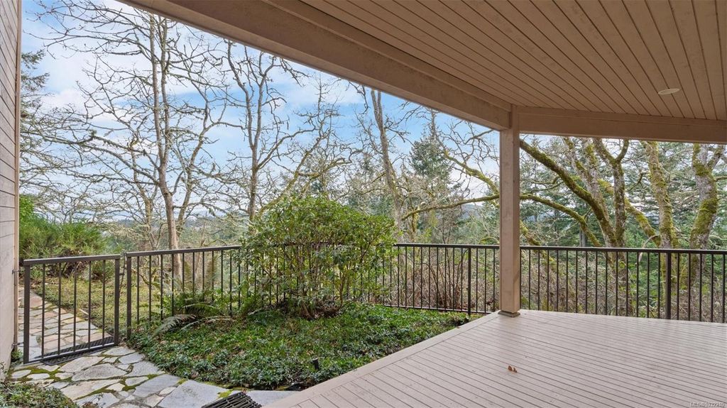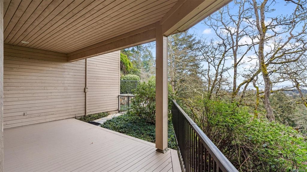 Located in a desirable upmarket neighbourhood, this elegant residence is perfectly positioned to capture stunning panoramic views of the ocean, the lush mature trees and Mt. Doug. The main house features a massive open-concept living and dining area where oversized windows frame the incredible scenery. The main level flows seamlessly onto a spectacular 642-square-foot balcony offering a private, elevated outlook. The primary bedroom is a true retreat with beautiful views, a generous walk-through wardrobe, and a private ensuite. Completing the main home are two additional bedrooms, a five-piece bath, and a powder room. As a fantastic addition, the property includes a bright and spacious one-bedroom suite with its own entrance, ideal for guests or family. This fully contained suite offers an open kitchen and living area, plus a large covered deck to enjoy the same peaceful scenery. This home provides a quiet lifestyle in a beautiful, landscaped setting.