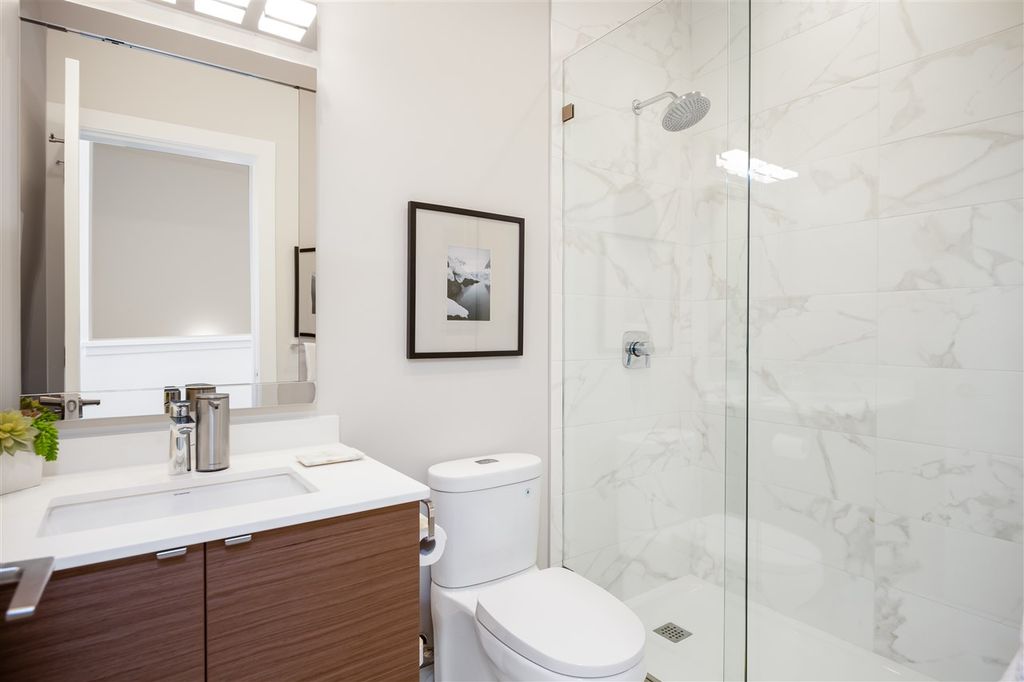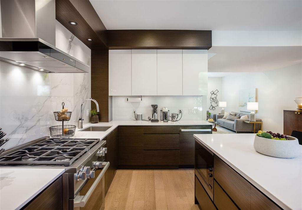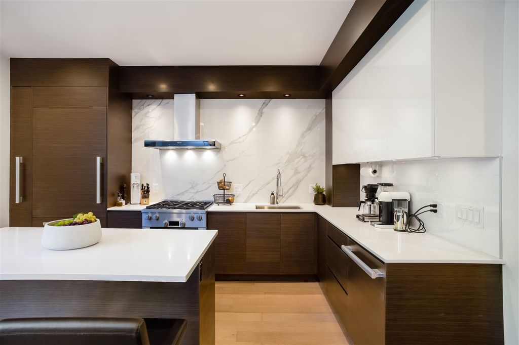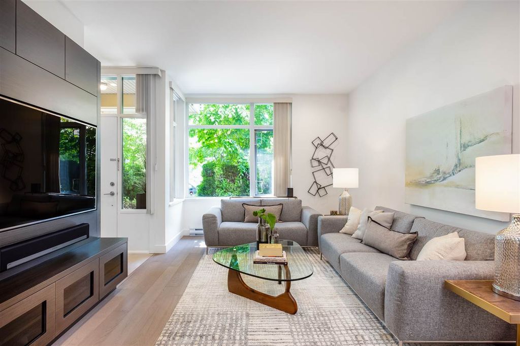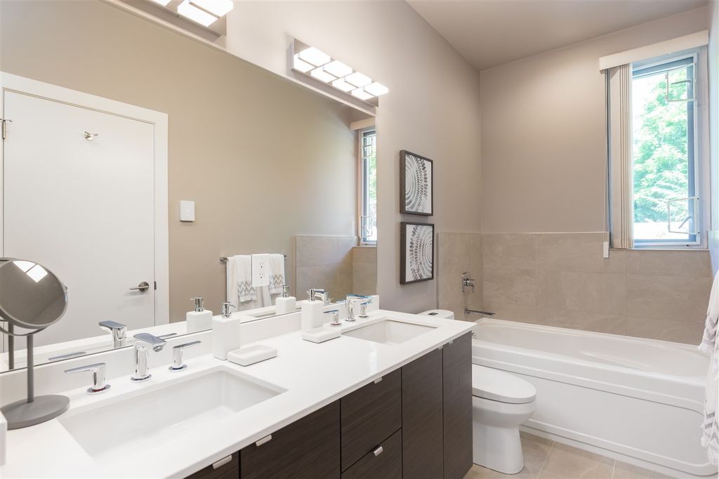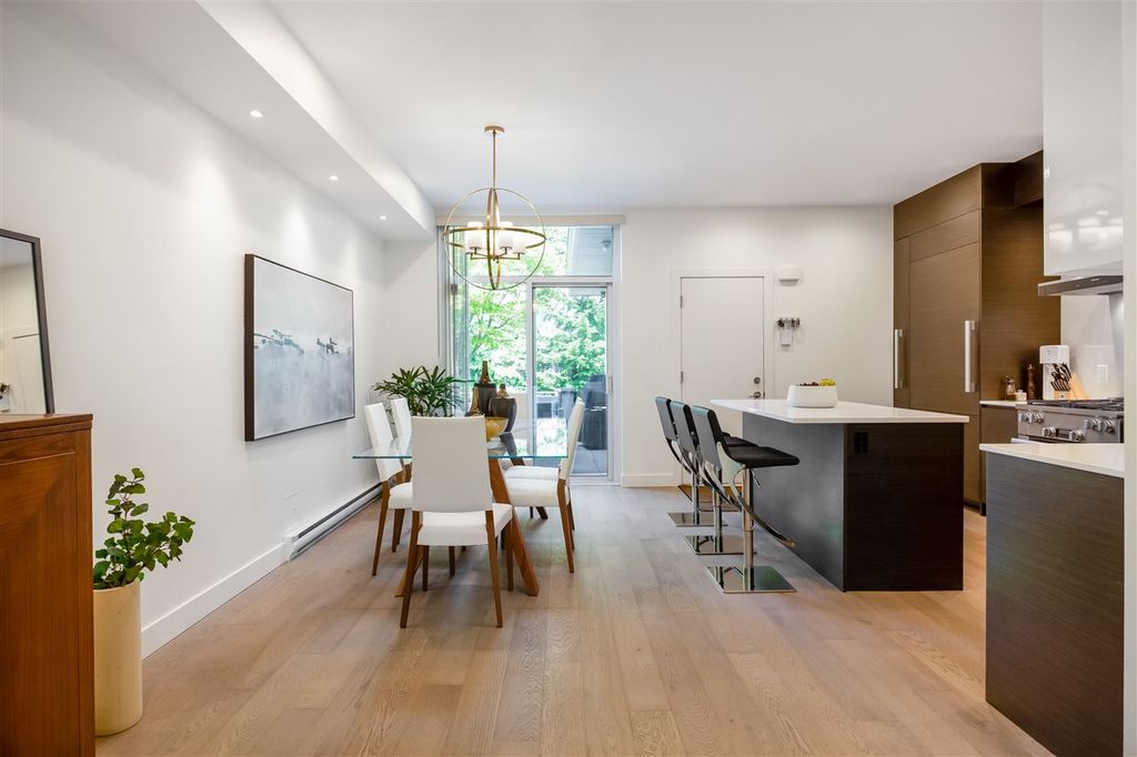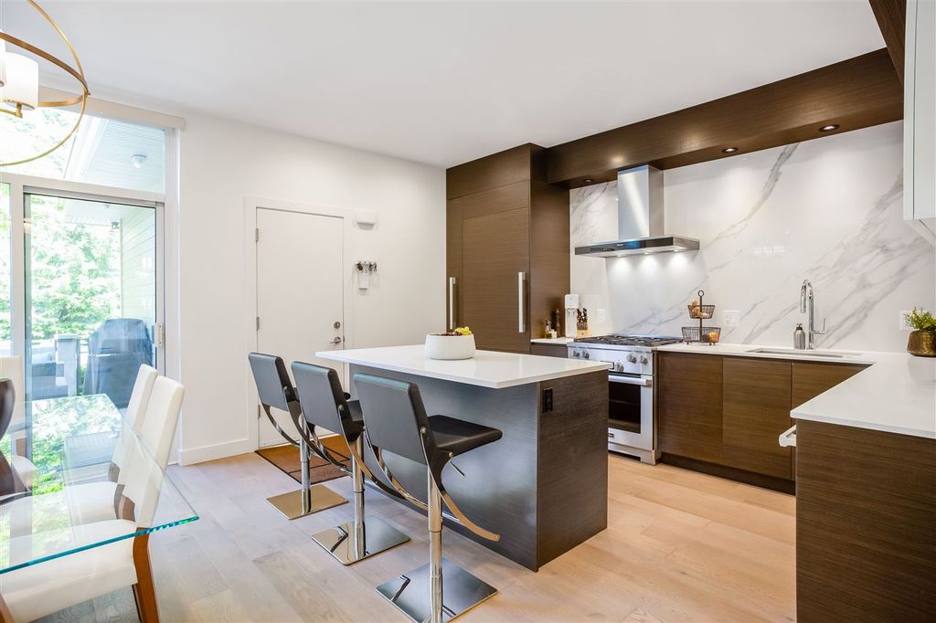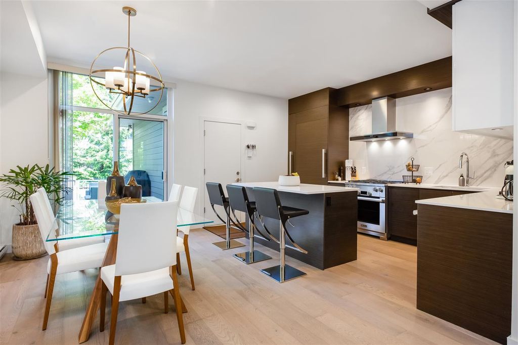 Welcome to this VERY RARE 3 bed + 3 bath townhome at Perspectives by Ledingham McAllister. Located in Burnaby's upscale Brentwood District; this immaculate & FULLY renovated home is located next to Concord Brentwood's new city centre + a short walk to shops at Amazing Brentwood. Skytrain, Schools, Wholefoods just minutes away. The home is bright & airy w/overheight ceilings & open layout perfect for entertaining! Renovated with the highest quality materials including Kentwood Engineered Oak flooring throughout, recessed & adjustable LED lighting, custom cabinets, Italian ceramic floor tiles, Hansgrohe fixtures, Quartz countertops, MIELE applainces including gas range, 36" fridge+++ Attached GARAGE included! + PATIOS too!