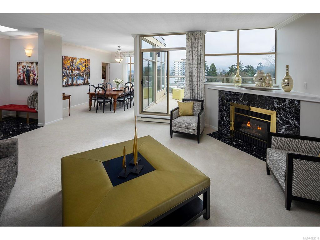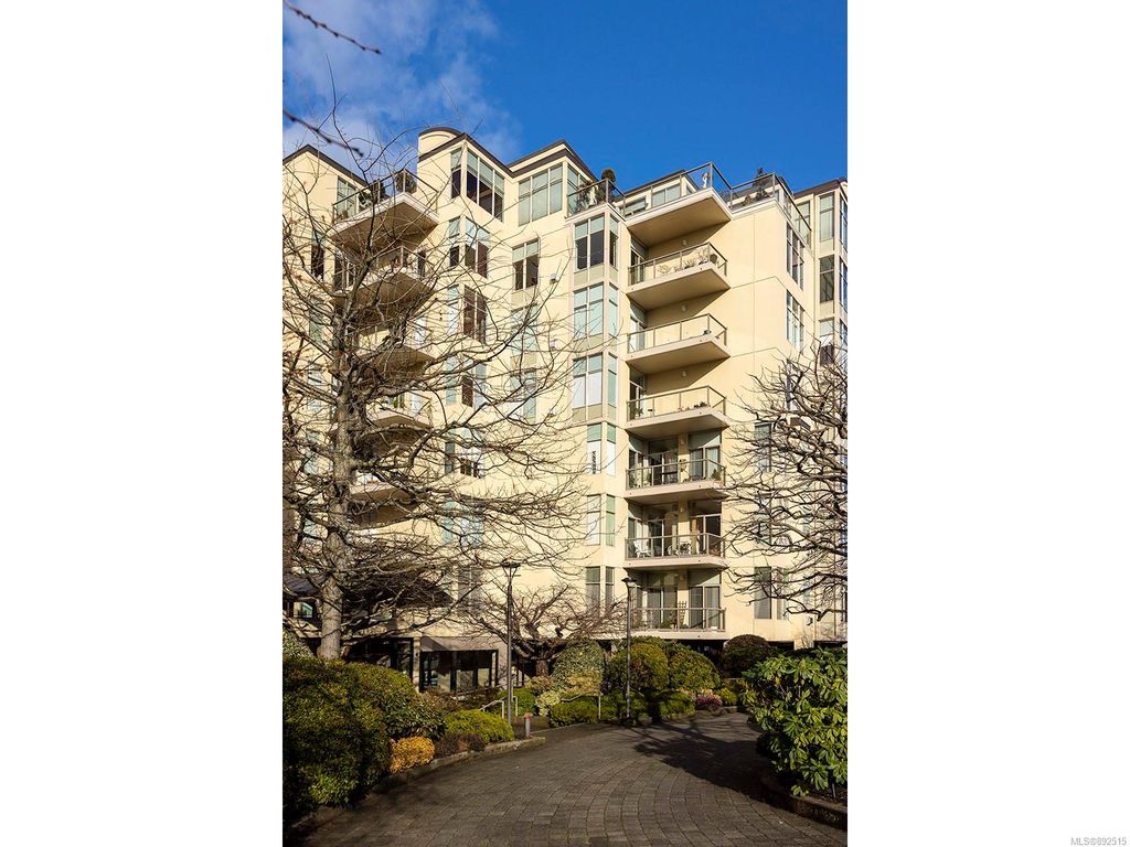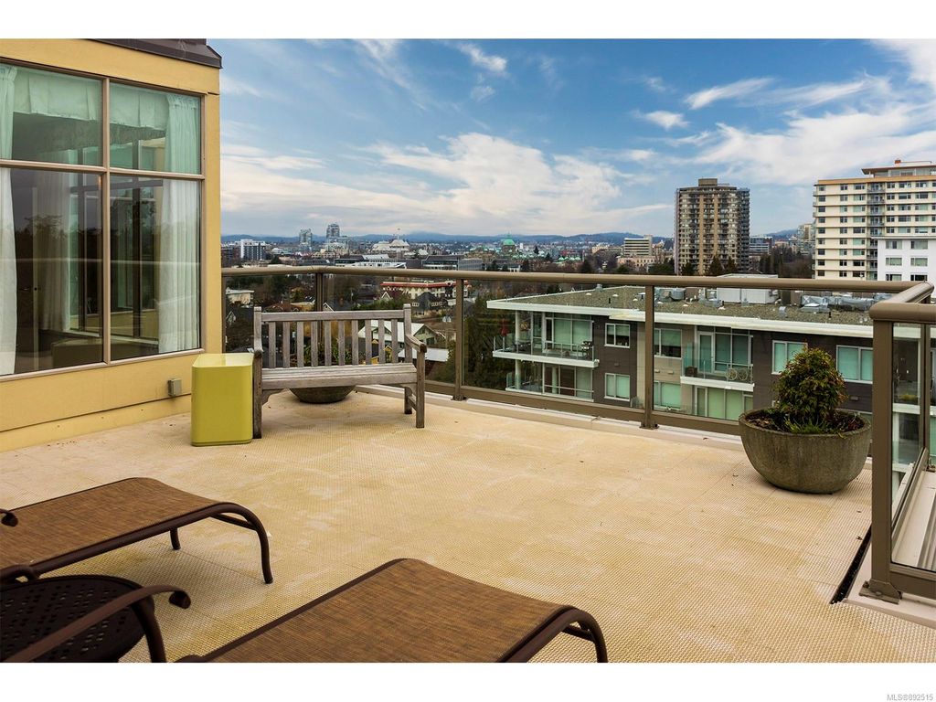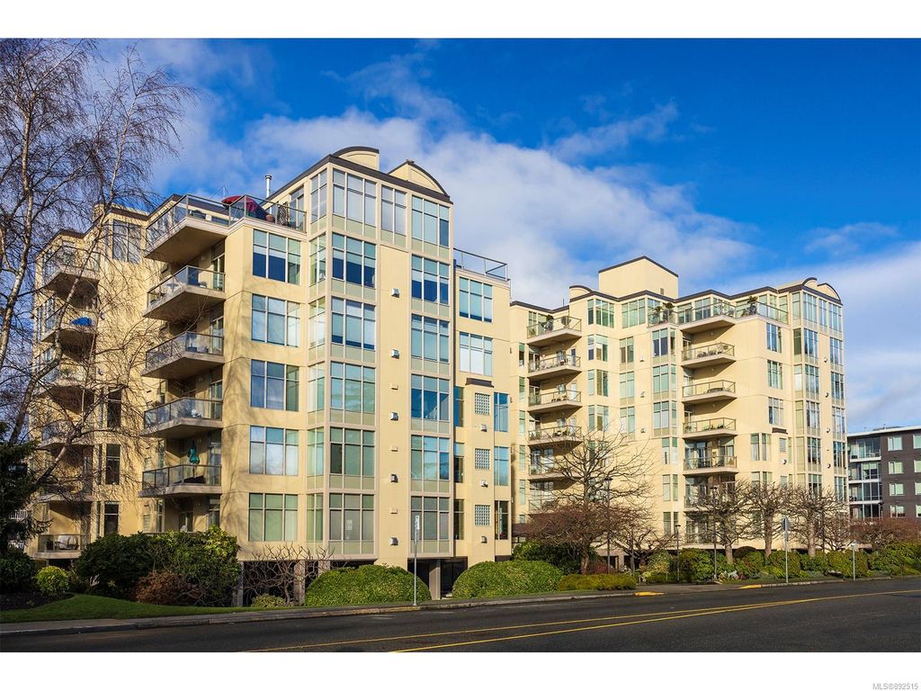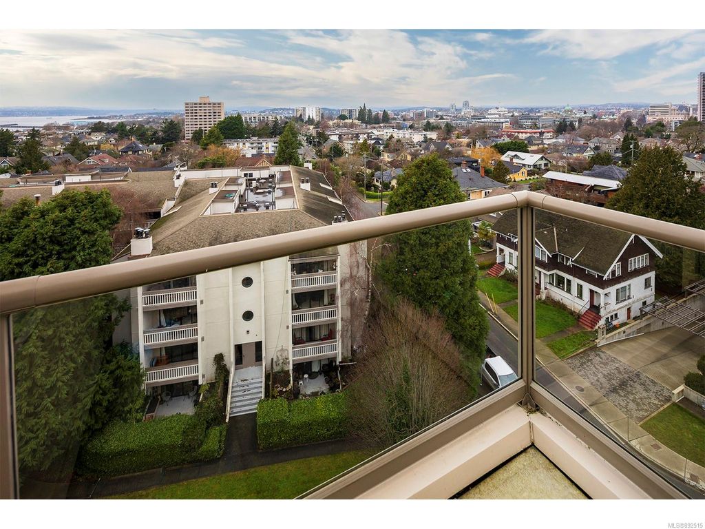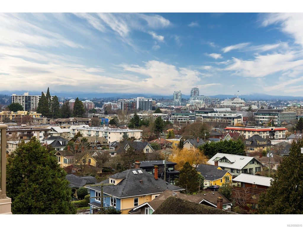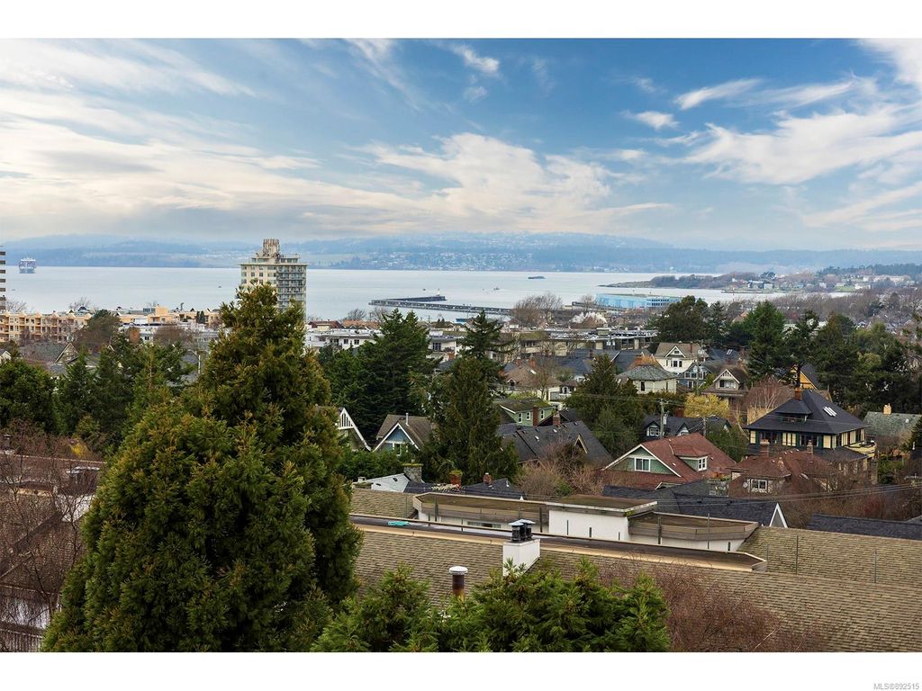Steps from the ocean & Beacon Hill Park! This 2049sqft penthouse offers a spacious, bright and open floorplan with 9' ceilings, oversized windows, new flooring & fresh paint...and gorgeous views that pan from the Olympic Mountains, to Haro Strait, to Beacon Hill Park, to the legislative buildings & around to Ogden Point; the night scape is a fascinating mix of city lights and exotic sunsets. Inside you will find two generously sized bedrooms, both w/updated ensuite bths, private balconies & plenty of closet space. The kitchen has been renovated with cherry cabinets, granite counters, engineered wood flooring, stainless steel appliances, and walk-in pantry. The living room w/cozy gas fireplace will accommodate large-scale furniture, and a huge office/den overlooks the park. 4 decks offer over 500 square feet, and all principal rooms have access to outside space. The building offers hobby/social rms, storage locker, and TWO secure underground parking stalls.....a very special offering!