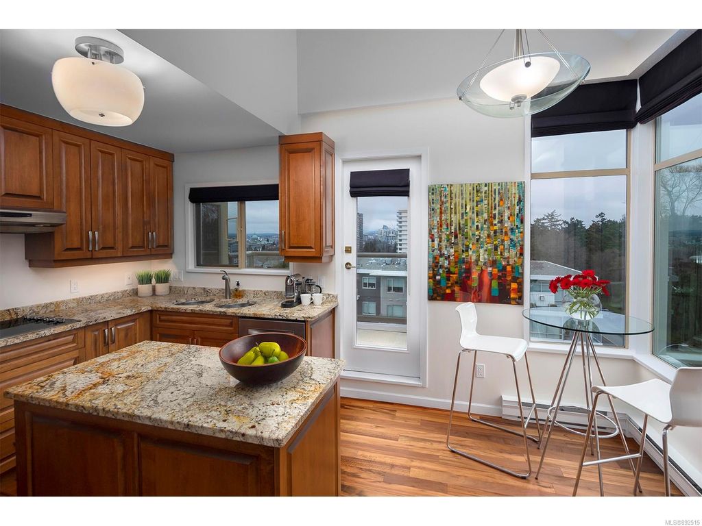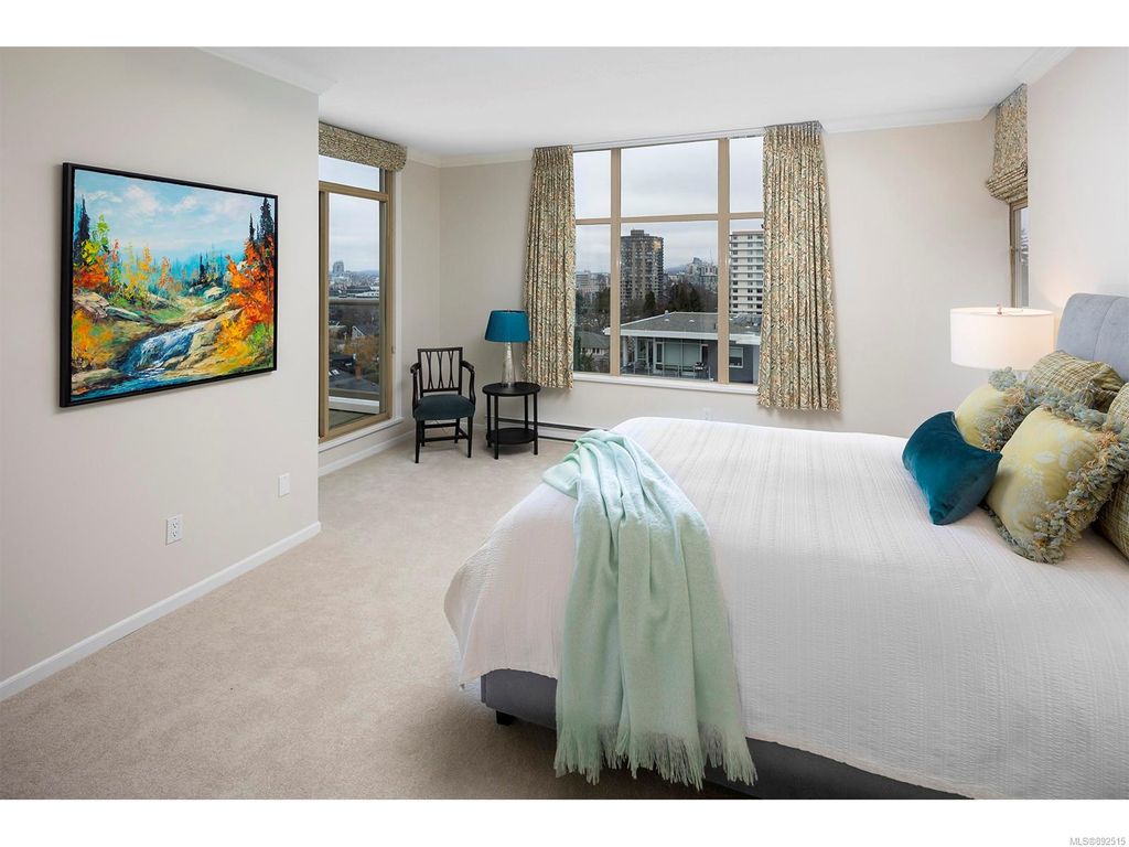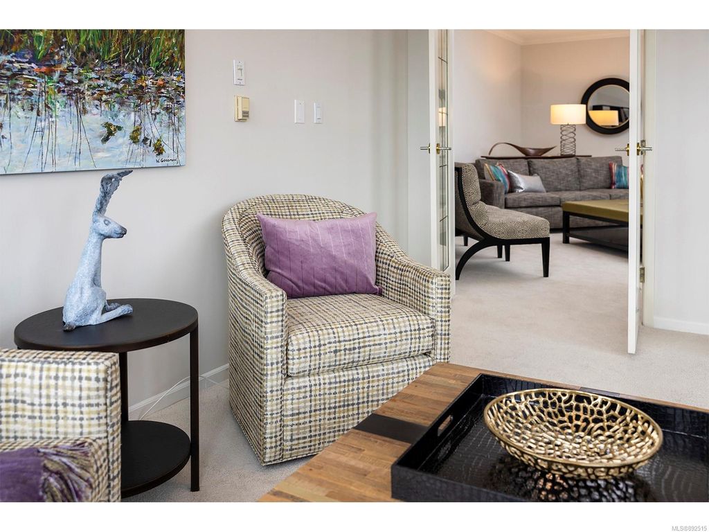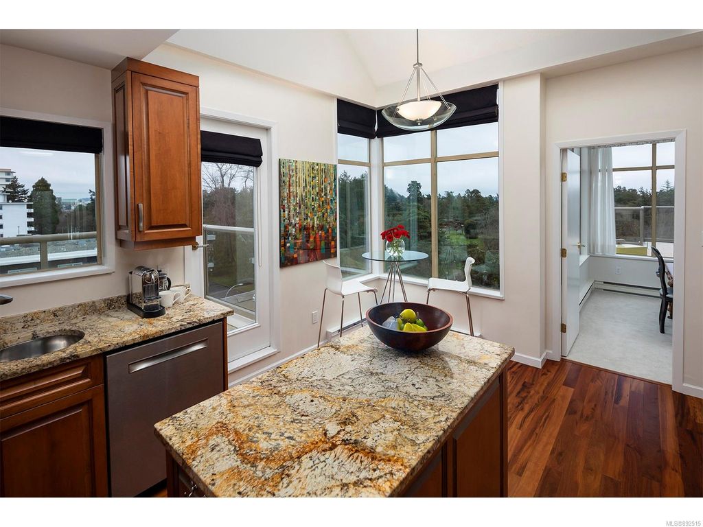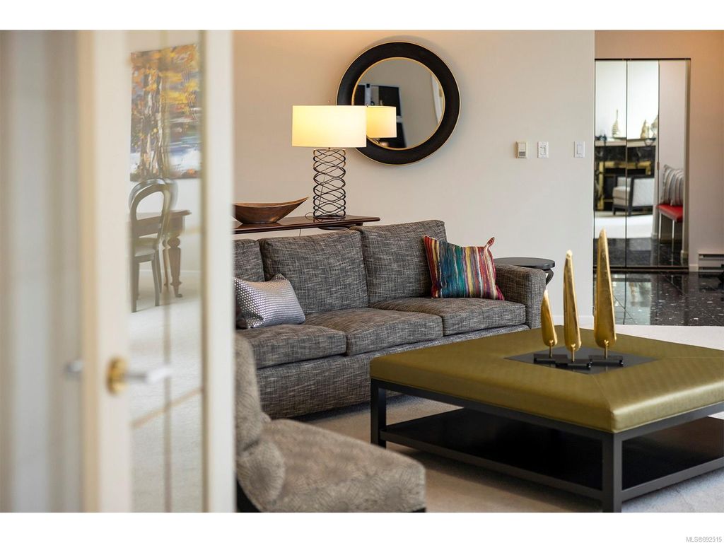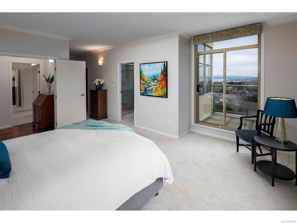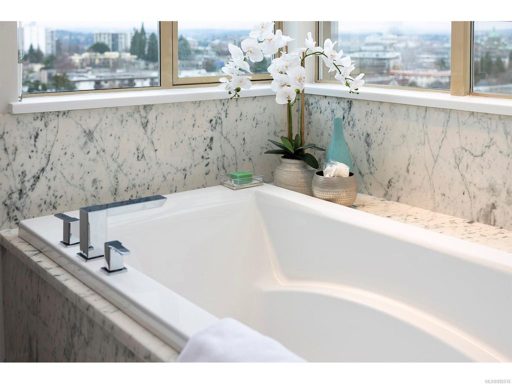 Steps from the ocean & Beacon Hill Park! This 2049sqft penthouse offers a spacious, bright and open floorplan with 9' ceilings, oversized windows, new flooring & fresh paint...and gorgeous views that pan from the Olympic Mountains, to Haro Strait, to Beacon Hill Park, to the legislative buildings & around to Ogden Point; the night scape is a fascinating mix of city lights and exotic sunsets. Inside you will find two generously sized bedrooms, both w/updated ensuite bths, private balconies & plenty of closet space. The kitchen has been renovated with cherry cabinets, granite counters, engineered wood flooring, stainless steel appliances, and walk-in pantry. The living room w/cozy gas fireplace will accommodate large-scale furniture, and a huge office/den overlooks the park. 4 decks offer over 500 square feet, and all principal rooms have access to outside space. The building offers hobby/social rms, storage locker, and TWO secure underground parking stalls.....a very special offering!