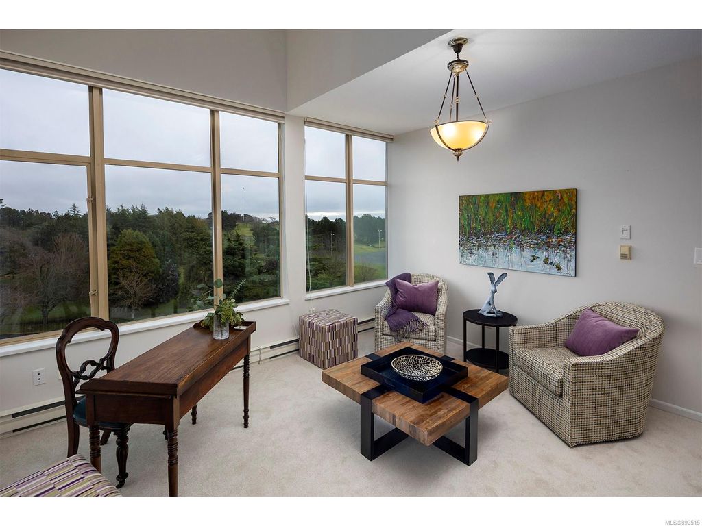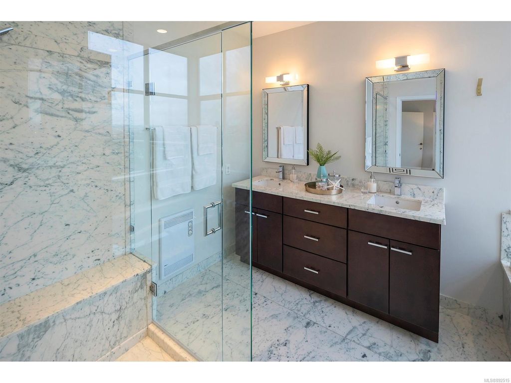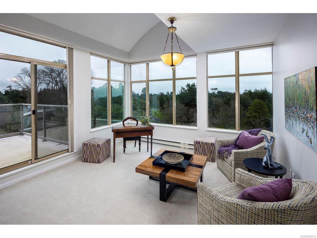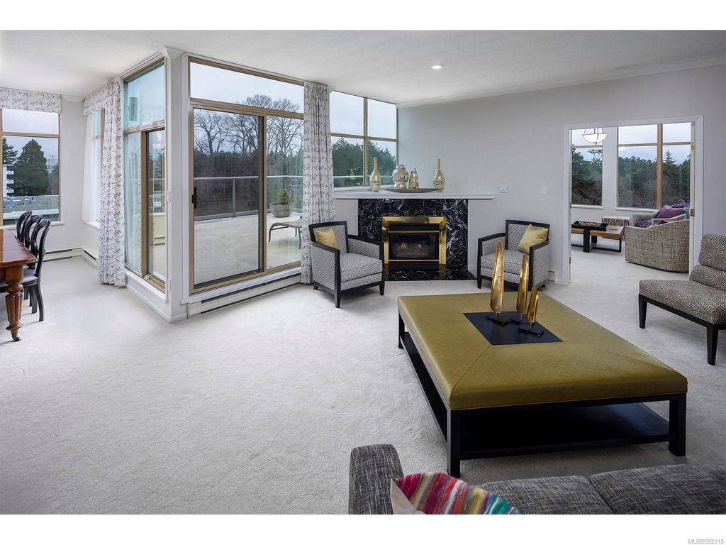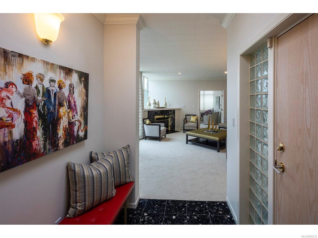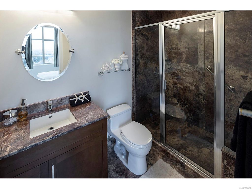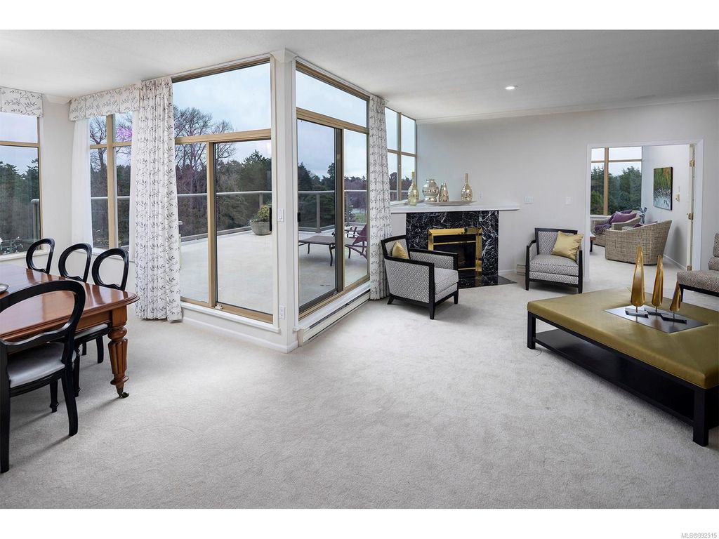 Steps from the ocean & Beacon Hill Park! This 2049sqft penthouse offers a spacious, bright and open floorplan with 9' ceilings, oversized windows, new flooring & fresh paint...and gorgeous views that pan from the Olympic Mountains, to Haro Strait, to Beacon Hill Park, to the legislative buildings & around to Ogden Point; the night scape is a fascinating mix of city lights and exotic sunsets. Inside you will find two generously sized bedrooms, both w/updated ensuite bths, private balconies & plenty of closet space. The kitchen has been renovated with cherry cabinets, granite counters, engineered wood flooring, stainless steel appliances, and walk-in pantry. The living room w/cozy gas fireplace will accommodate large-scale furniture, and a huge office/den overlooks the park. 4 decks offer over 500 square feet, and all principal rooms have access to outside space. The building offers hobby/social rms, storage locker, and TWO secure underground parking stalls.....a very special offering!