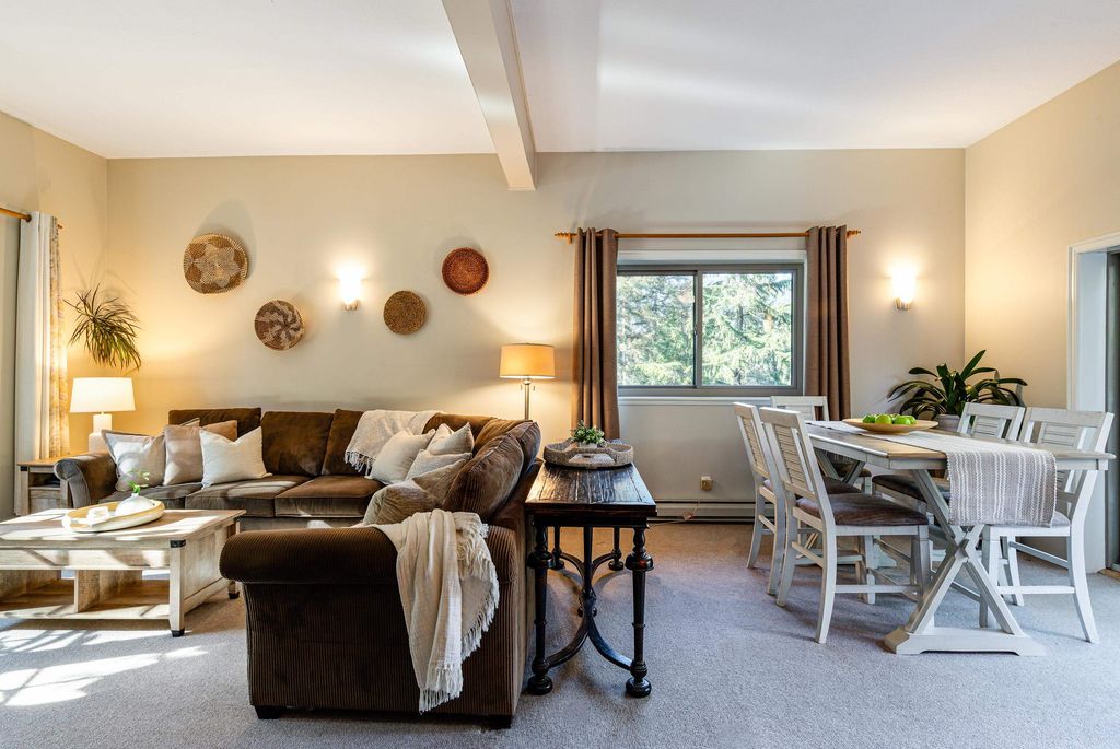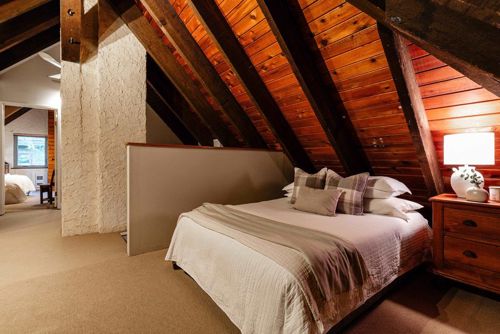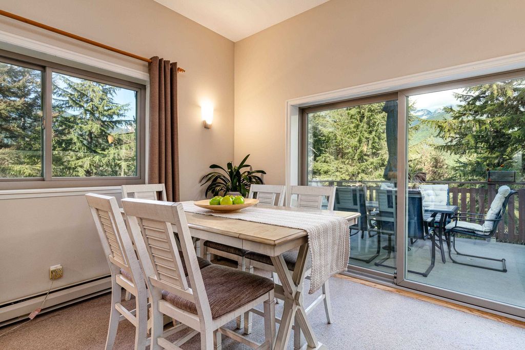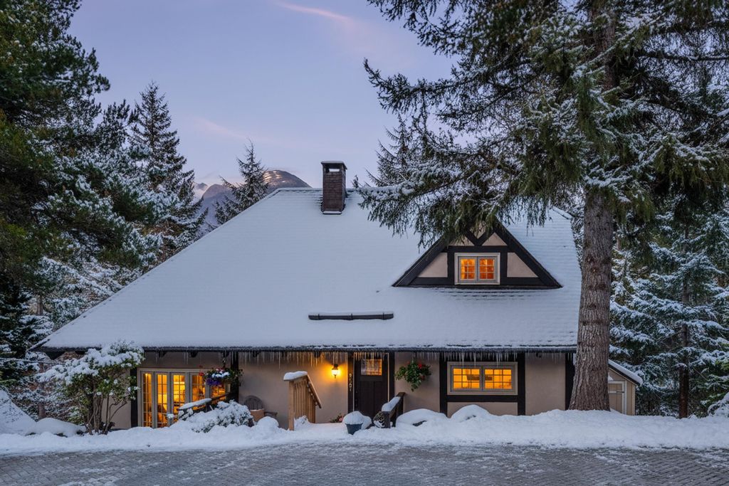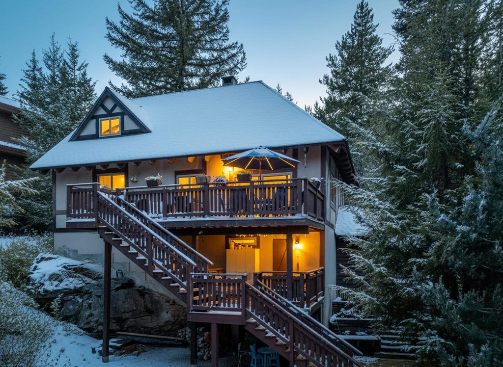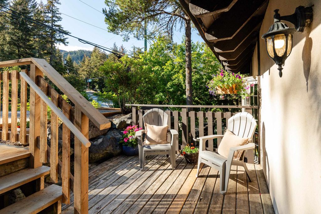 Welcoming alpine-inspired chalet combining modern living with timeless charm, thoughtfully cared for by one family for over 30 years. Features 3 beds, 2 baths, a large vaulted loft, and open layout. Airy kitchen with breakfast nook, sunken living room, and formal dining opening onto a spacious patio with mountain views. Versatile outdoor space with tiered gardens underground irrigation, and host of 2 family weddings. Includes a 2-bed + den guest suite and sauna. Parking for 6, steps from bus route. Renovated throughout. A perfect alpine retreat or full-time home.