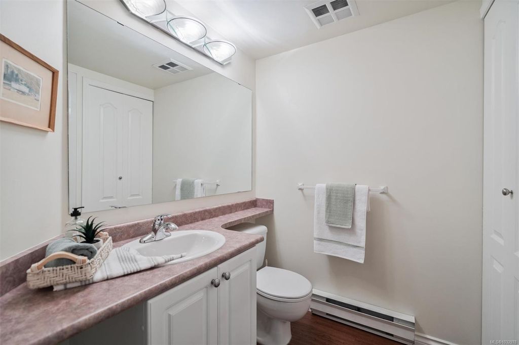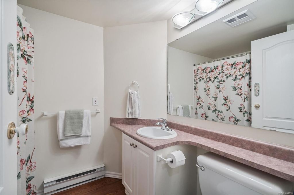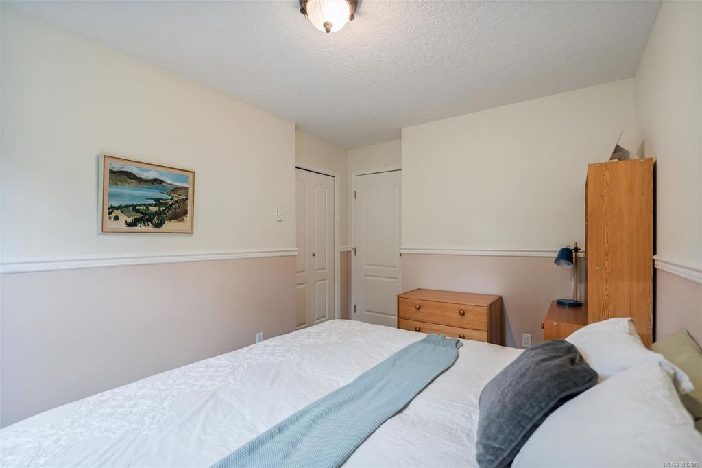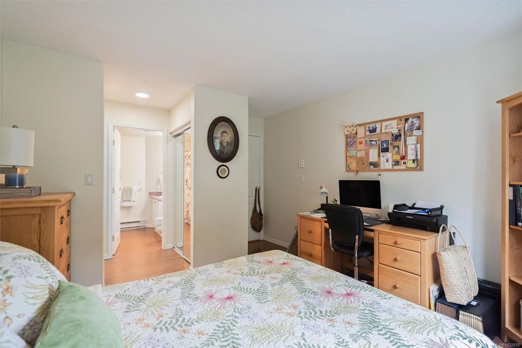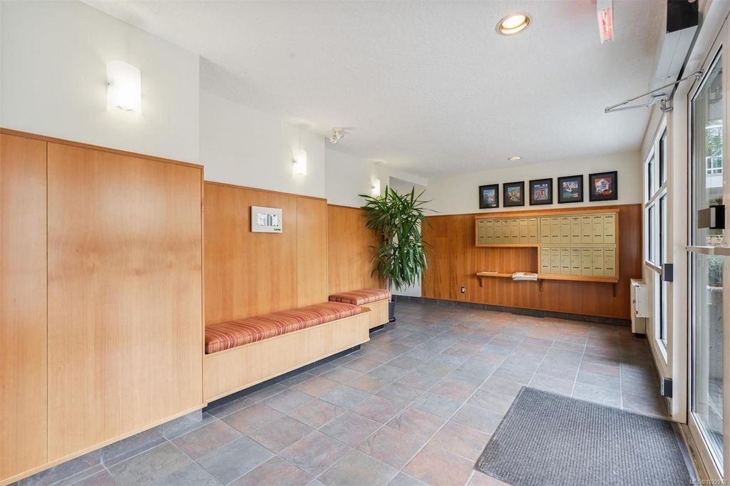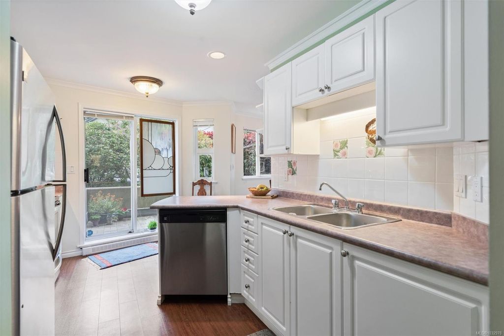 This bright ground-floor corner condo is located a short walk from Cook Street Village, Beacon Hill Park, and the oceanfront along Dallas Road. The interior features an open-plan living and dining area centred by a cozy fireplace, which flows seamlessly into a spacious kitchen featuring white cabinetry and stainless steel appliances. As a corner unit, the space is framed by lush greenery, providing a beautiful backdrop for the covered patio that receives direct morning sun. The primary bedroom includes a walkthrough closet leading to a private 4-piece ensuite, paired with a large second bedroom that is filled with natural light. This home offers a quiet residential feel while remaining close to all city amenities and everything you need.