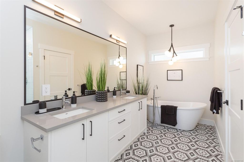Custom built primary bedroom on the main floor home on a corner lot with amazing views... Welcome to 1403 Flint Ave! After serving as a showcase home, this beauty is finally on the market. Over 4100 finished sq ft with 6 beds, 5 baths, den, media room, rec room, and a one bed legal suite mortgage helper, this home has it all. The main home features a primary bedroom with 5 piece ensuite and walk in closet on the main floor. The open concept kitchen/living/dining opens to an expansive deck with gas BBQ outlet purpose built to take in the panoramic ocean and mountain views. The lower level has two beds, a full bath, and rec room for the main, and a self contained one bed legal suite with separate hydro and laundry. Upstairs is two beds, a full bath, and loft media space. Year round efficient temp control with a multi head ductless heat pump and ducted mini split system in the main home. Natural gas fireplace. Quartz counters. Irrigation. Plus GST