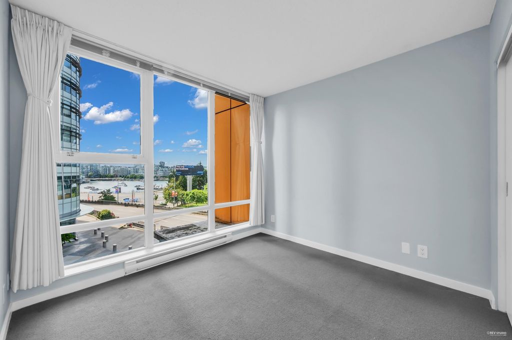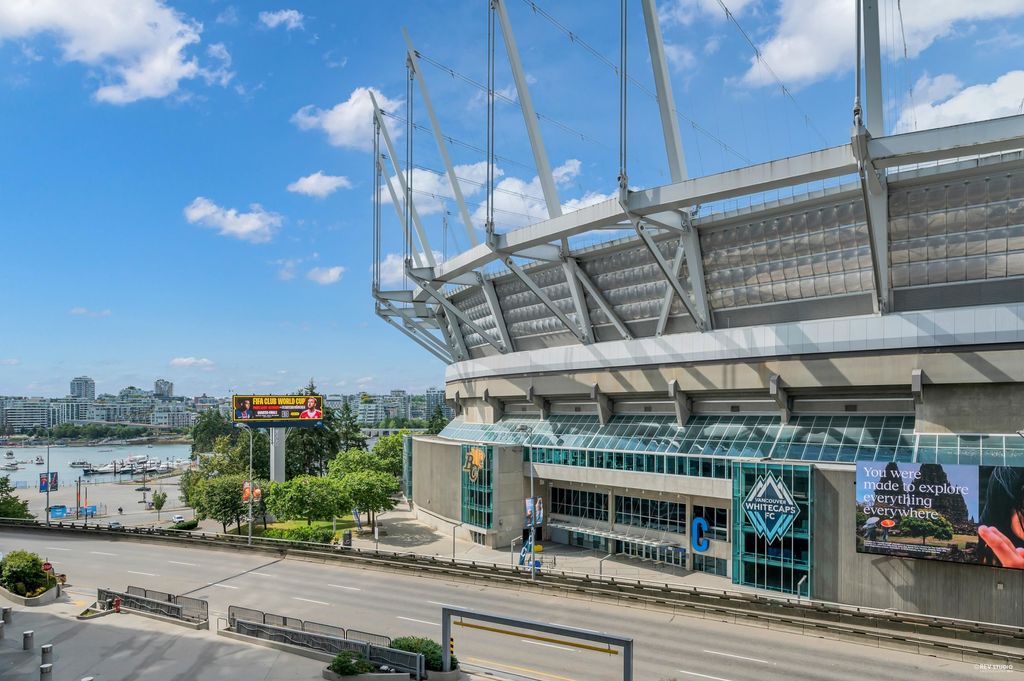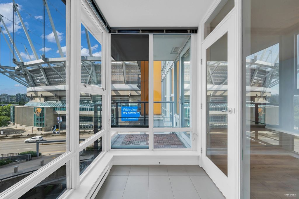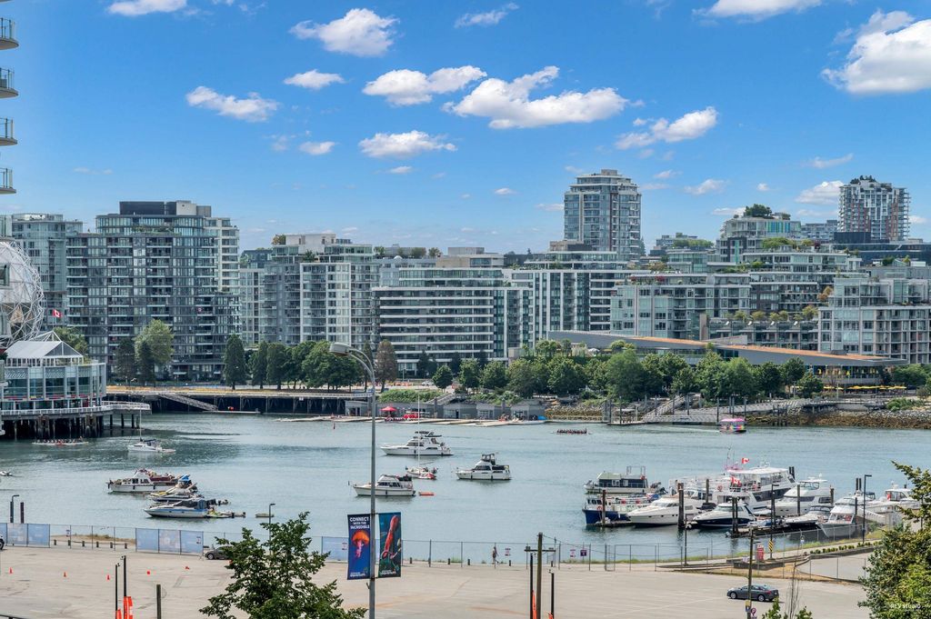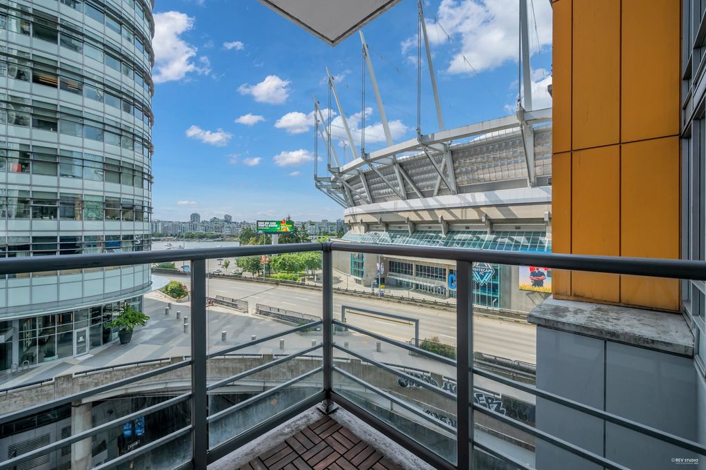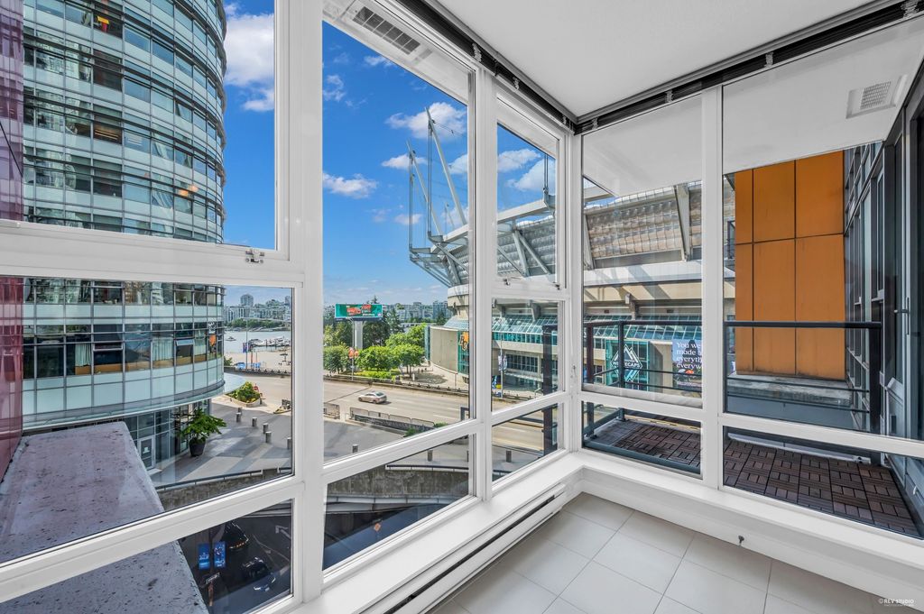 Southeast-facing one-bedroom unit with beautiful water views, bright den/solarium, and in-suite storage. Efficient layout with no wasted space, spacious living/dining, custom closet, and upgraded German flooring. Recent updates include 2025 fridge, new dishwasher, Samsung washer/dryer with 4-year warranty, and digital thermostat. Strata-approved A/C installation ($8,000 value). Resort-style amenities: 80’ indoor pool, sauna, steam room, hot tub, gym, bike room, media room, and lounge with kitchen. Steps to SkyTrain, BC Place, Rogers Arena, Costco & more. Includes 1 parking and large locker. Pets and rentals allowed. Quick Possession, Welcome to Open House: Aug.16 & 17 (Sat & Sun) 2–4PM.