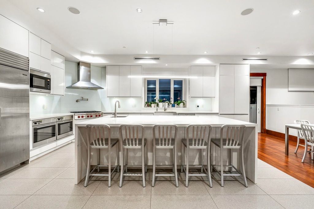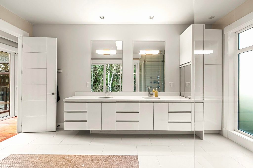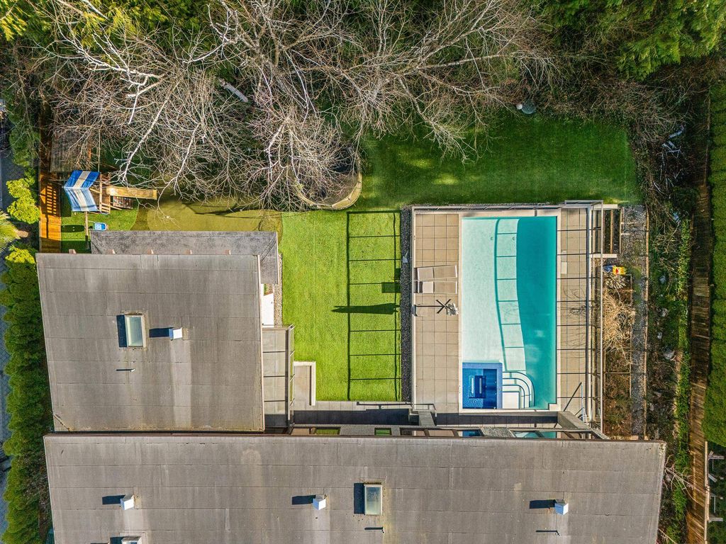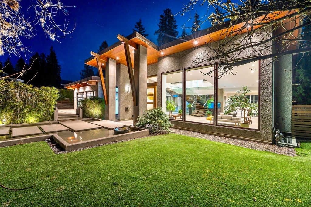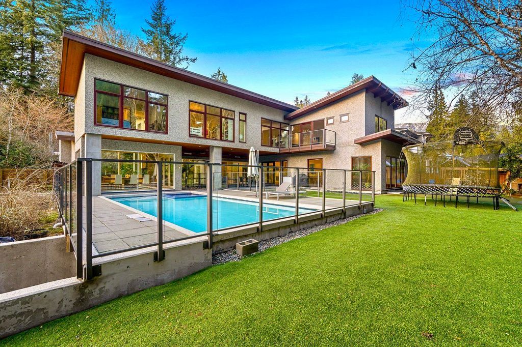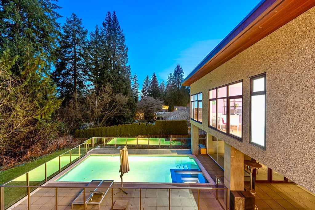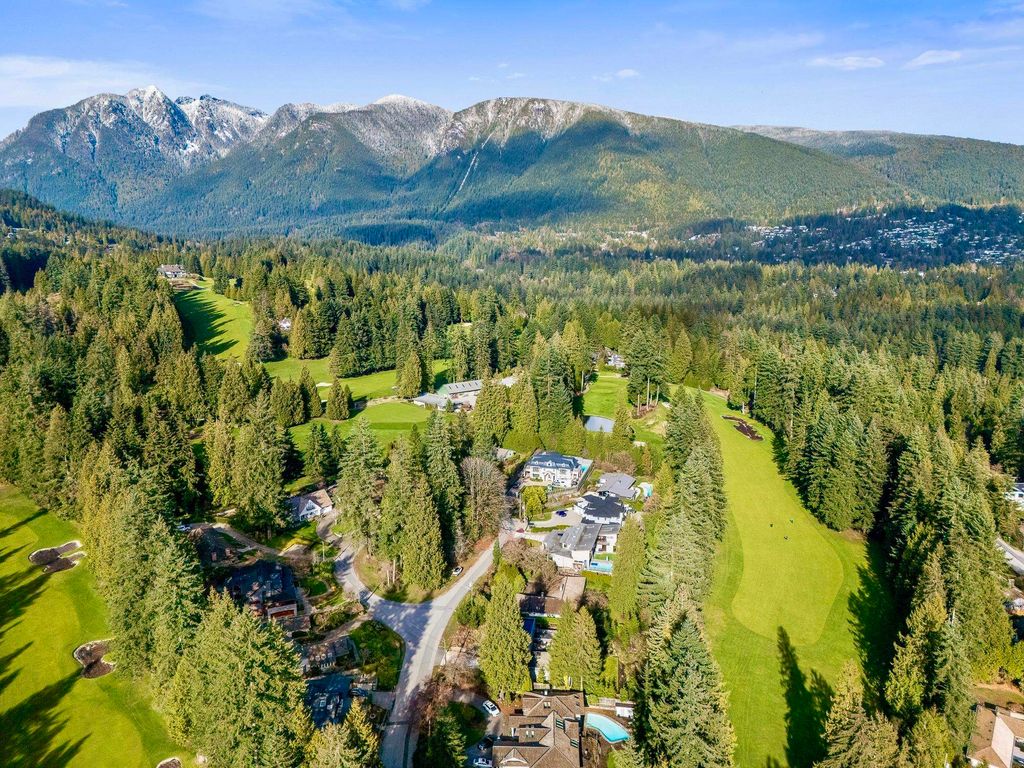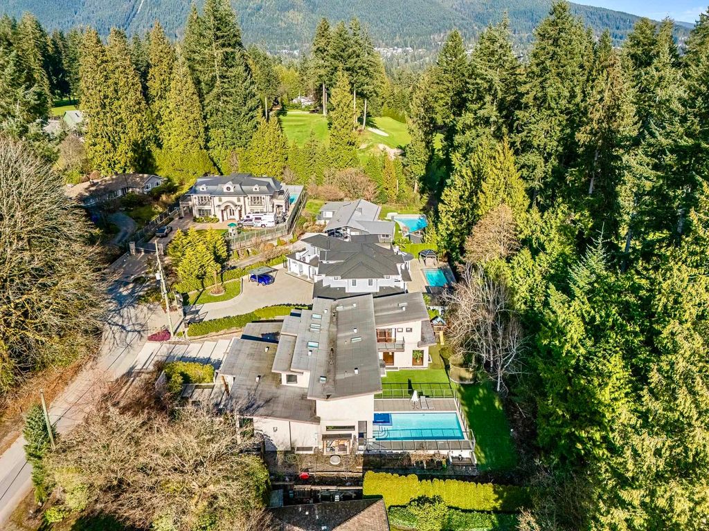 Spectacular contemporary estate on the 10th fairway of Capilano Golf & Country Club, offering exceptional scale and resort-style living. Designed by Rommel Designs, this 7,419 sq.ft. residence spans three levels on a private 13,504 sq.ft. lot in the Lower British Properties. Features include a dramatic atrium living room with soaring ceilings, formal dining, and a sleek European kitchen with premium appliances, large island, and adjoining family room. Seamless indoor-outdoor living with covered heated terraces, BBQ centre, pool, and spa. Upper level offers a luxurious primary suite plus 3 ensuited bedrooms. Lower level with rec room, 3 bedrooms, and flexible space. Prime location near top schools, golf, and Park Royal.