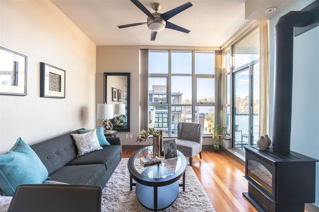Look no further! This rarely available penthouse corner unit has quiet-facing unobstructed North-shore Mountain views! High 10 ft ceilings and floor-to-ceiling windows, BONUS 2 skylights in the unit for extra natural sunlight! Functional floorplan, and the perfect size for a one bedroom one bathroom - great for first-time home buyers and even down-sizers. Comes with 1 parking and 1 storage locker. RENTALS ALLOWED min 3 months, PET FRIENDLY max 3 cats/2 dogs over 25 pd/3 dogs under 25 pd **OPEN HOUSES CANCELLED! THANK YOU FOR YOUR INTEREST**