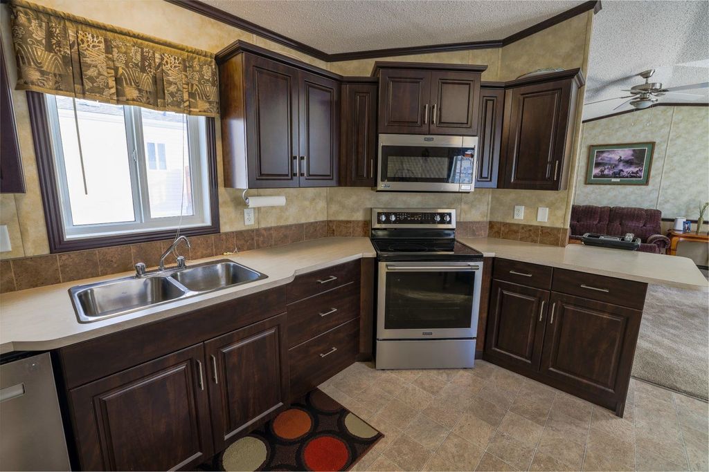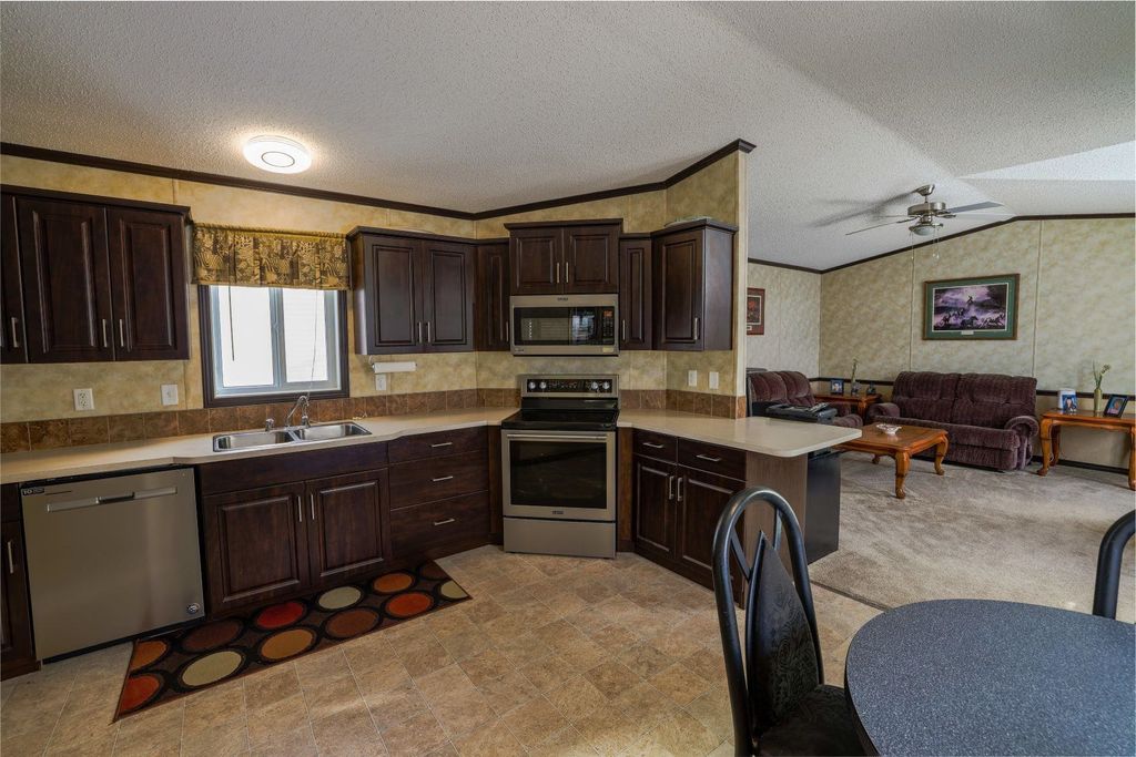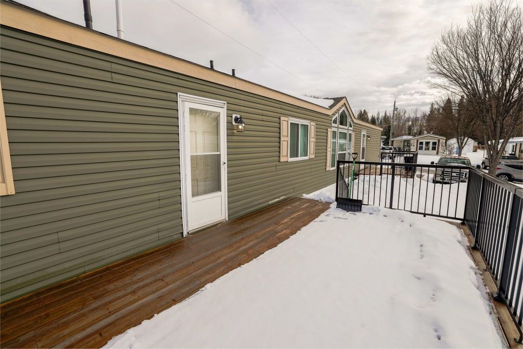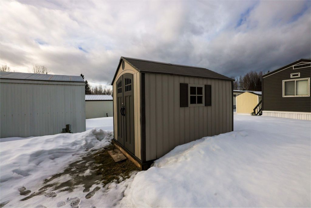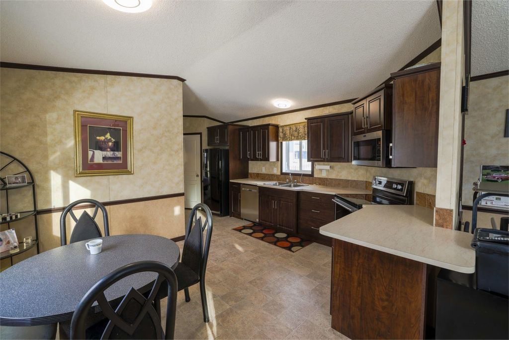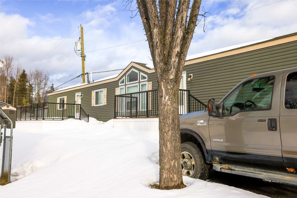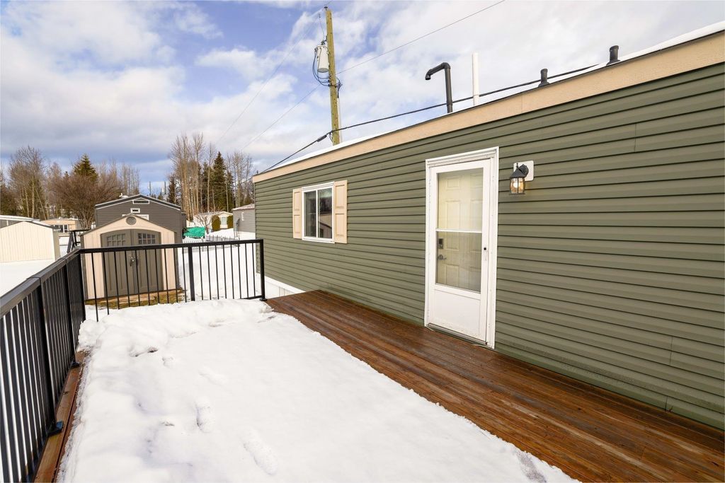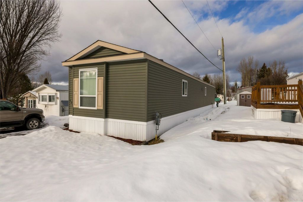 Newer 3 Bedroom, 2 bath mobile (16' X 76') in desirable mobile home park. Quality finishes, vaulted ceilings, cabinets with crown mouldings, closet pantry, black appliances, ceramic tile backsplashes and two decks for outside enjoyment. Newer stainless appliances in 2021. Bathrooms have linen towers and the master bedroom ensuite has a soaker tub. Two bedrooms have a walk-in closet and the home has residential style doors. Landscaped with mature trees and walking distance to the Aberdeen Golf Course. Shed is included and recreation storage is available. 10 minutes to the Spruceland Shopping Center or to the Hart Shopping conveniences. Pad rent includes garbage pickup and snow removal.