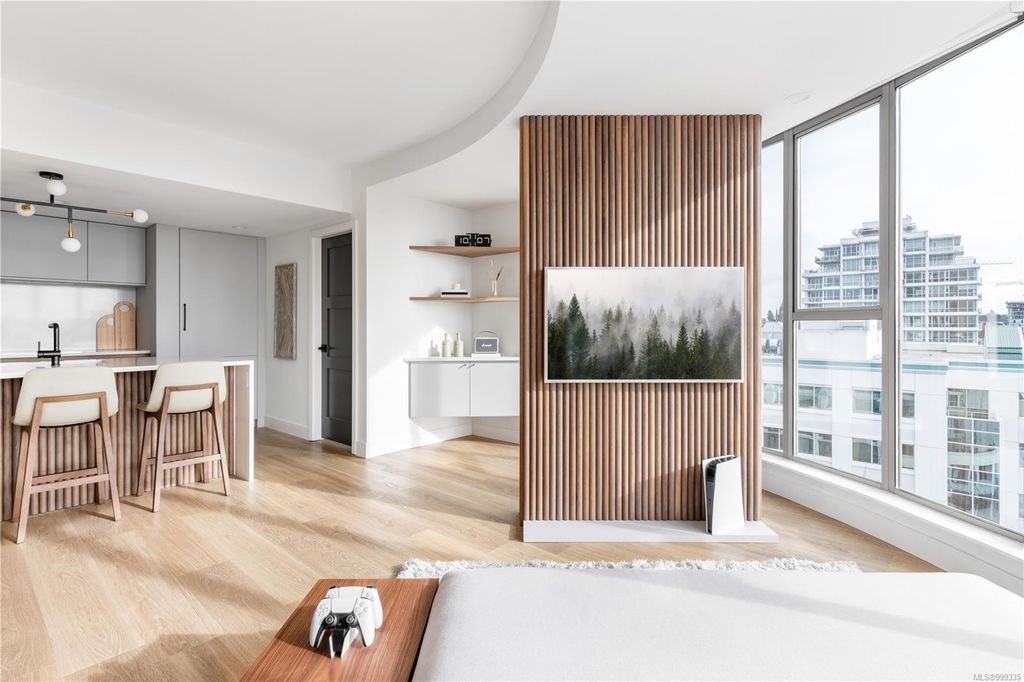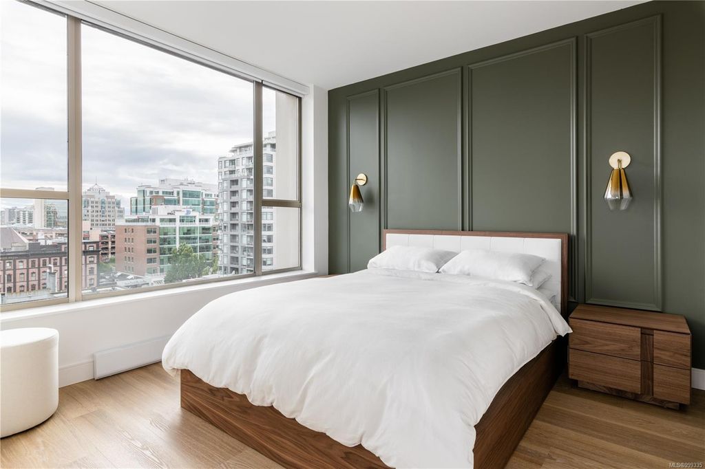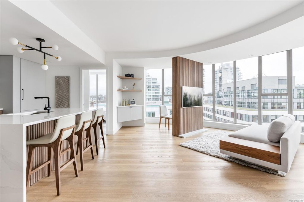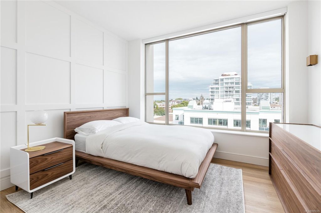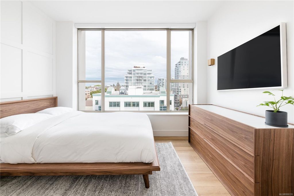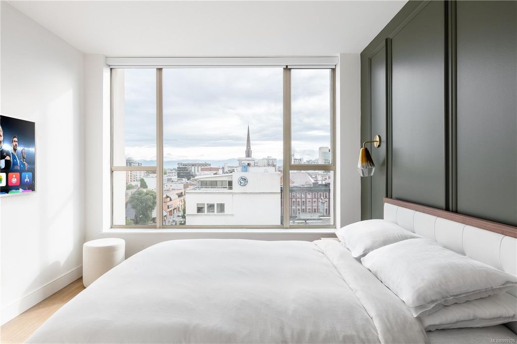 One of the more superior renovated condos in Downtown Victoria, this is Unit 901; a true, top-of-the-line finish, completely remodelled and tech-updated corner unit in the iconic Art Deco Juliet building. The southeast-facing 9th-floor condo boasts luxurious finishes, including Buster+Punch hardware, a Thomas+Birch custom kitchen w/ wood millwork, quartz countertops and backsplash, premium S/S appliances, motorized curtains, and a fully tiled 4-piece bath. A one-of-a-kind rounded wall of floor-to-ceiling glass provides stunning panoramic city views, extending to the Olympic Mountains and the Dallas Rd waterfront. The exceptional layout features two well-separated bedrooms, a custom feature wall with office stand, bar, and in-unit laundry. Building features inc Rooftop w/ 360-degree views and BBQs, unrestricted rentals, and pet friendly. This condo is ideal as a great investment or a perfect home, steps away from shopping, dining, and all Downtown Victoria offers.